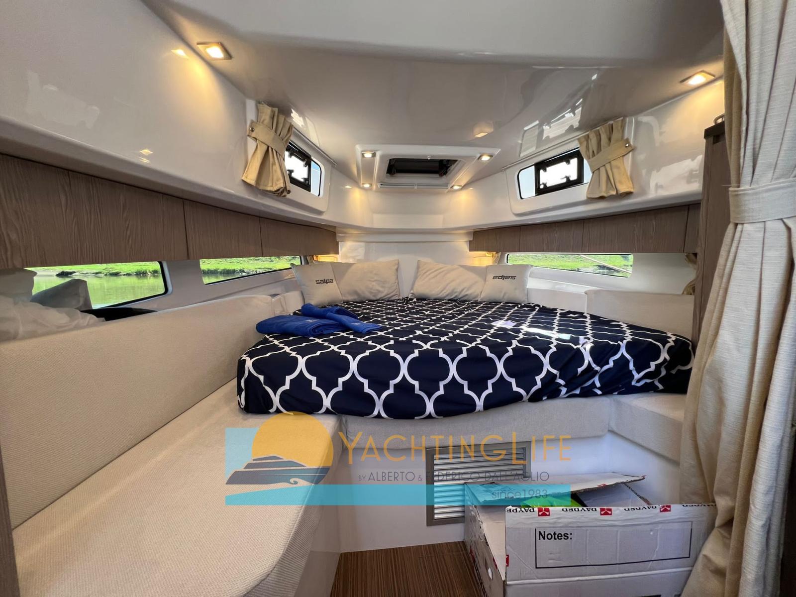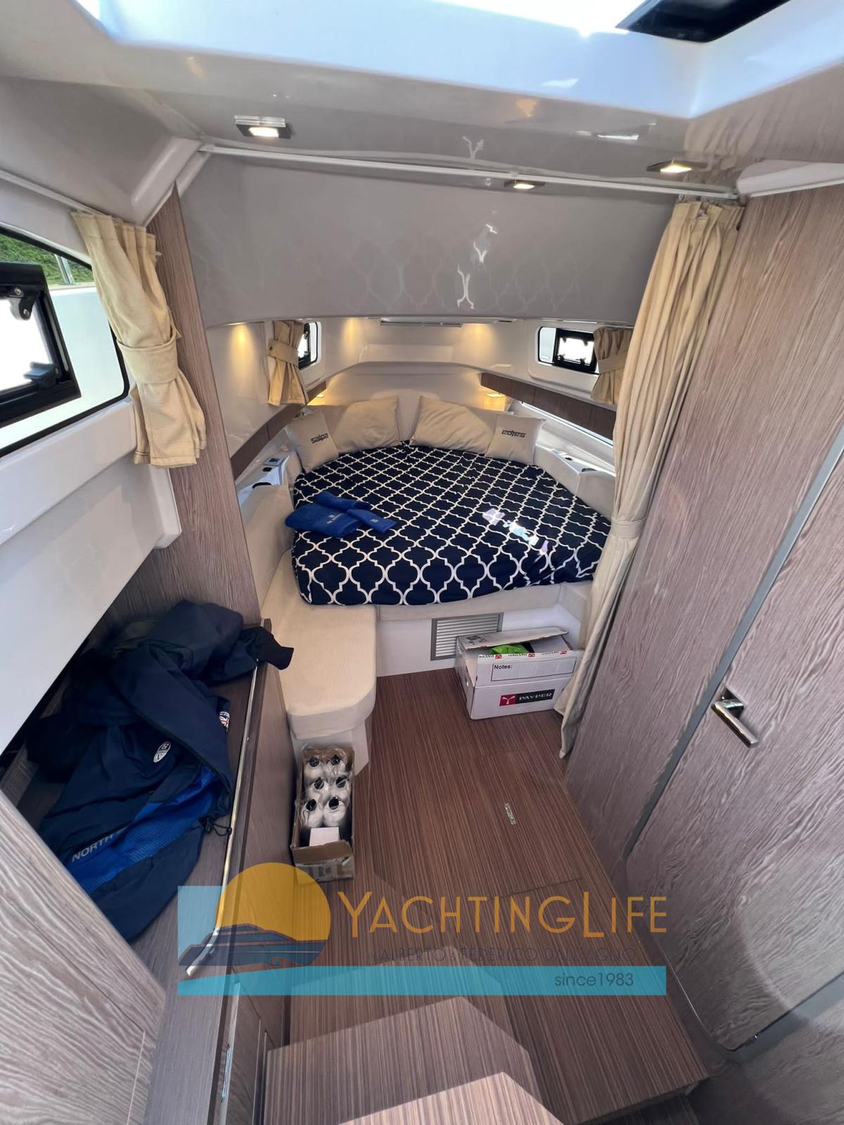 Eau sous pression, 2 Douche de cockpit, Flaps électriques (Zip Wake), Indicateurs de flaps, Lavabo dans le cockpit, Pompe de cale automatique, Cockpit en teck (sintetico), Prise de quai, Guindeau électrique, 2 Echelle de bain, table de cockpit (elettrico), Corne.