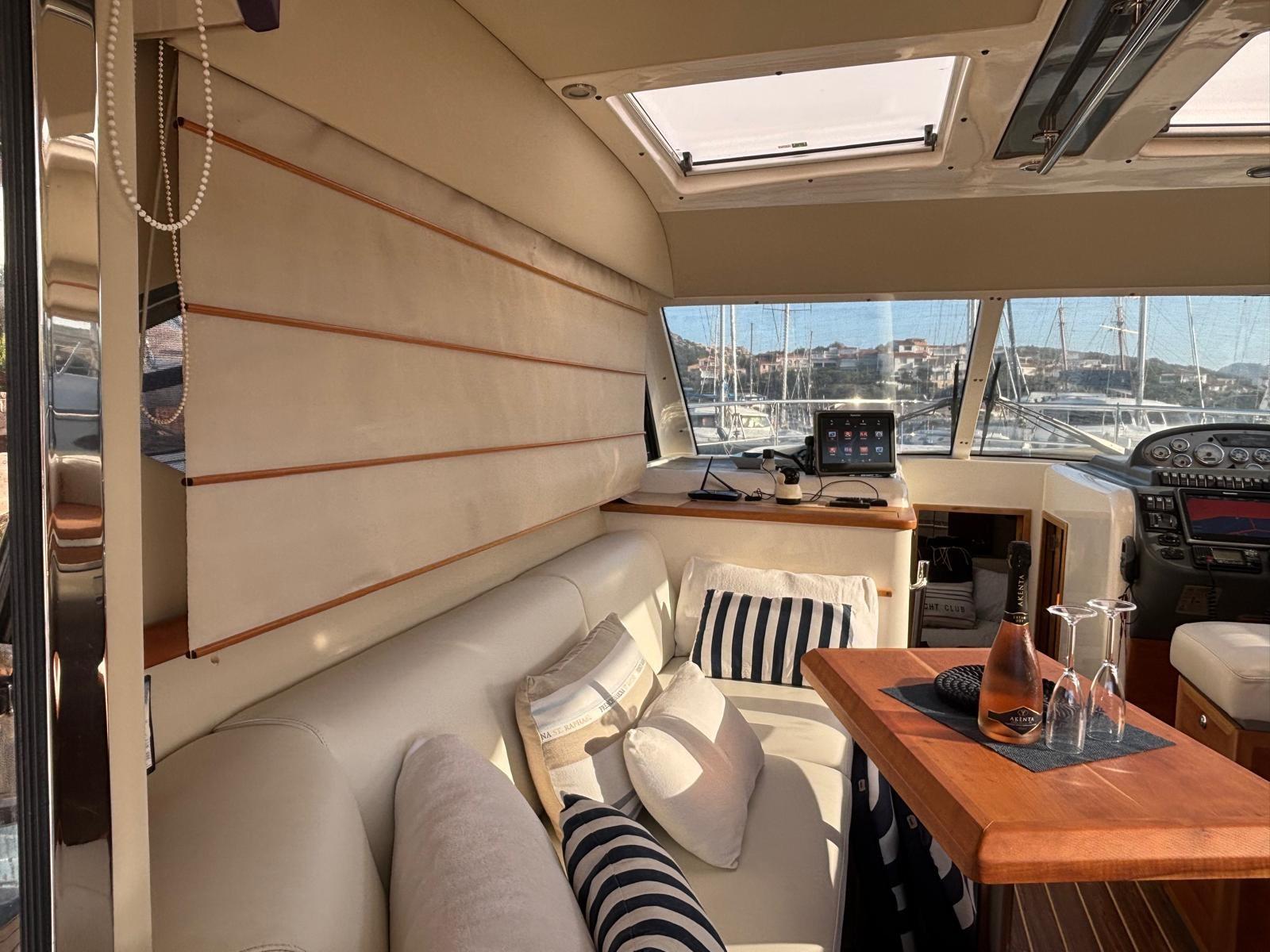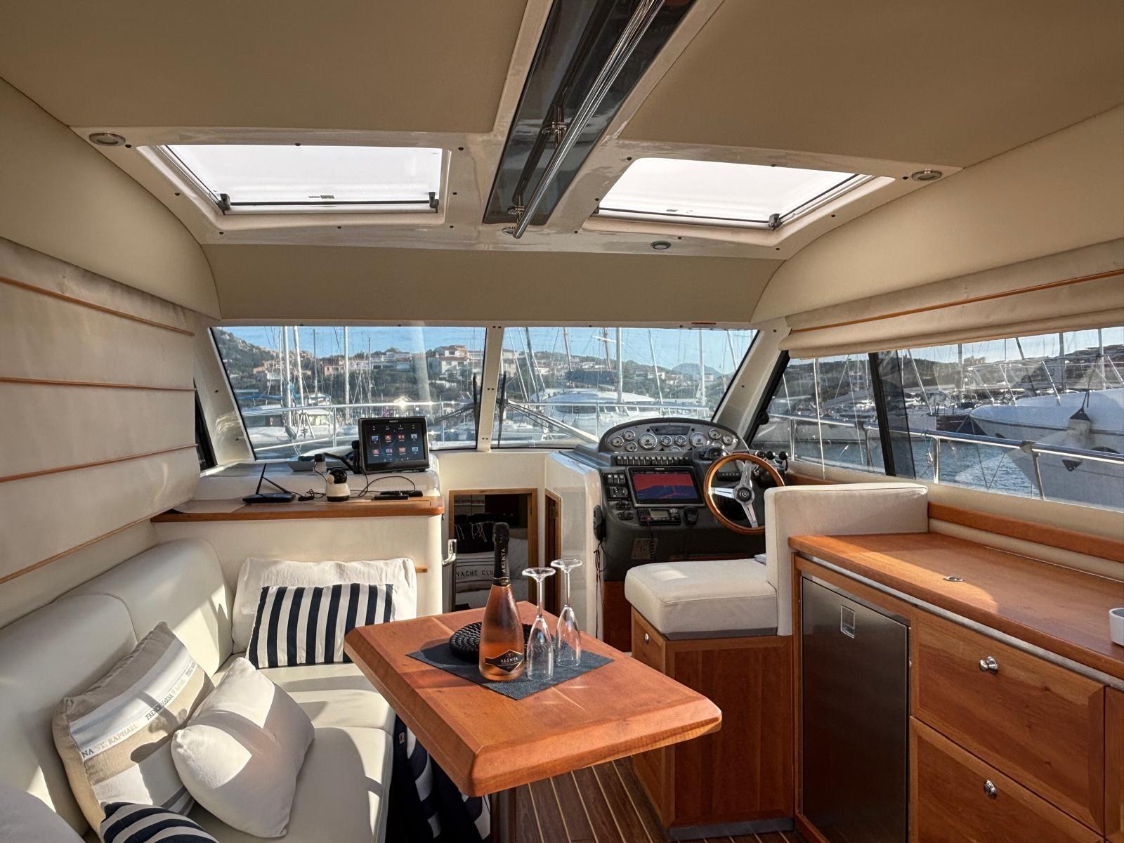 Compas (Rotchie), Commande électrique, Ordinateur fixe de bord (Volvo Penta), 2 Tachymètre (Volvo Penta), Compteur de chaîne (Muir), Compteur d'heures, Sondeur pêche (Raymarine), GPS (Raymarine), Cartes et guides, Pilote automatique (Raymarine), Plotter GPS (Raymarine), Panneau de commande, Radio VHF (Icom M423), Siège copilote.