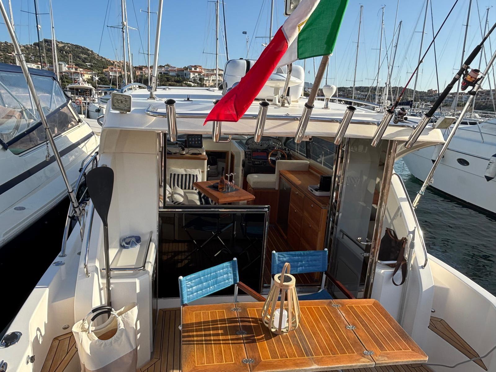 Alarme moteur, Alarme de pompe de cale, Alternateur, Eau sous pression, Câble d’alimentation à quai, Douche de cockpit, Phares fixes arrière, Flaps électriques, Hard top, Extincteur(s) fixe(s), Éclairage de courtoisie, Spots sous-marins, Défenses, Passerelle (Elettroidraulica a scomparsa), Plateforme arrière, Pompe de cale automatique, Pompe de cale manuelle, Porte latérale, Cockpit ouvert, Cockpit en teck, Prise de quai, Connexion eau sous pression à quai, Guindeau électrique (Quick), Echelle de bain, table de cockpit (Allungabile), Table pliante de salon (Trasformabile), 2 Toit ouvrant dans le salon, Corne, Winch électrique avant.