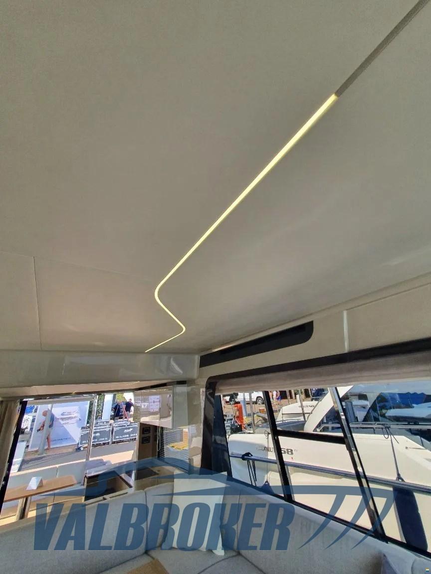 Volant en cuir avec rayons en acier sur le pont principal et volant en cuir hydrofuge avec rayons en acier sur le flybridge, marches en teck massif, canapé en mousse écru en forme de U en forme de U à drainage rapide avec housse gris nacré, table en teck à hauteur réglable avec coussin amovible en mousse écru à drainage rapide pour la conversion en pont ouvrier avec couverture gris nacré, Stores vénitiens manuels pour fenêtre de cuisine et stores manuels en tissu pour porte coulissante