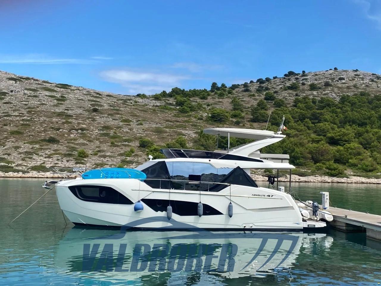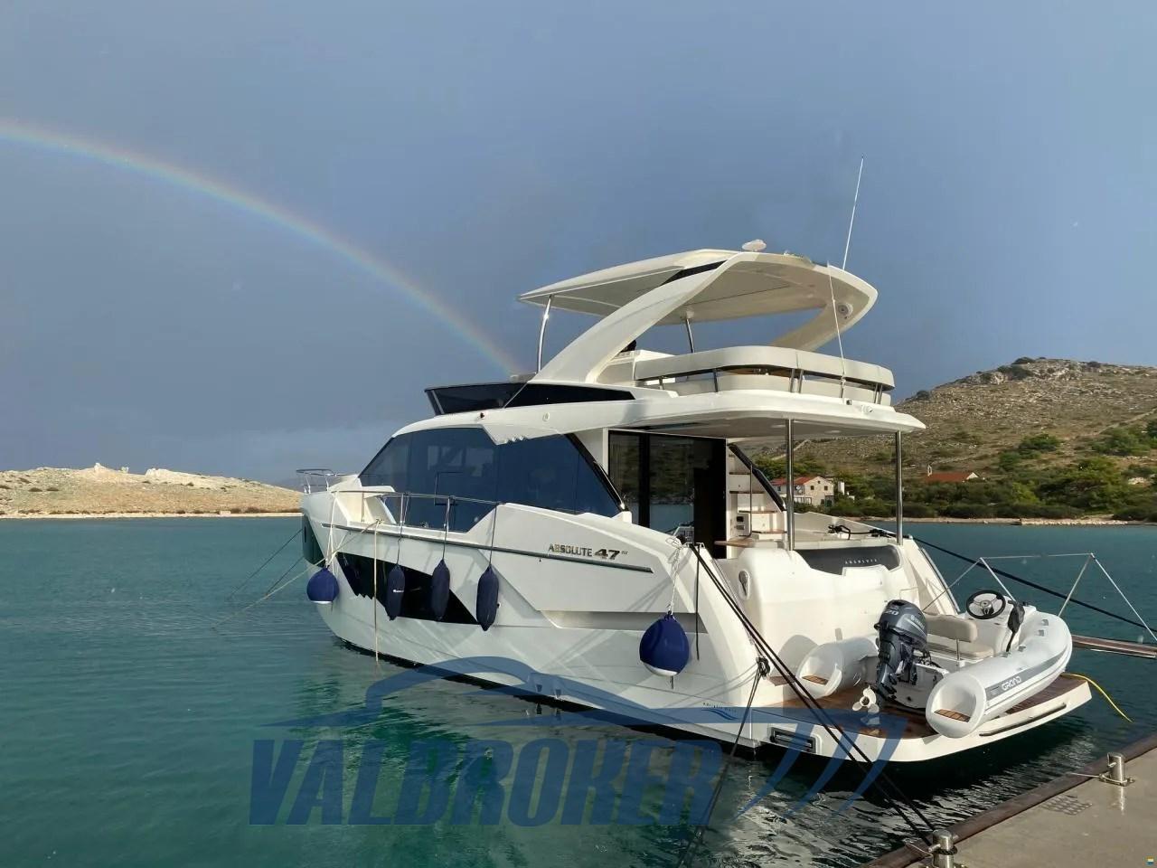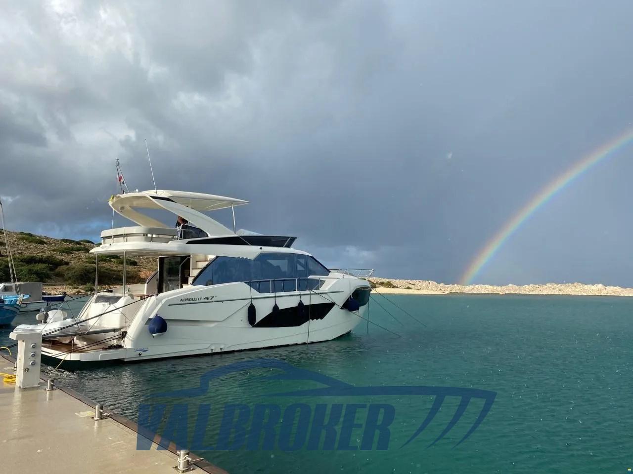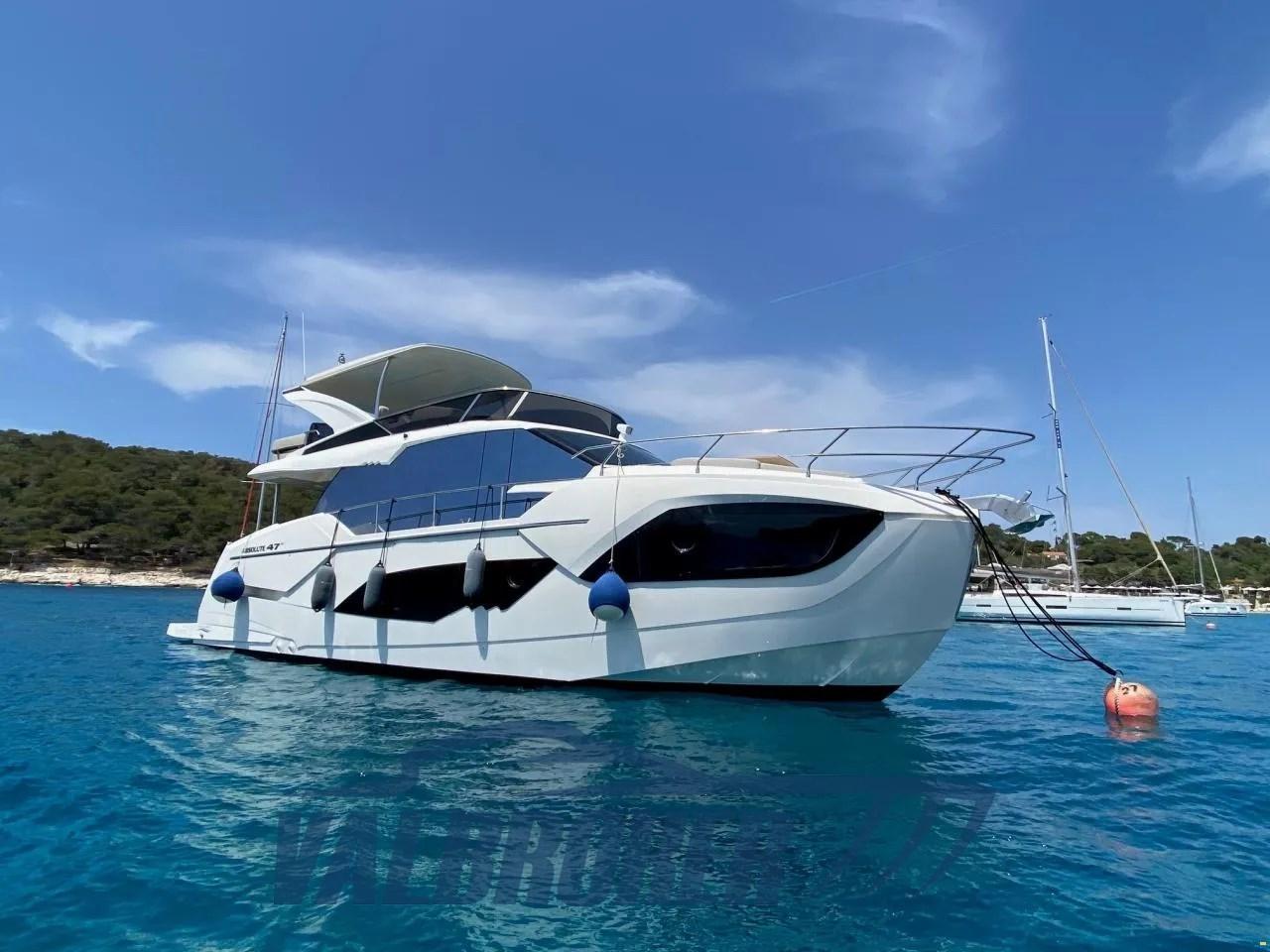 Flybridge du chantier naval italien Absolute Yachts, conçu pour maximiser l’espace et la luminosité. Propulsé par un Volvo Penta D6-IPS650 de 2x480 CV. Il dispose de 3 cabines : la cabine principale à l’avant, une cabine VIP au centre du navire et une chambre simple avec 2 salles de bains.