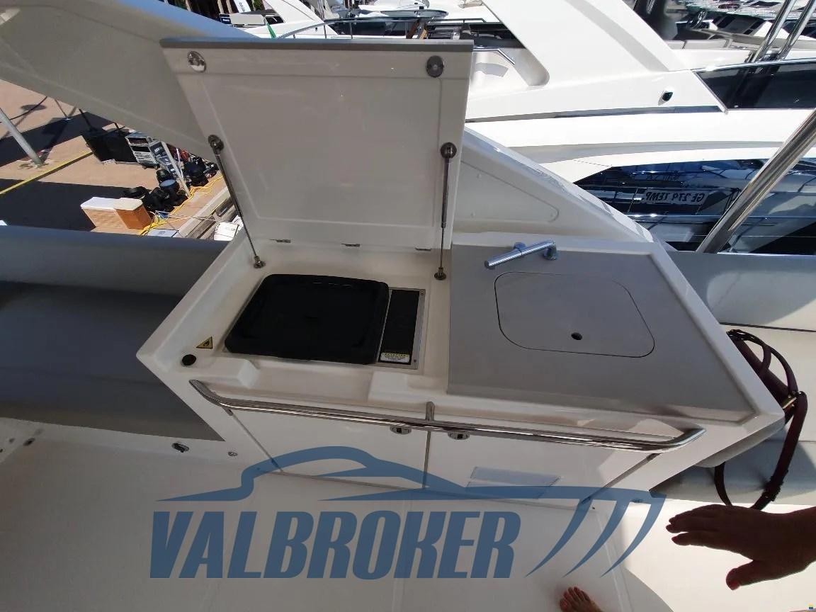 Ancre (inox ultra 35 kg), Eau sous pression, Douche de cockpit, Propulseur d'étrave (doppio comando), Phare de poursuite (doppio comando), Hard top, Éclairage de courtoisie, Spots sous-marins, Passerelle (retrattile elettroidraulica), Plateforme arrière (idraulica, 300 kg teak massello), Porte latérale, Porte latérale, Guindeau électrique, Echelle de bain (integrata nella piattaforma), table de cockpit (teak con copertura grigio perla), Table pliante de salon, Winch électrique arrière.