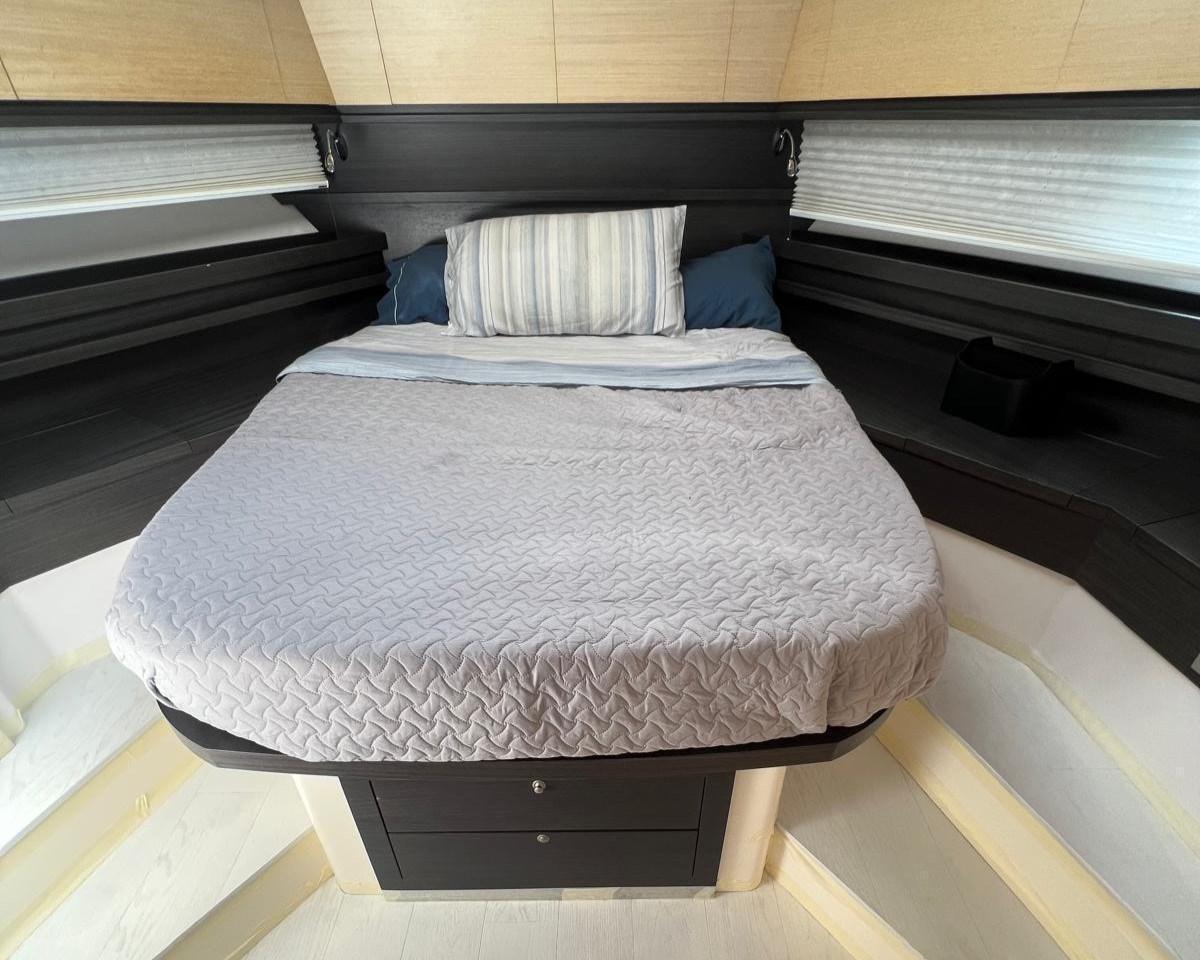 Grande cabine principale à l’avant, avec lit double central, hublots panoramiques et salle de bain privée avec cabine de douche séparée.