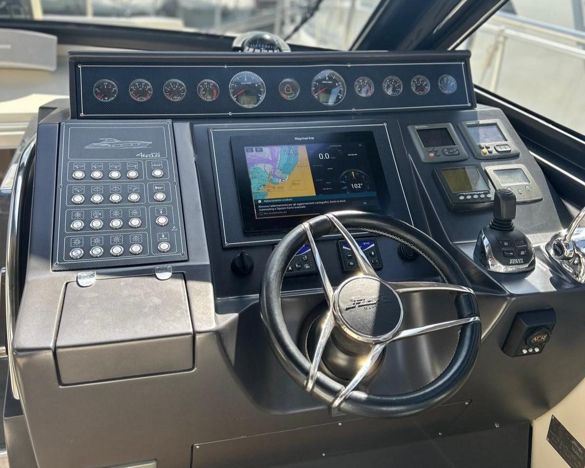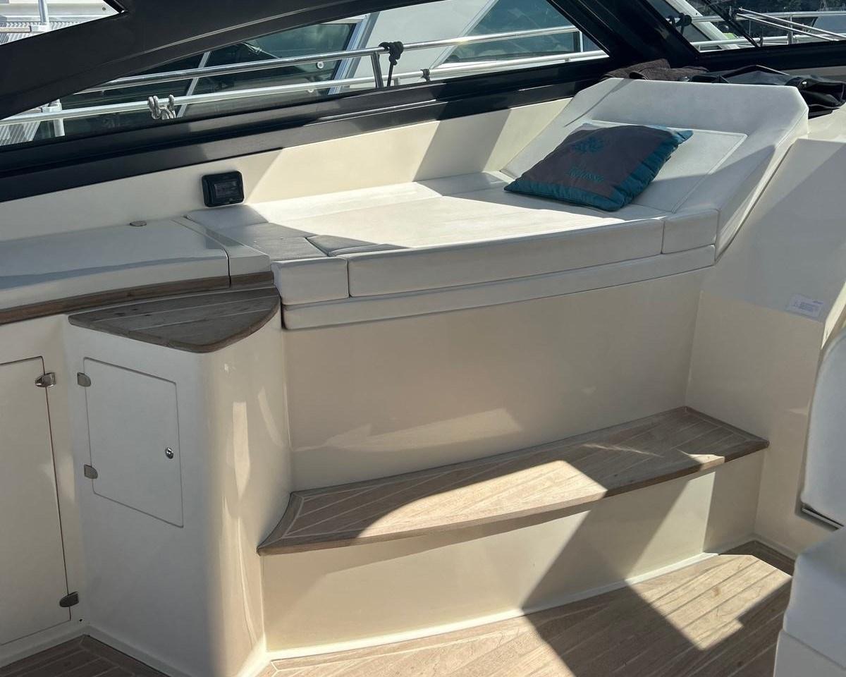 Timonerie située sur tribord, équipée d’un joystick pour une manœuvre facile (grâce aux moteurs IPS) et d’une chaise longue latérale pour les passagers.