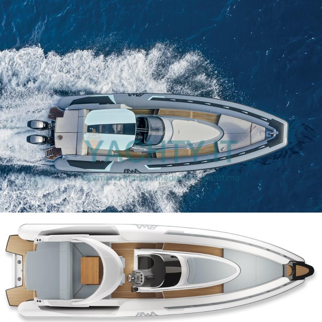 Cette configuration améliore l’expérience à bord avec un T-Top équipé de vitres panoramiques, de direction assistée électrique et de manettes électroniques, tandis que le teck du cockpit contribue à créer une ambiance élégante et accueillante. La présence de la cabine supplémentaire dans la trappe arrière augmente encore la qualité de vie, rendant le bateau idéal même pour les week-ends et les séjours prolongés.