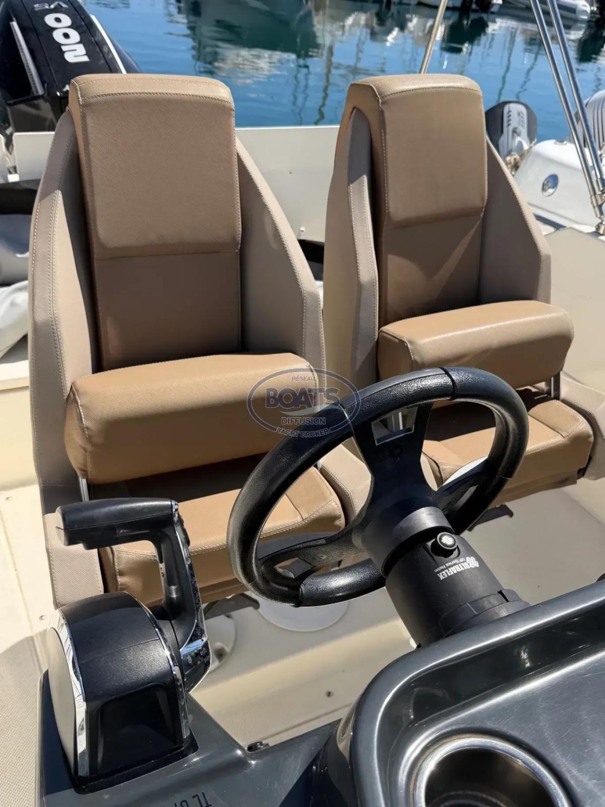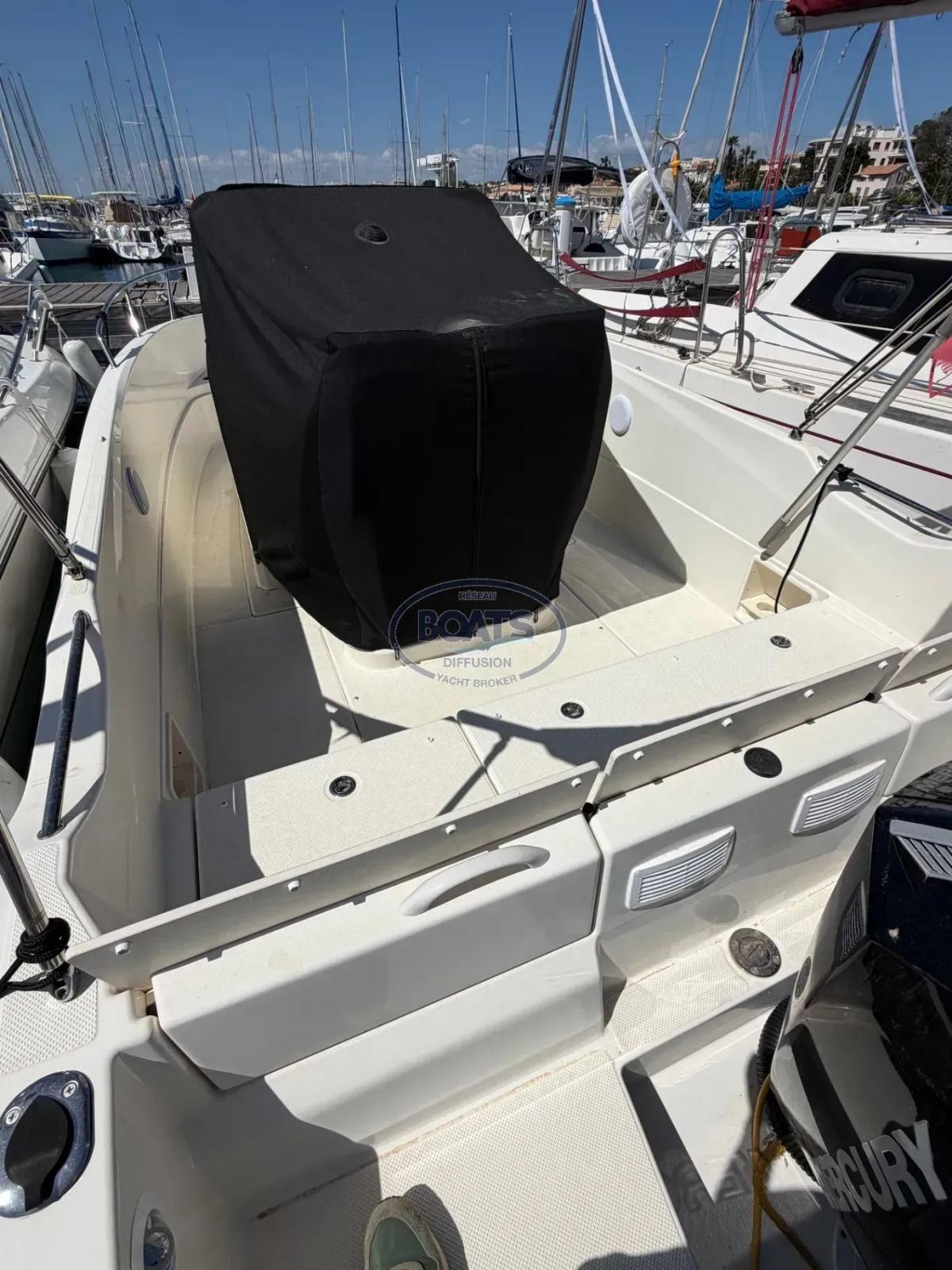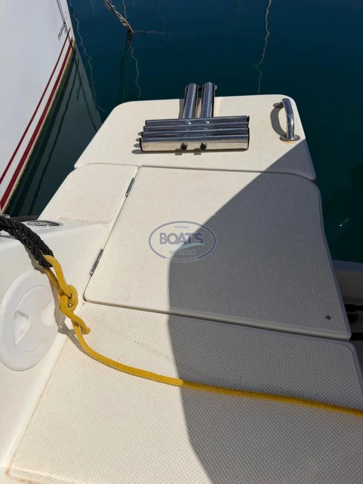 Grand espace autour du poste de pilotage, coussin banquette arrière, 2 siéges avec bolster, bain de soleil avant, équipé d 'une cabine, coffre à l 'avant et à l 'arrière.