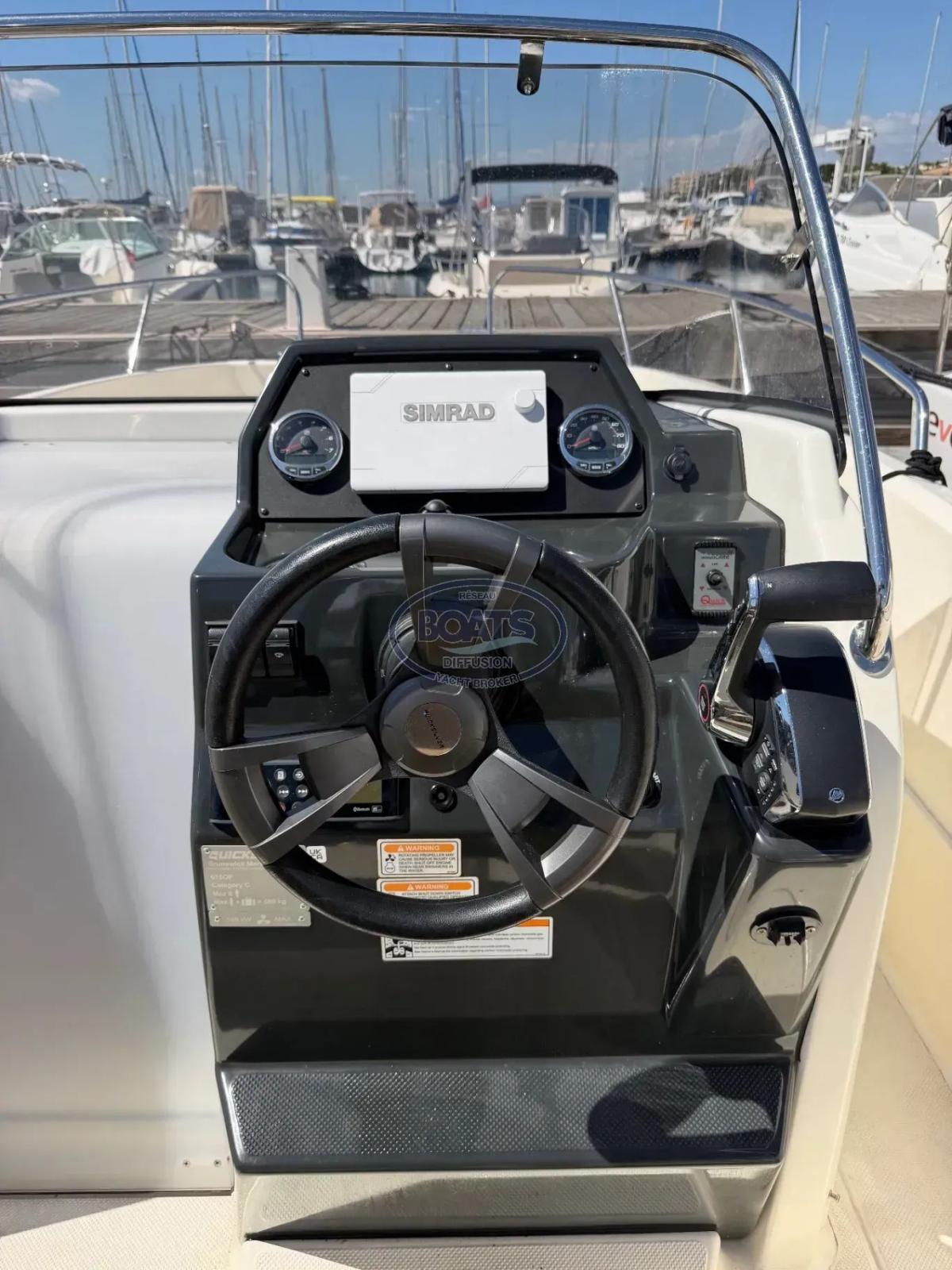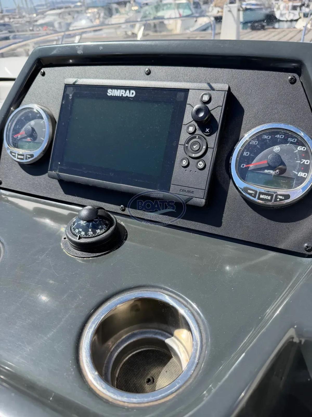 Poste de pilotage avec beau par brise équipé d'un compas, porte gobelet, Sondeur / GPS combiné de marque SIMRAD Cruiser, protégé par un Taux de console intégrale qui couvre les sièges.