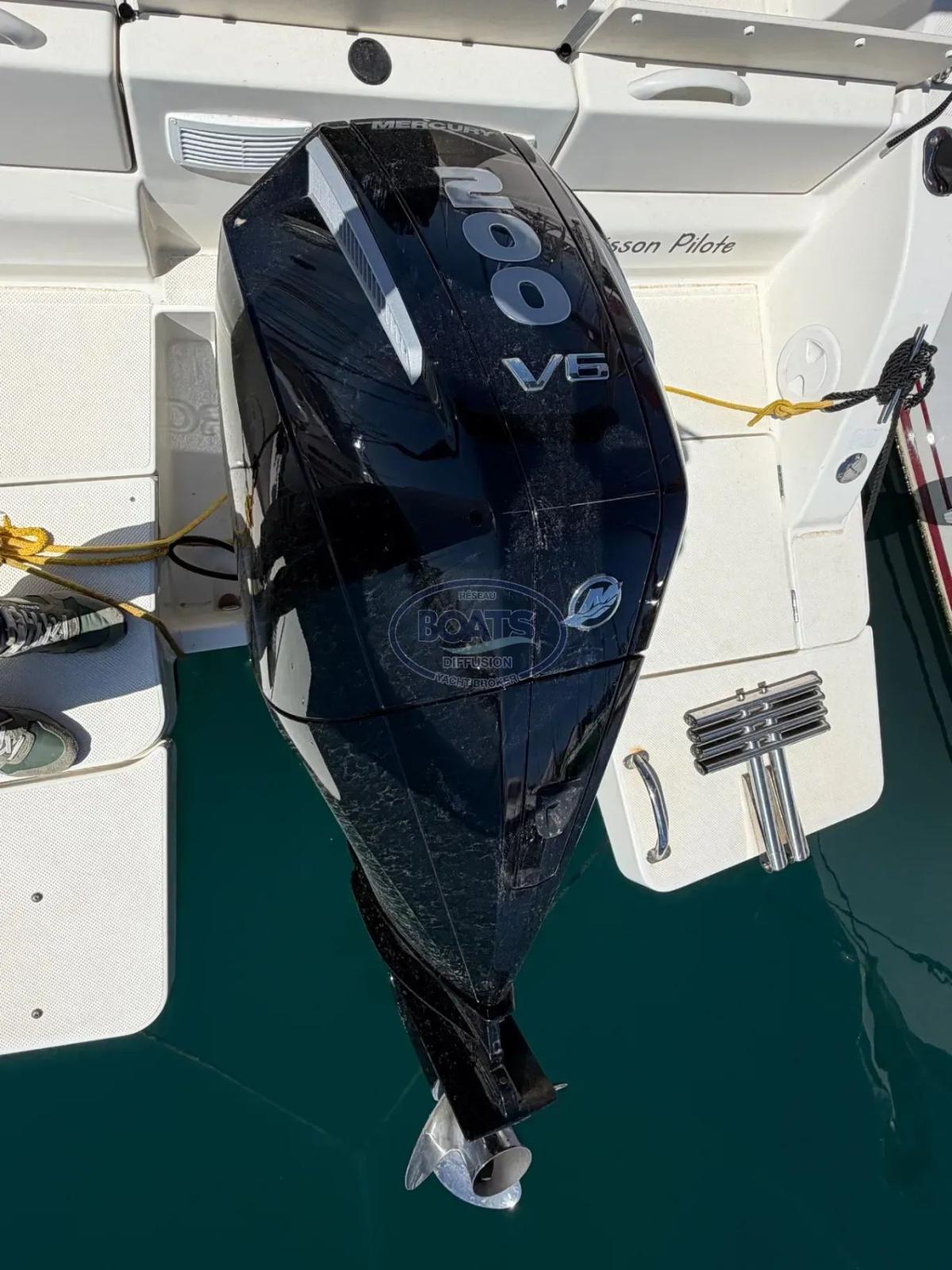 Propulsé par un moteur Mercury Hors-bord de 200CV avec gestion des paramétres sur la console centrale: Loch Speedo, horametre, réglage du Trim, commande électrique, direction hydraulique.