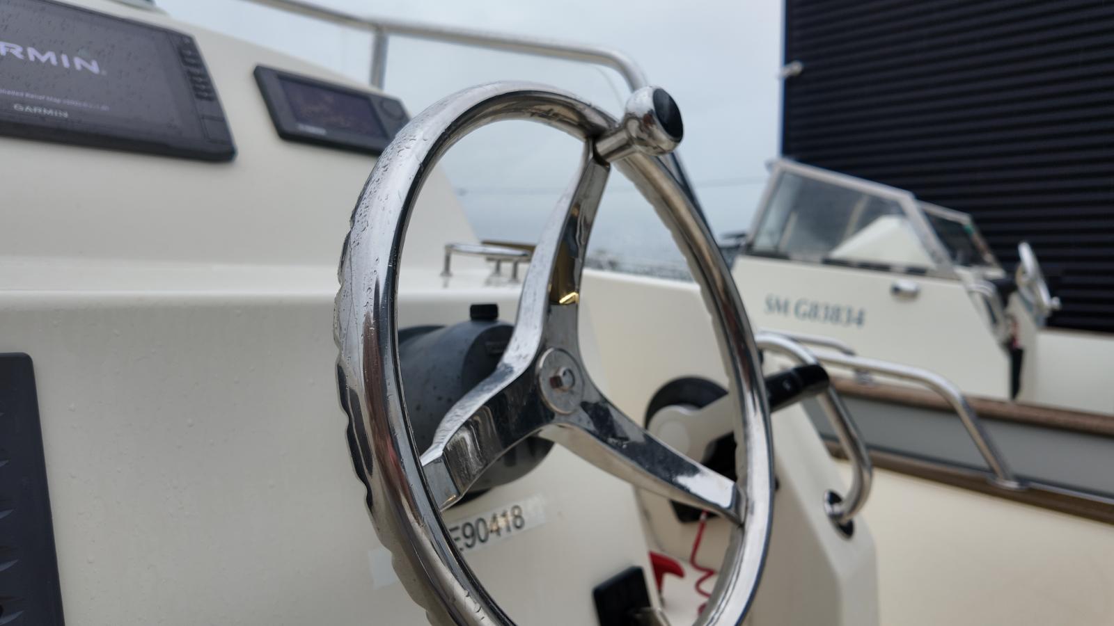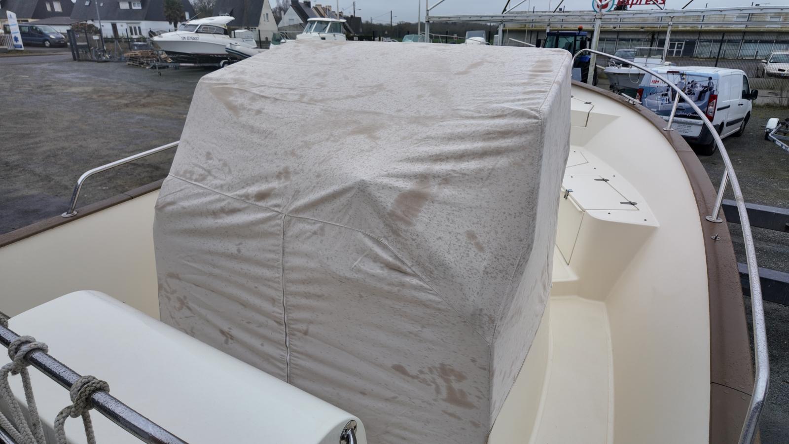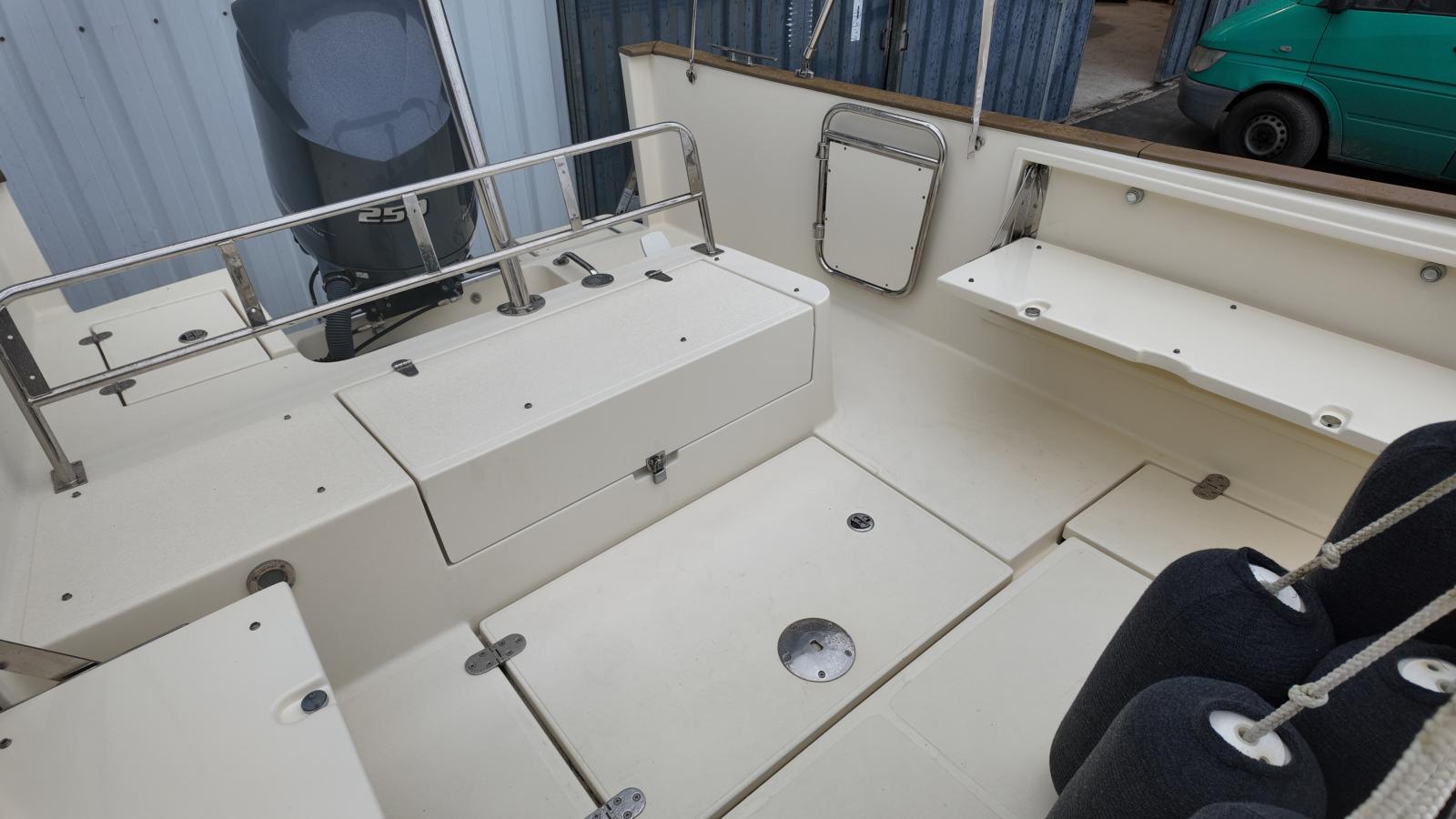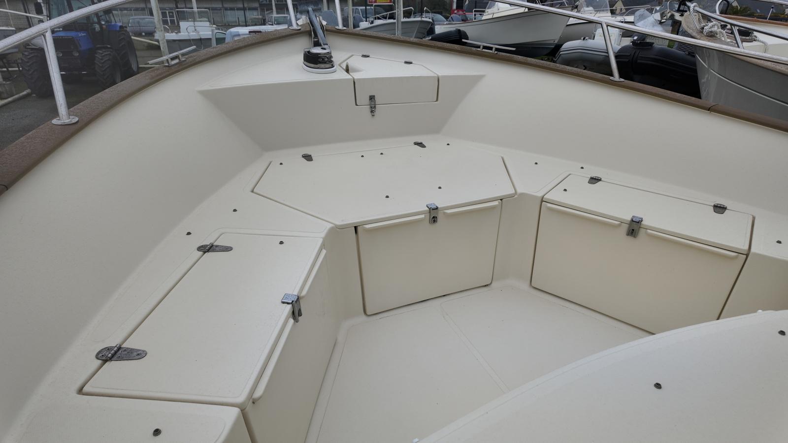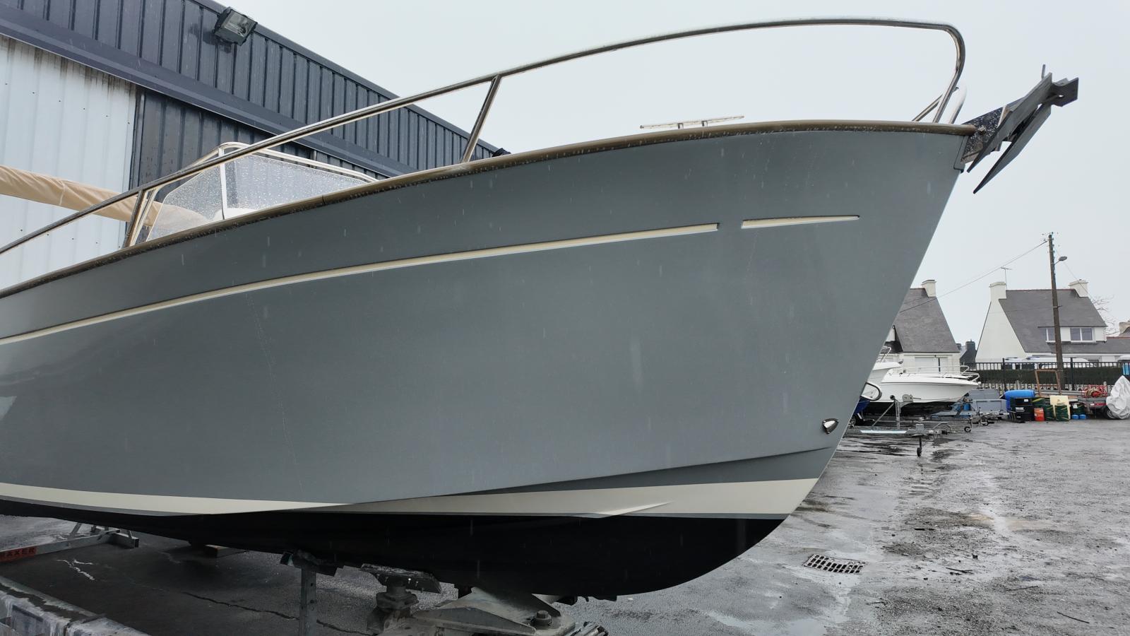 Construit par le chantier Rhéa Marine, le 27 Open se distingue par sa coque profonde et sa tenue de mer reconnue. Un bateau pensé pour naviguer dans les vraies conditions bretonnes — stable, rassurant, efficace. Le cockpit est généreux et bien pensé : assises rabattables, coffres de rangement, pare-battages, main courante. Tout y est pour naviguer confortablement en famille ou entre amis.