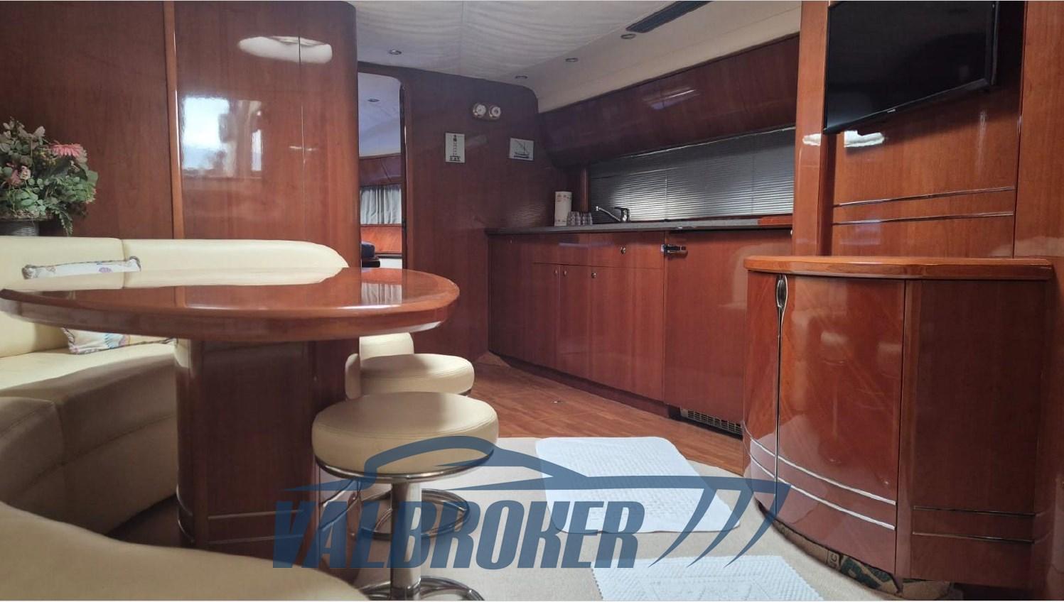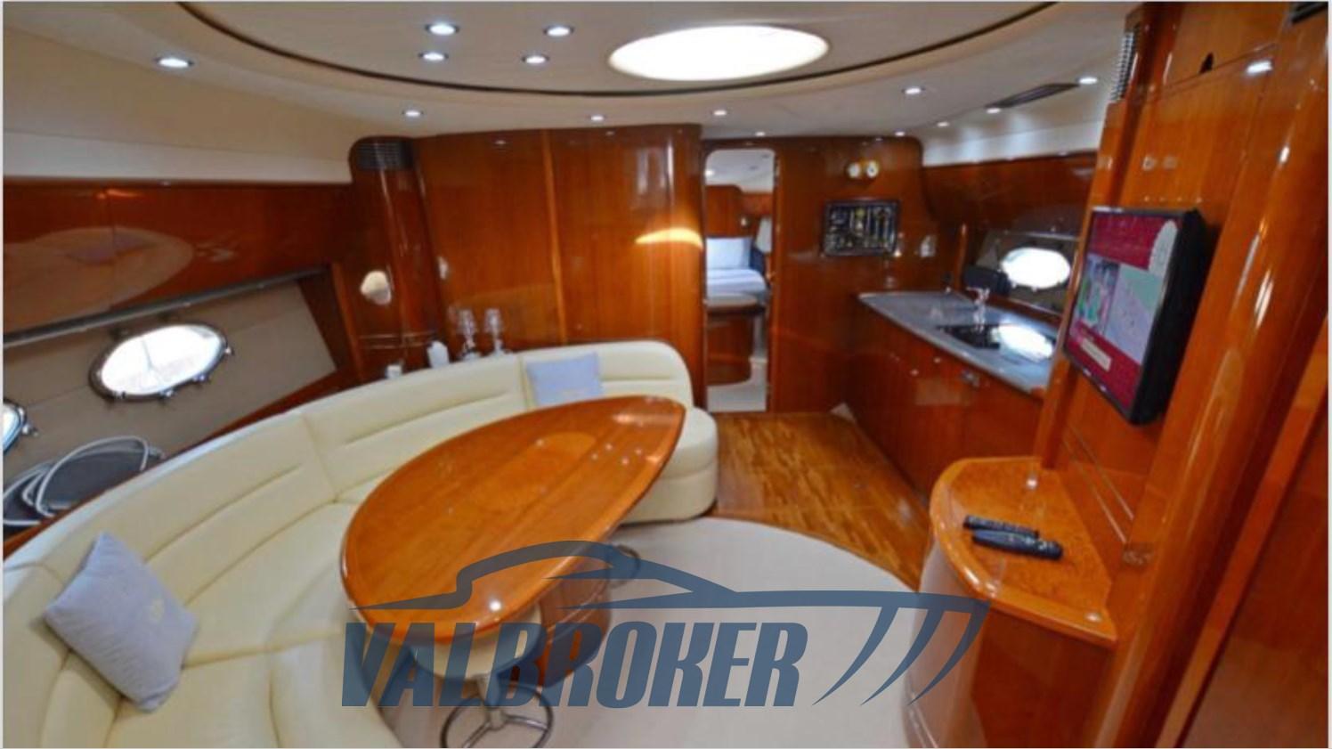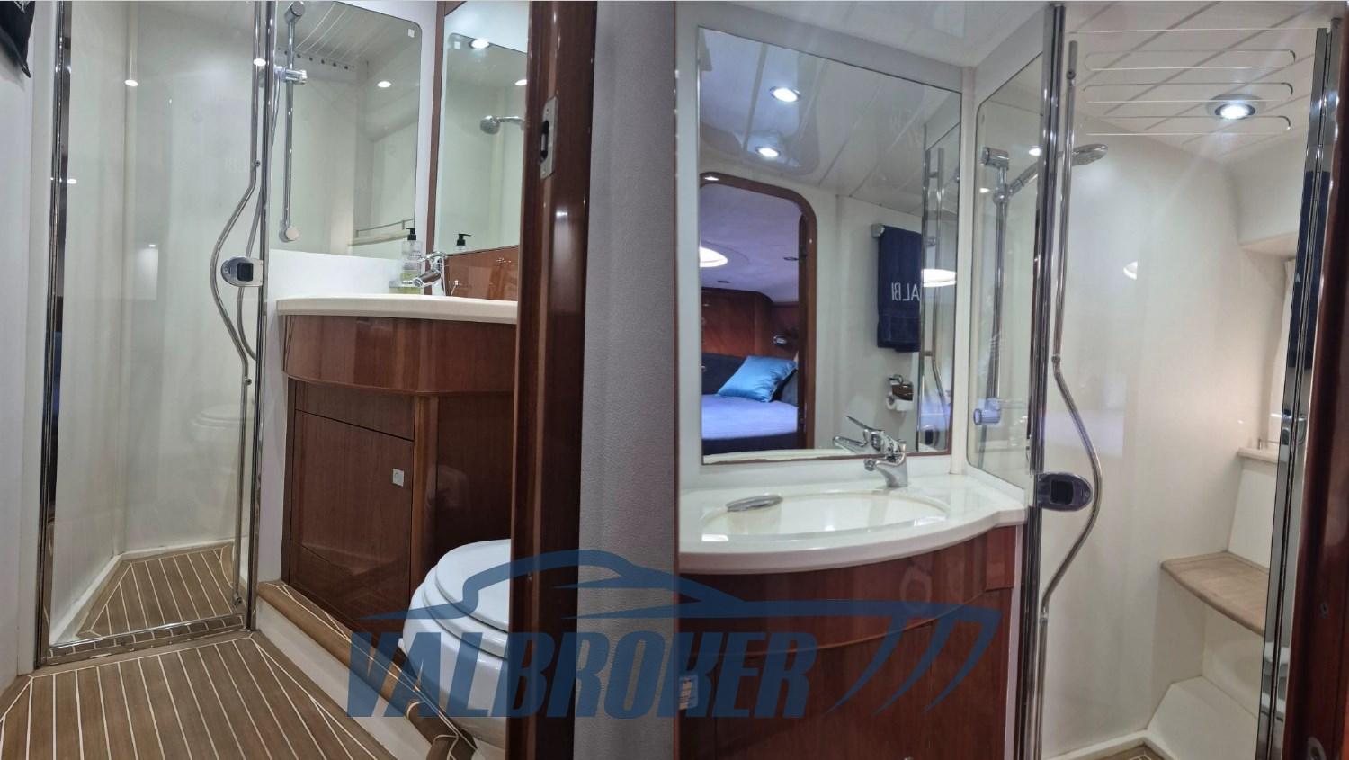 Yacht de sport du constructeur britannique Princess Yachts. Ligne d’arbre motorisée 2x MAN. Sous le pont, il y a trois cabines : une double à la proue, une double à la poupe et une avec lits superposés.