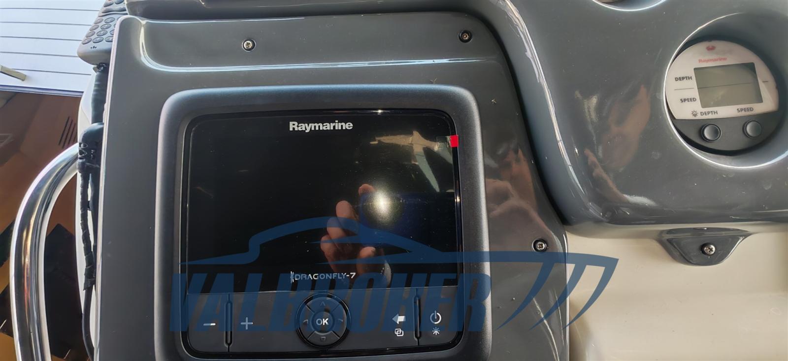 Indicateur d'angle de barre, Compas (Ritchie), Commande électrique, Sondeur pêche (Raymarine), GPS (Dragonfly 7), Radio VHF (Raymarine 240), Siège copilote.