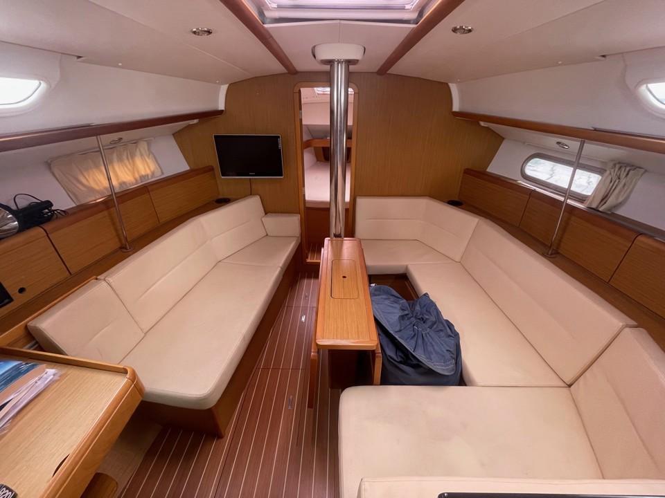 L’intérieur offre une atmosphère chaleureuse et lumineuse, fidèle au savoir-faire Jeanneau :