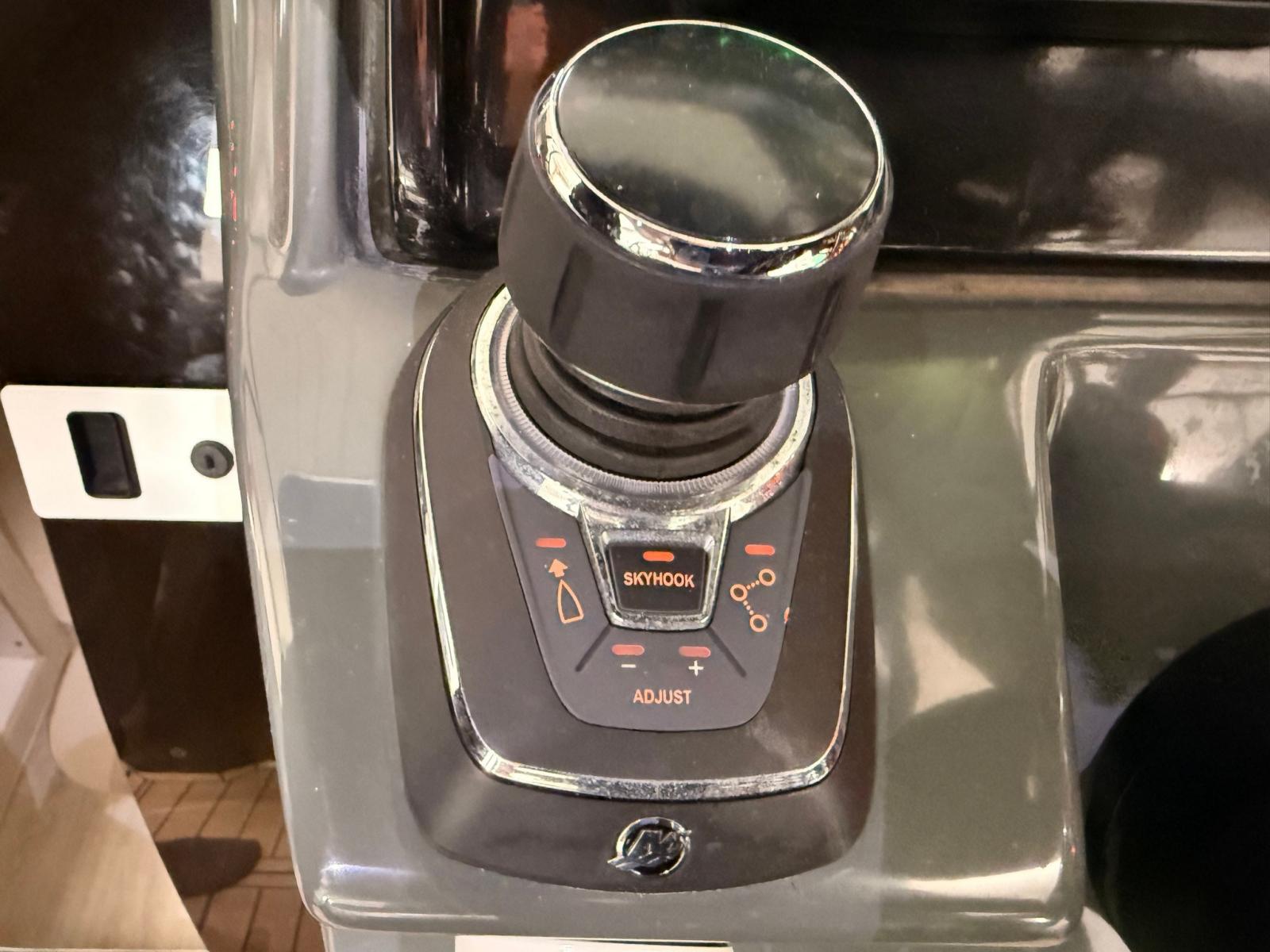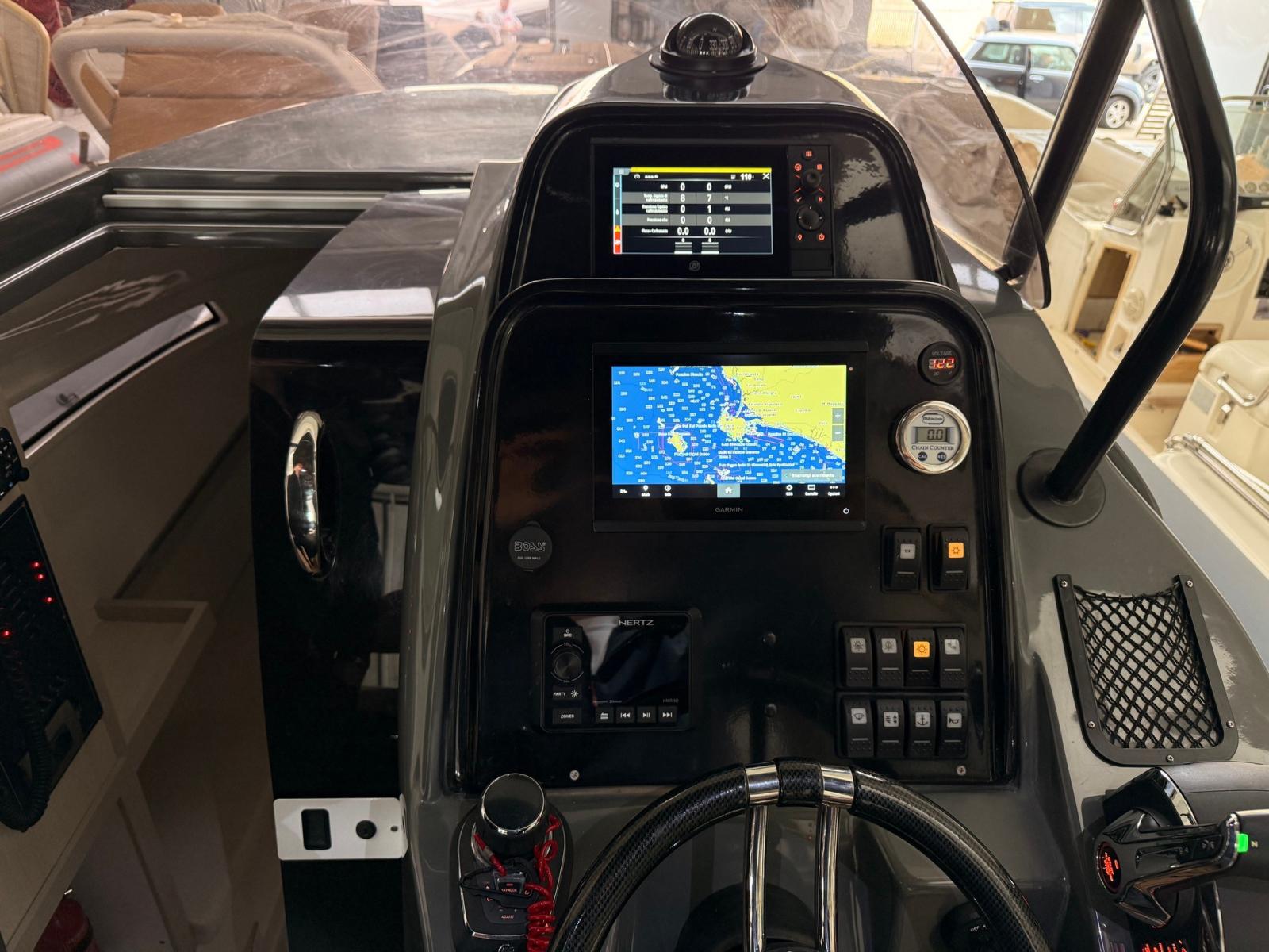 Ordinateur fixe de bord (MERCURY), Tachymètre, Compteur de chaîne (MZ ELECTRONIC), Compteur d'heures, Sondeur pêche (GARMIN), GPS (GARMIN 923XSV), Joystick (MERCURY SKYHOOK), Pilote automatique (MERCURY), Radio VHF (ICOM).