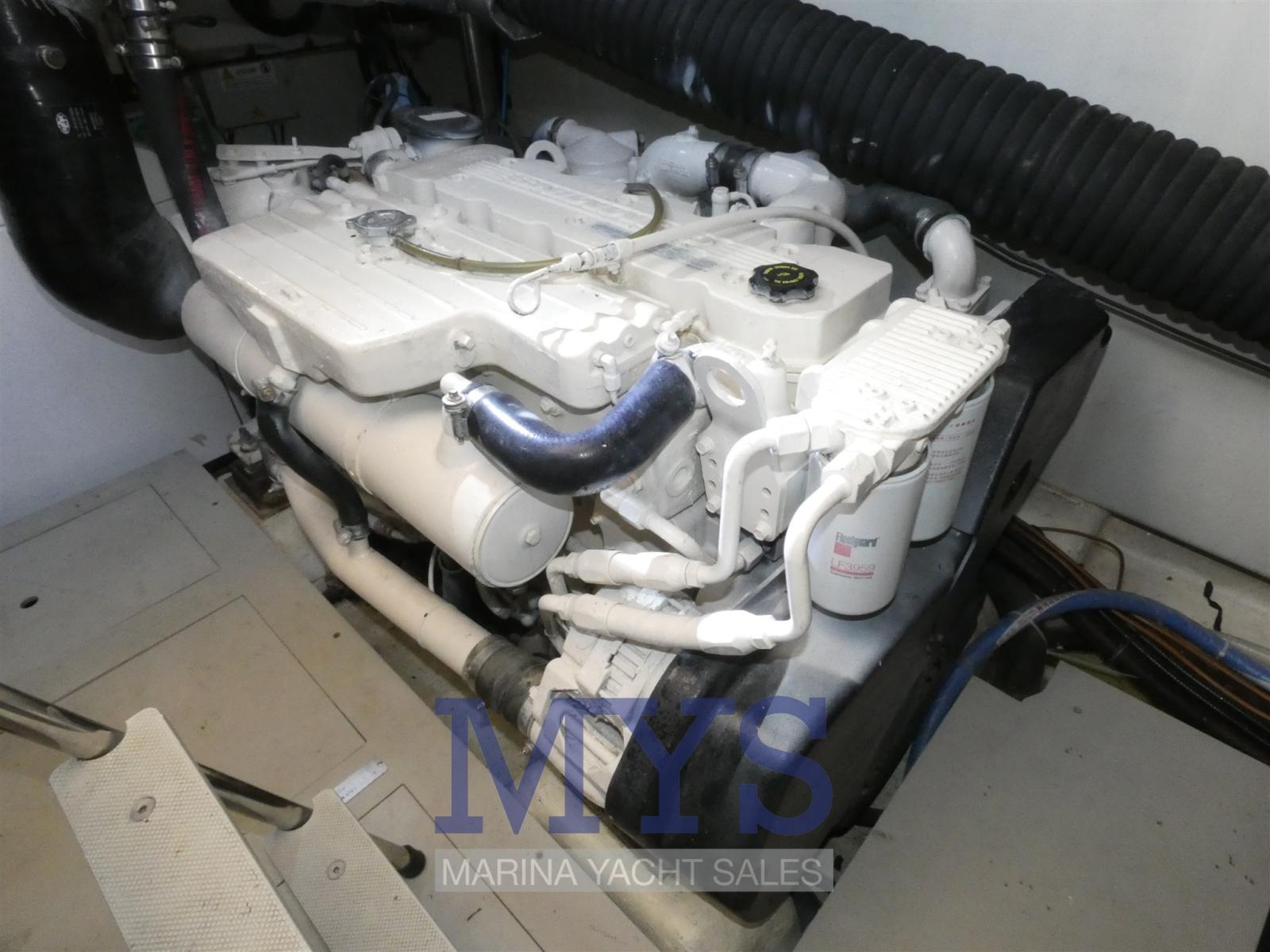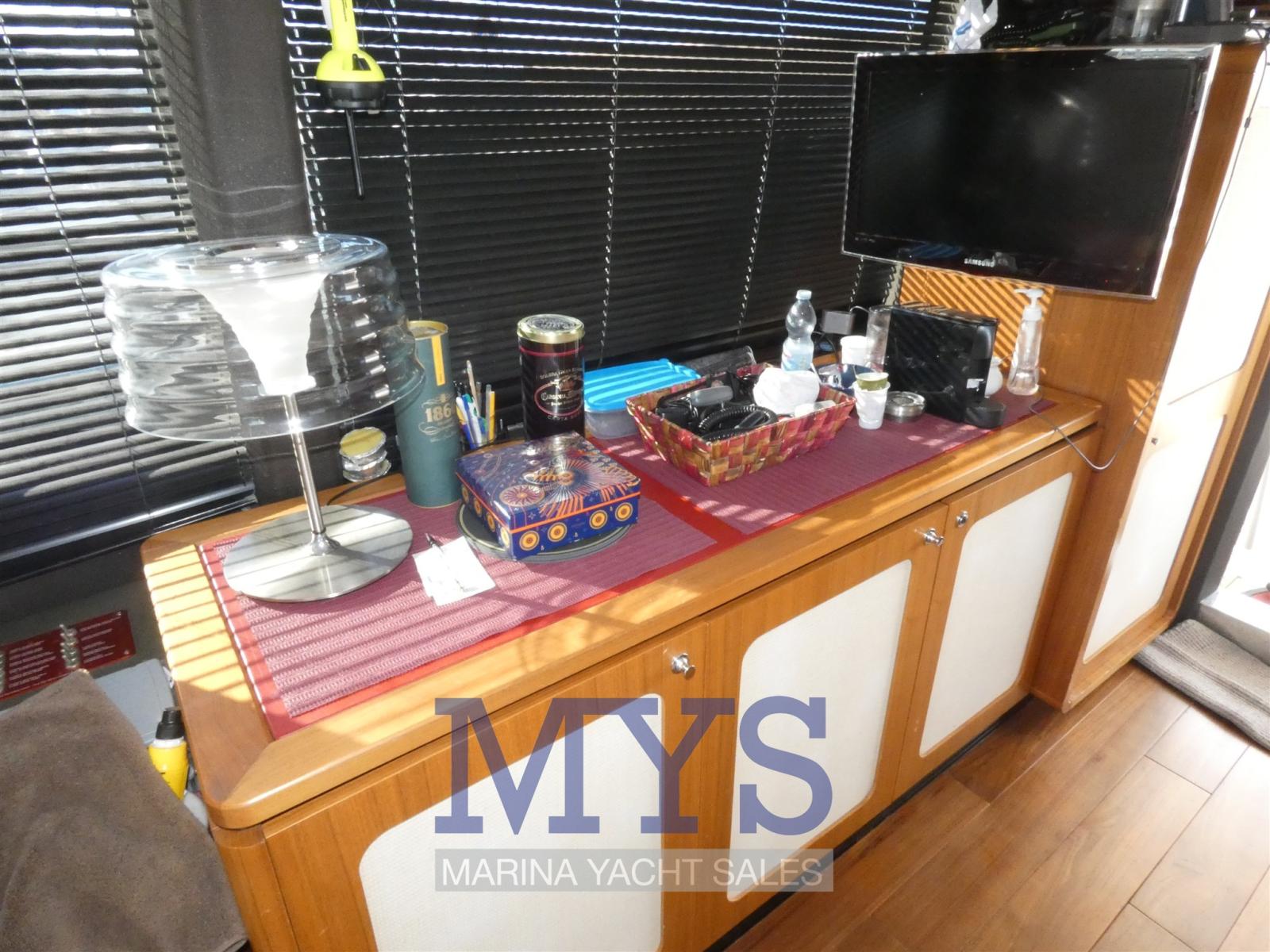 Alarme moteur, Alarme de pompe de cale, Eau sous pression, Passavant en teck, 2 Douche de cockpit, Double barre à roue, Phare de poursuite, Éclairage de courtoisie, Spots sous-marins, Passerelle (idraulica telescopica a scomparsa), Plateforme arrière (in teak), Pompe de cale automatique, Pompe de cale manuelle, Porte latérale, Cockpit en teck, Prise de quai, Connexion eau sous pression à quai, Guindeau électrique, Echelle de bain, table de cockpit, Corne, Pont en teck, 2 Winch électrique arrière, Winch électrique avant.