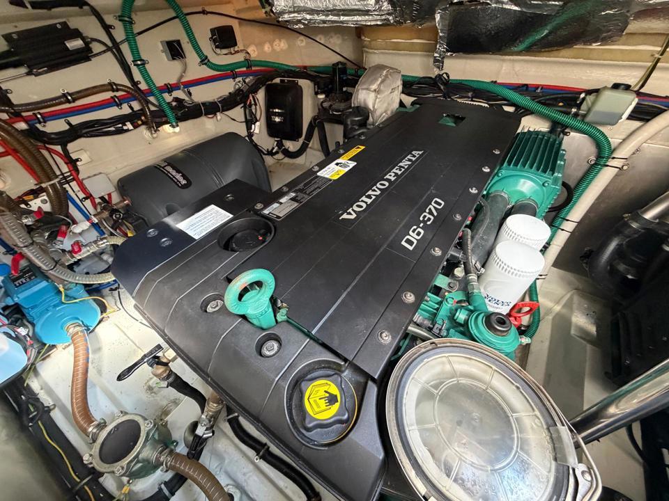 Il bénéficie d’un équipement complet et haut de gamme : deux moteurs Volvo D6‑370, climatisation, groupe électrogène, plateforme hydraulique, joystick avec propulseur d’étrave, passerelle hydraulique, compteur de chaîne, projecteur, ainsi que l’ensemble des tauds de protection.