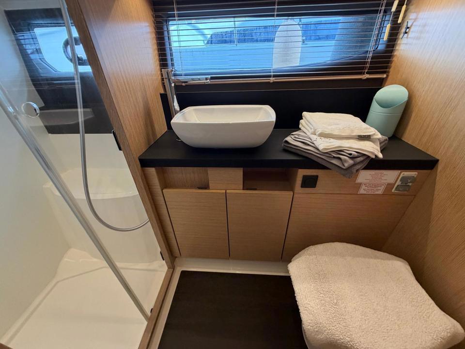 Ses atouts majeurs : une cuisine de plain-pied ouverte sur le cockpit, deux grandes cabines, chacune avec sa salle d’eau, et une belle hauteur sous barrots.