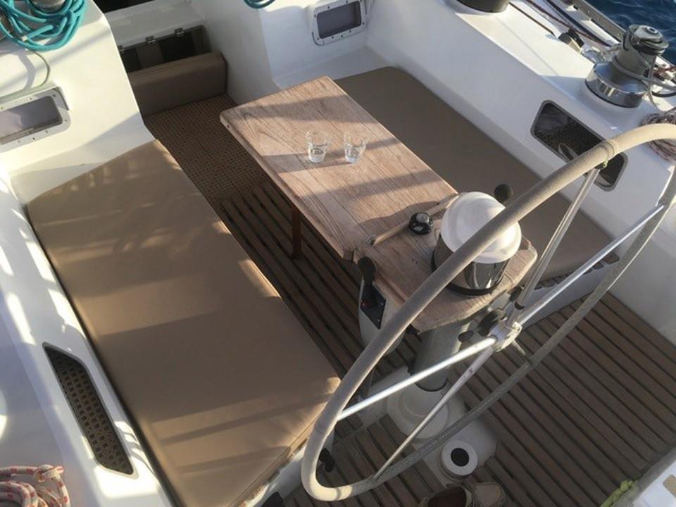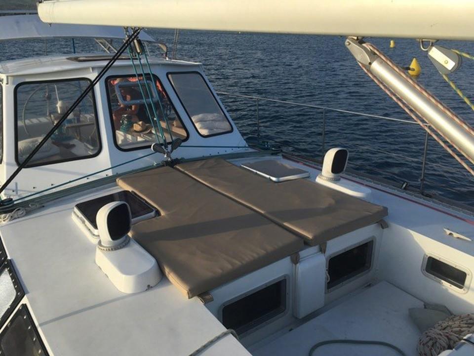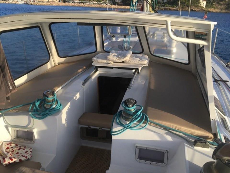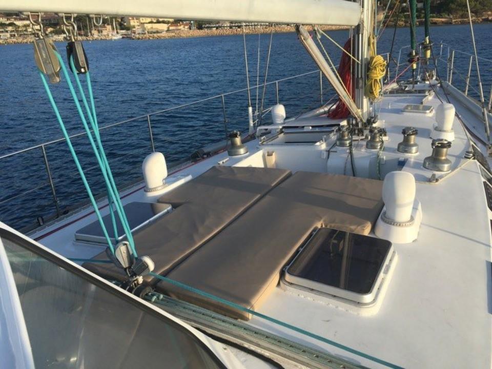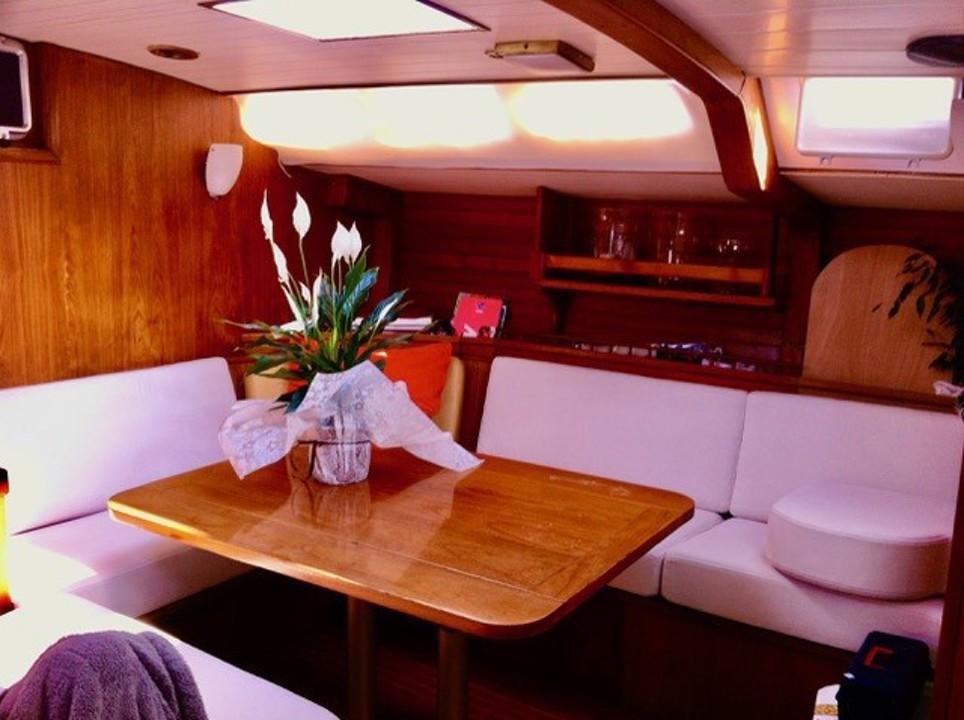 À l’intérieur, l’ambiance est chaleureuse et fonctionnelle. Le bois dur utilisé pour l’aménagement apporte du caractère, tandis que les finitions sont pensées pour la vie en mer. Le bateau dispose d’une vaste cabine propriétaire à l’avant, de deux couchettes pour les invités, d’une cuisine spacieuse et d’un poste de navigation bien équipé. L’ergonomie et les nombreux rangements rendent ce voilier idéal pour vivre à bord sur de longues périodes.