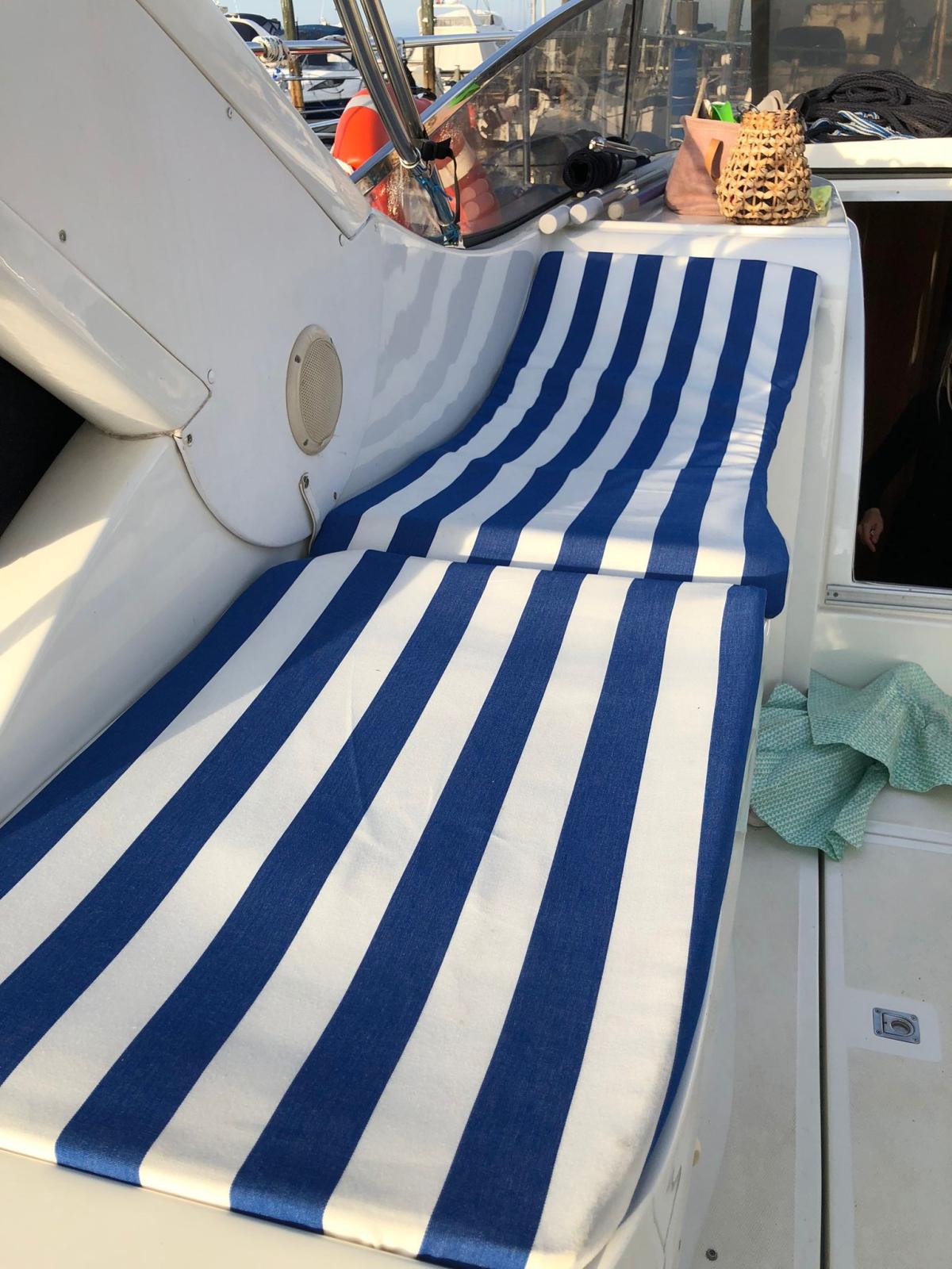 2025 NOUVEAU SYSTÈME SYNTHÉTIQUE DE HAUTE QUALITÉ SUR LA PLATEFORME DE BAIN - NOUVELLE SELLERIE EXTÉRIEURE (SIÈGES DE COCKPIT, PONT ARRIÈRE ET PROUE) AVEC DOUBLE REMBOURRAGE « BLANC EN CUIR ÉCO COMME À L’ORIGINE PLUS LA SELLERIE EN MATÉRIAU OLEO HYDRO » - REMPLACEMENT DE LA POMPE ÉLECTRIQUE DES DEUX TOILETTES - NOUVEAU CHARGEUR DE BATTERIE -