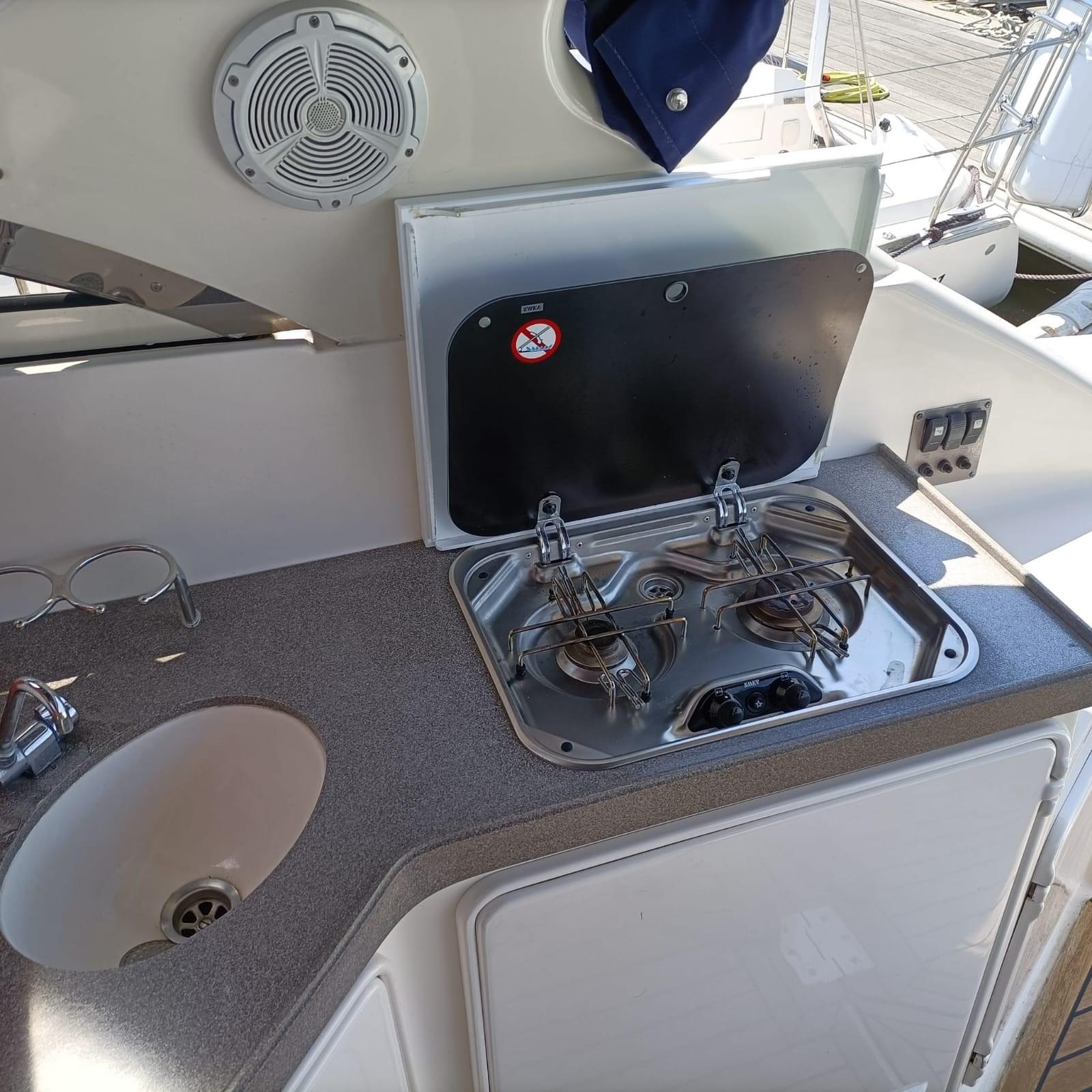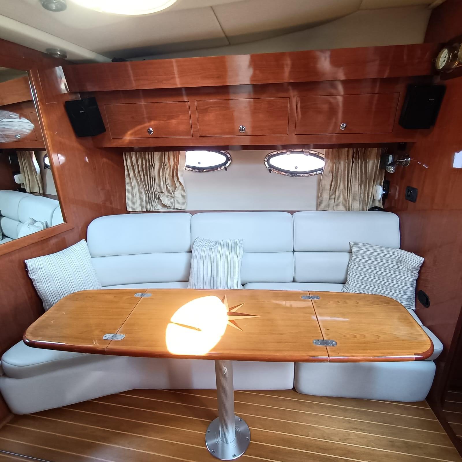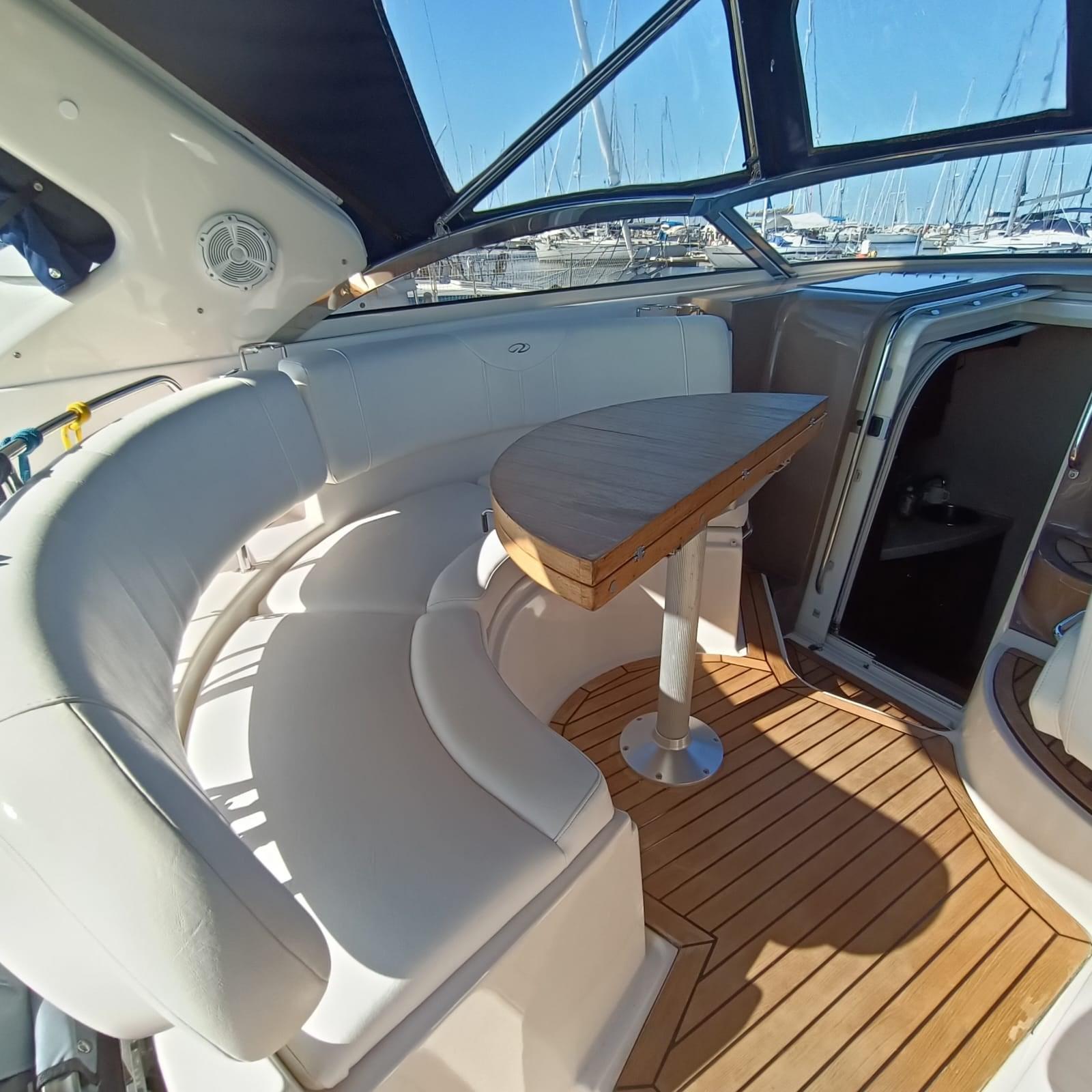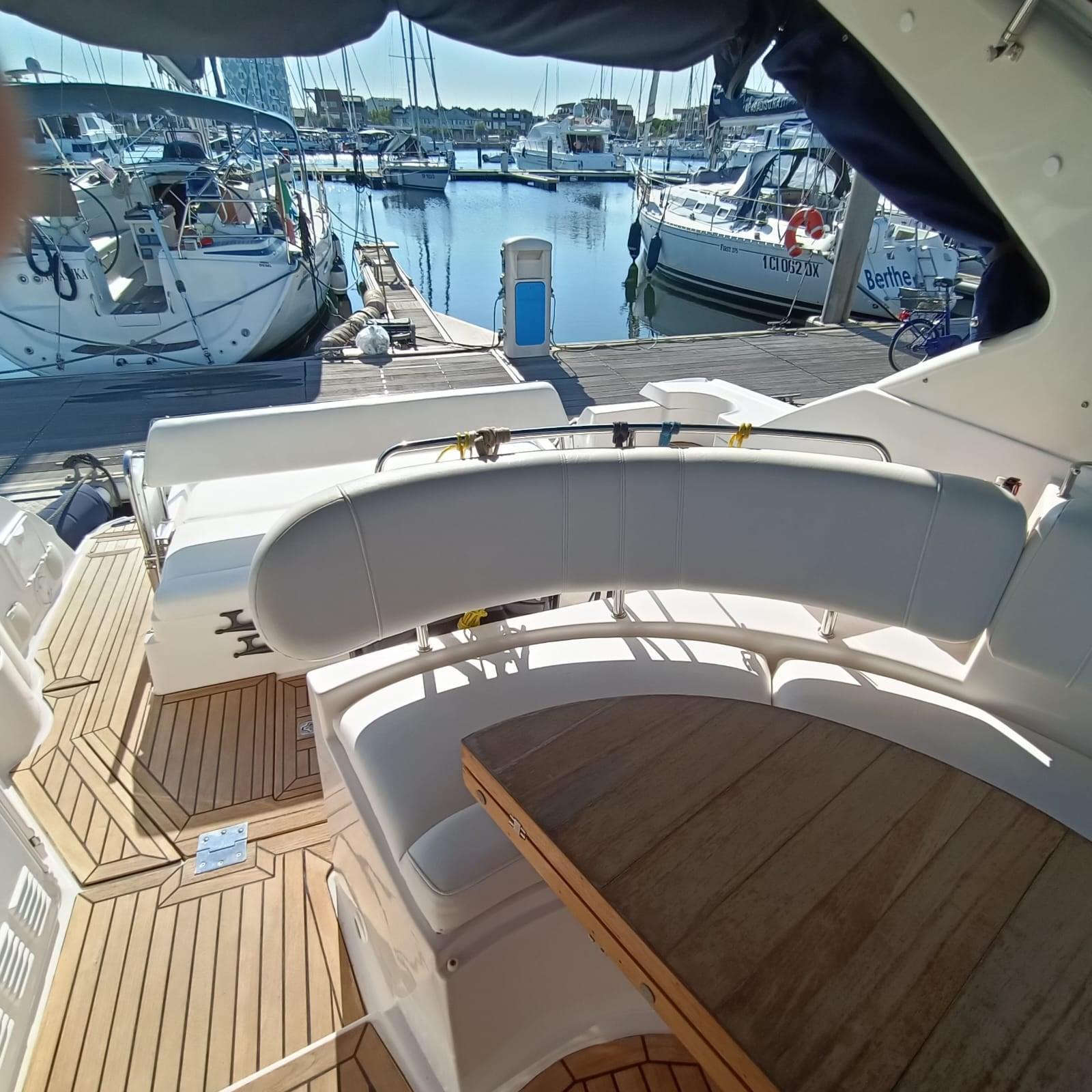 coussins rénovés, cuisine intérieure et extérieure, réfrigérateur, four, propulseur d’étrave, pilote automatique, moteurs Volvo Penta Kad 300 et instrumentation complète.