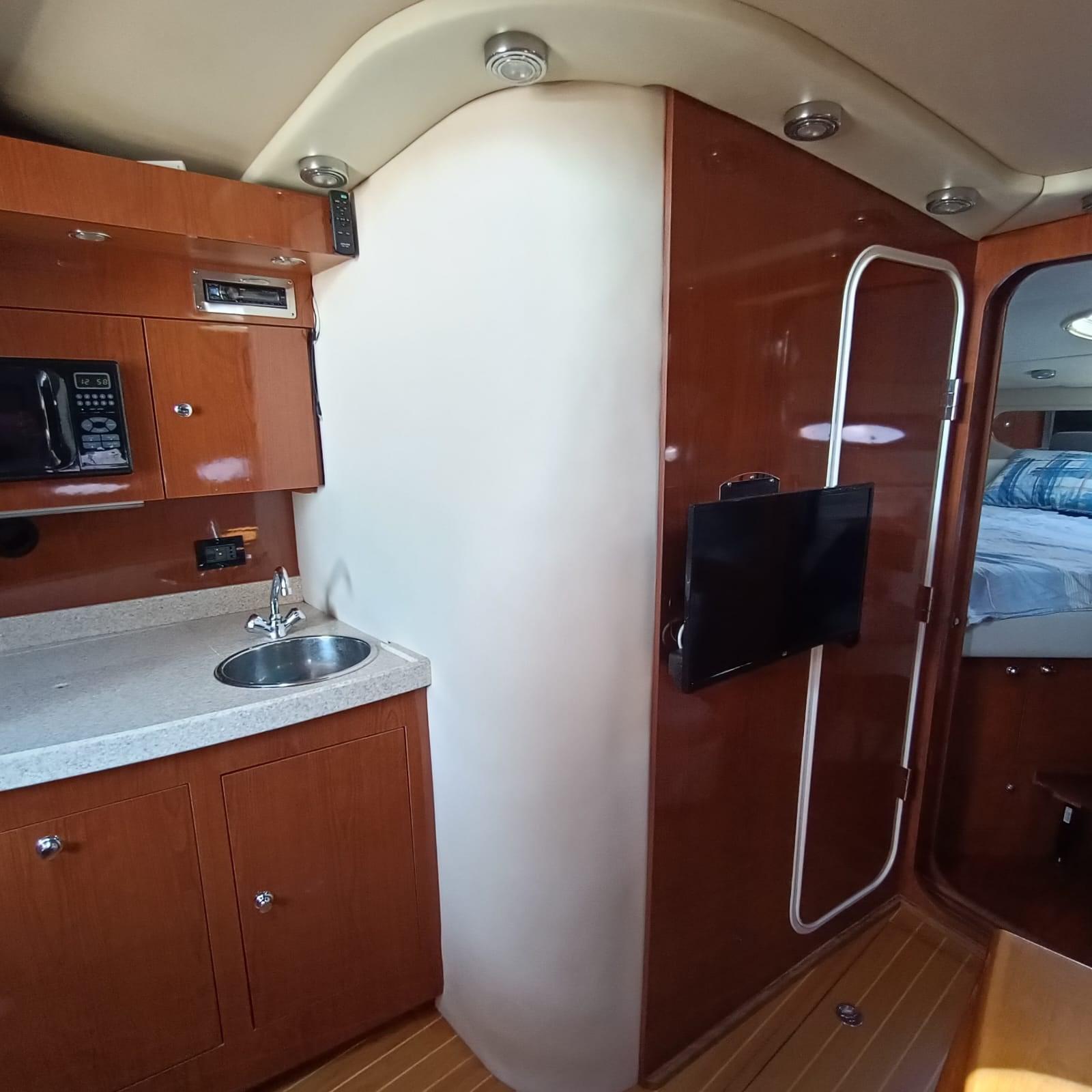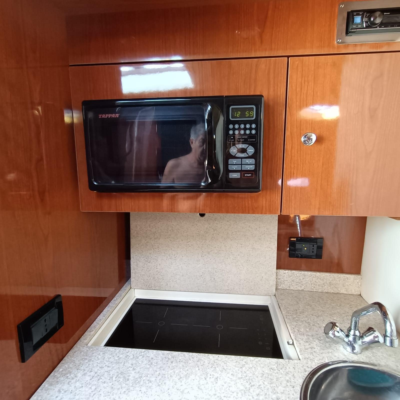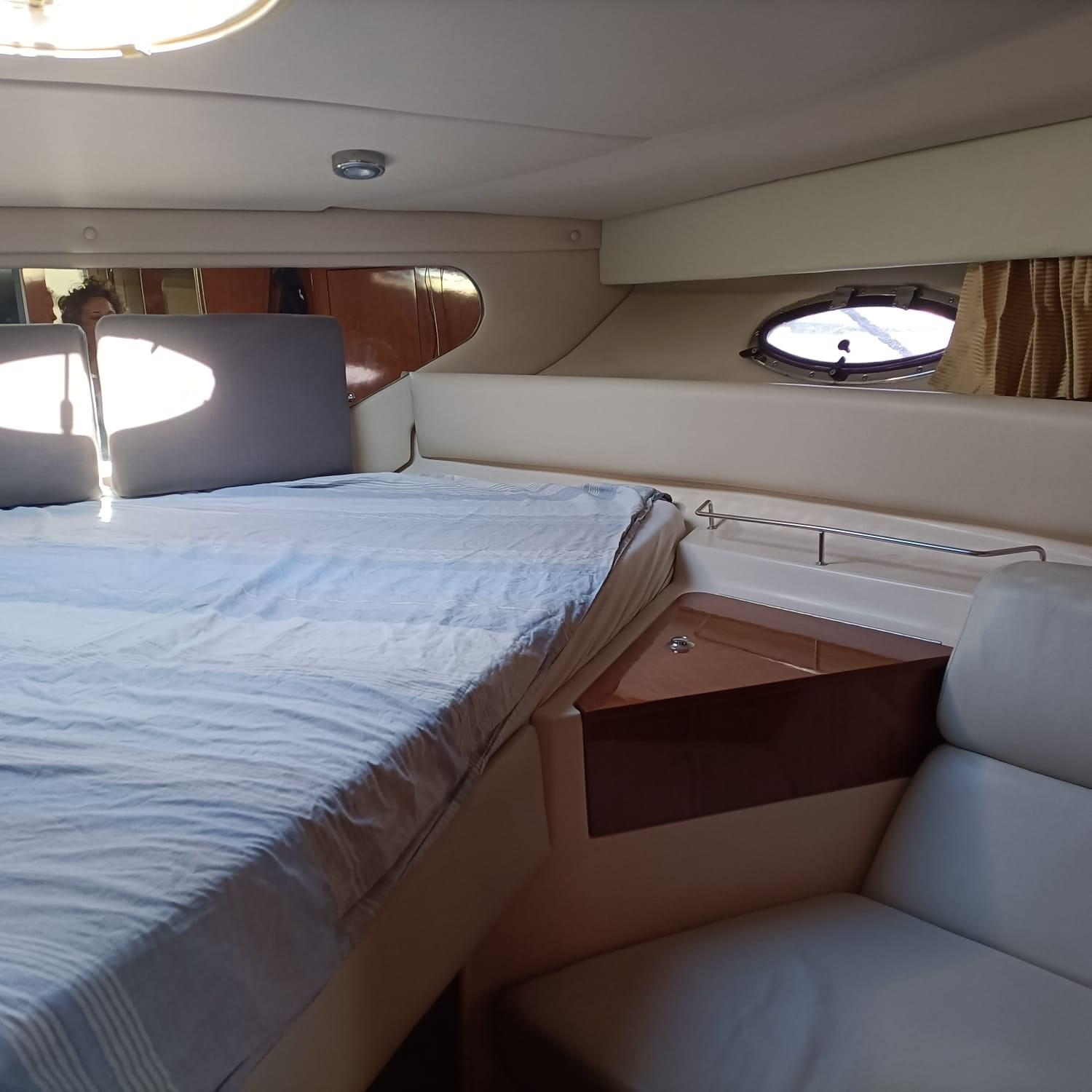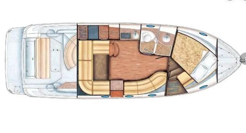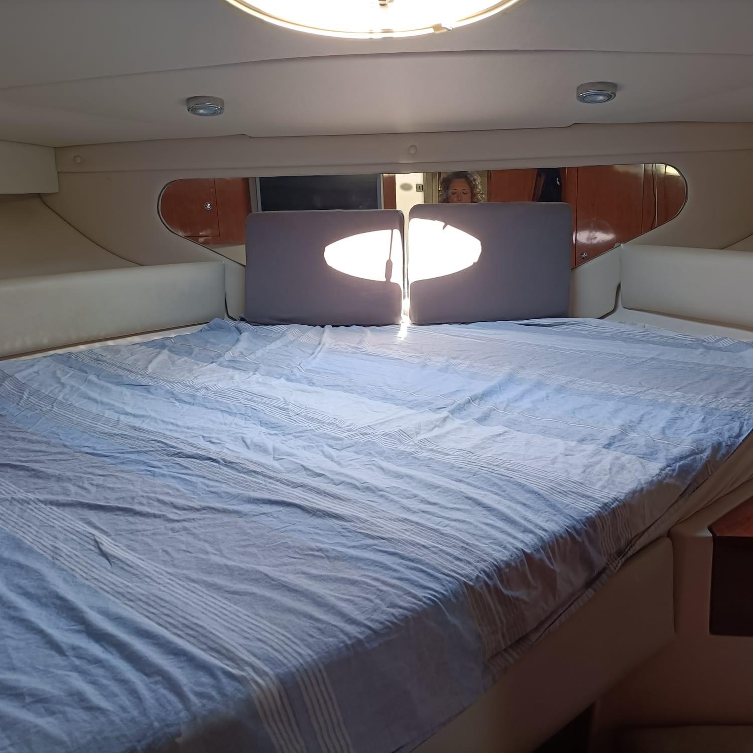 coussins rénovés, cuisine intérieure et extérieure, réfrigérateur, four, propulseur d’étrave, pilote automatique, moteurs Volvo Penta Kad 300 et instrumentation complète.