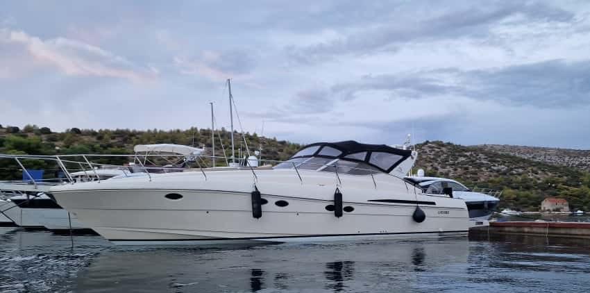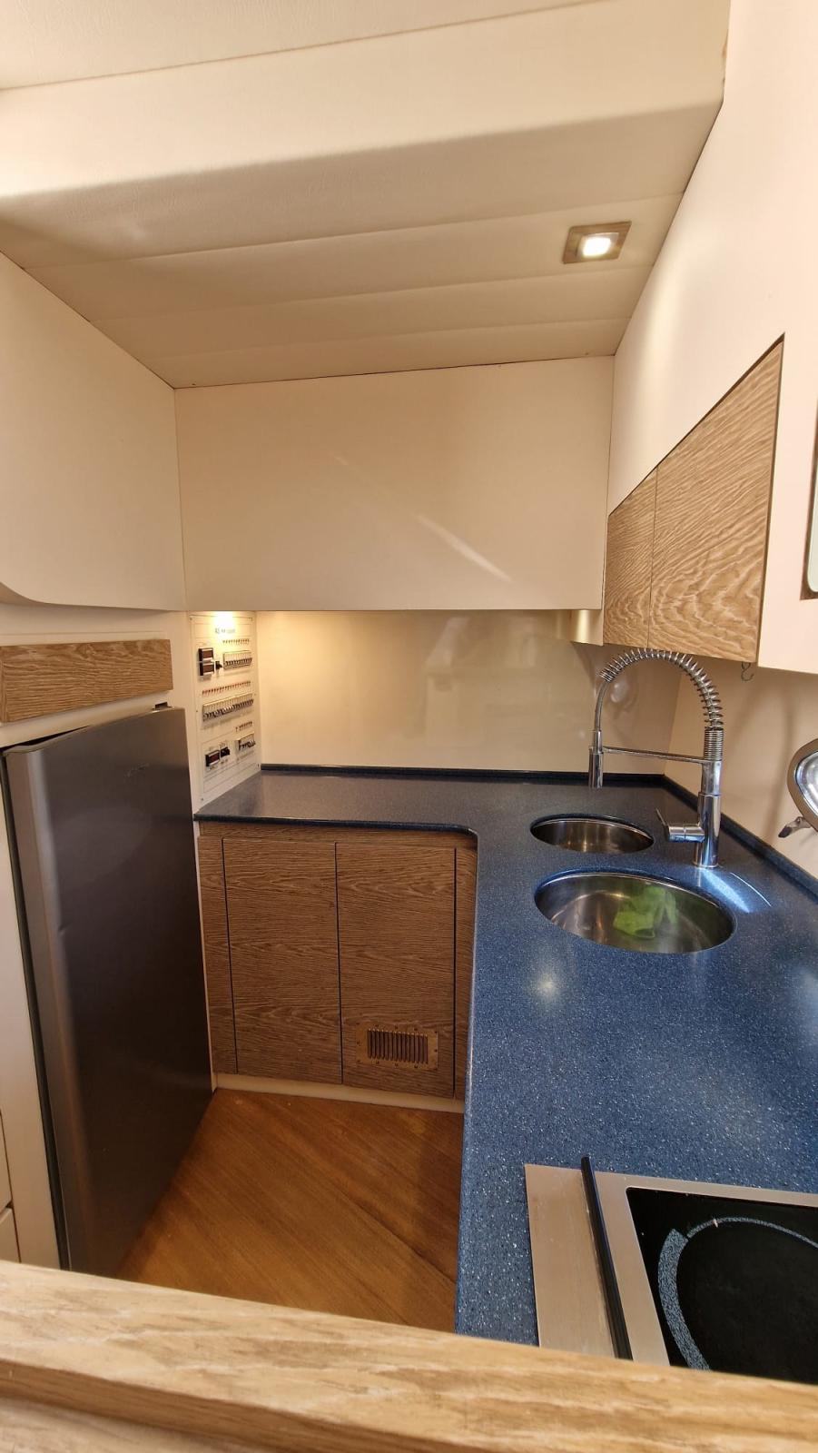 Alarme moteur, Eau sous pression, Douche de cockpit (acqua calda/fredda), Flaps hydrauliques, Indicateurs de flaps, Lavabo dans le cockpit, Éclairage de courtoisie, Passerelle (idraulica besenzoni con telecomando), Plateforme arrière (in teak), Pompe de cale automatique, Porte latérale, Cockpit en teck, Prise de quai, Connexion eau sous pression à quai, Rollbar, Guindeau électrique (con telecomando), Echelle de bain, table de cockpit, Corne.