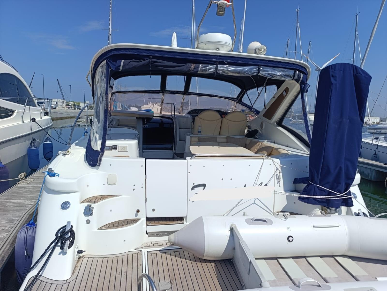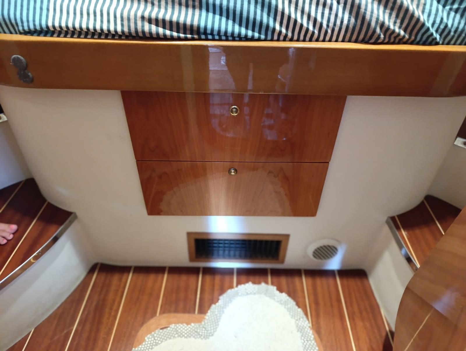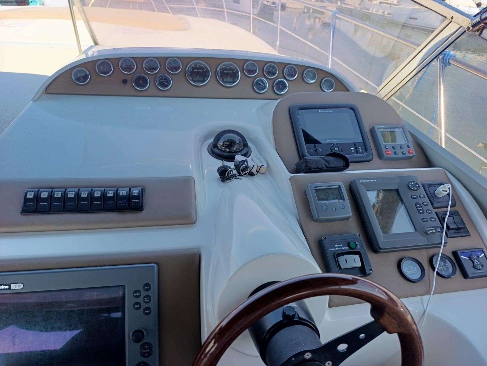 Alarme moteur, Eau sous pression, 5 Batteries (nuove 2025), Douche de cockpit, Phare de poursuite, 2 Flaps hydrauliques, Indicateurs de flaps, Lavabo dans le cockpit, Éclairage de courtoisie, Spots sous-marins, Passerelle (idraulica), Plateforme arrière, Pompe de cale automatique, Porte latérale, Prise de quai, Connexion eau sous pression à quai, Rollbar, Guindeau électrique, Echelle de bain, table de cockpit (abbattibile).