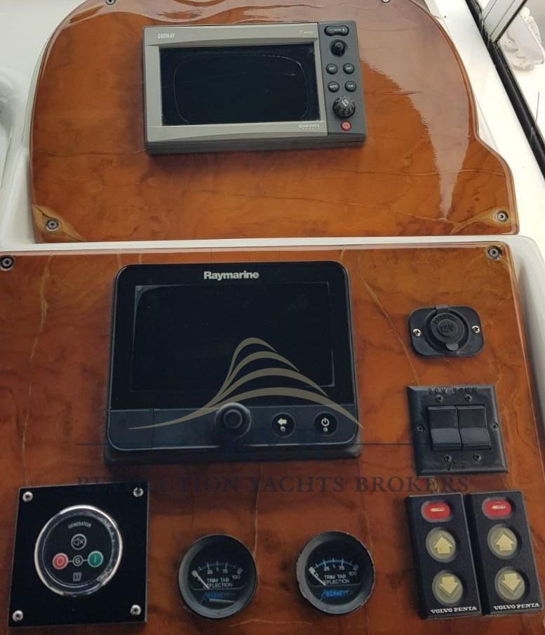 Batteries (4 BATTERIE NUOVE), Douche de cockpit, Flaps hydrauliques (N°2), Lavabo dans le cockpit, Éclairage de courtoisie, Passerelle (IDRAULICA), Plateforme arrière, Pompe de cale manuelle, Cockpit en teck, Prise de quai, Connexion eau sous pression à quai, Rollbar, Guindeau électrique, Echelle de bain, Selles pour Annexe, table de cockpit.
