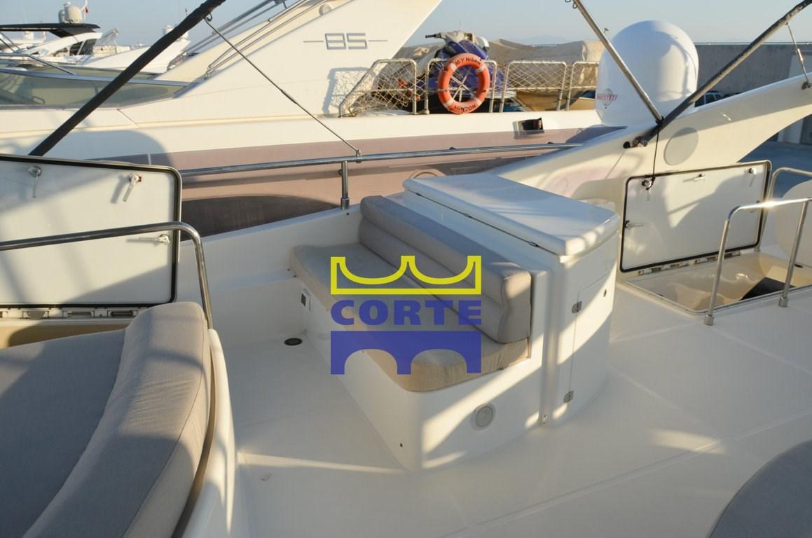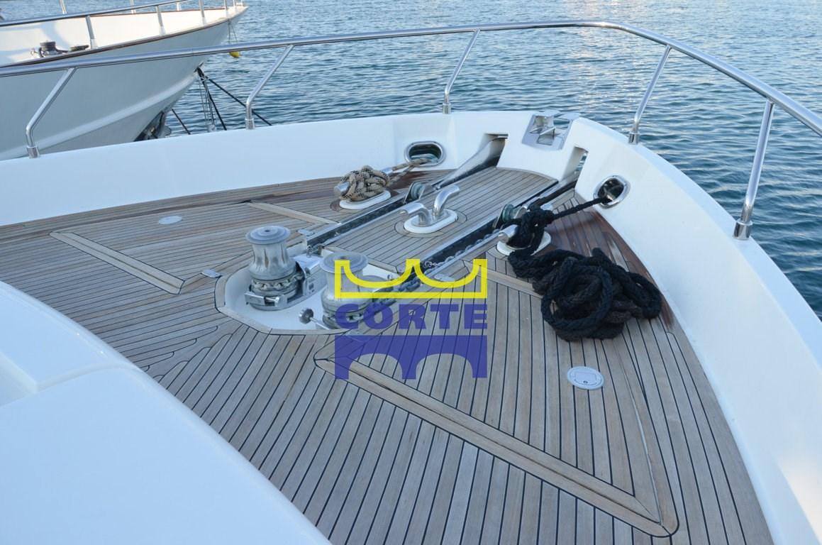 Alarme gaz, Alarme moteur, Alarme de pompe de cale, Ancre (tipo Bruce 50 Kg diff. da 30 Kg), Eau sous pression, 8 Batteries, Passavant en teck, Douche de cockpit, Double barre à roue, Flaps hydrauliques, Grue de flybridge, Extincteur(s) fixe(s), Éclairage de courtoisie, 2 Spots sous-marins (LED), Panneau solaire, Passerelle (elettroidraulica in legno teak), Plateforme arrière (in teak), Pompe de cale automatique, Porte latérale, Porte latérale, Cockpit en teck, Prise de quai, Connexion eau sous pression à quai, Répétiteur électronique, Rollbar, Guindeau électrique, Echelle de bain, Stabilisateurs (Anti RollingGyro), table de cockpit, Annexe, Corne, 2 Winch électrique arrière, 2 Winch électrique avant.