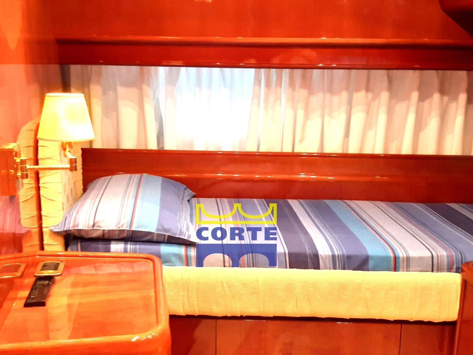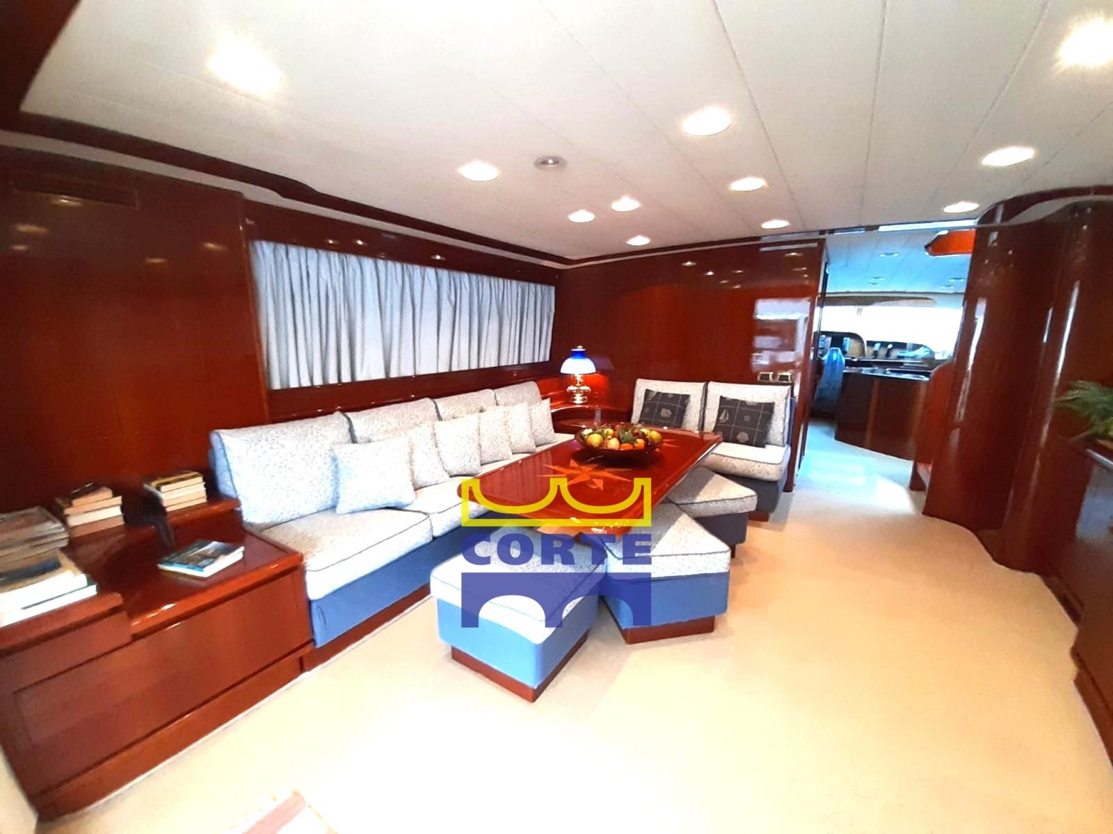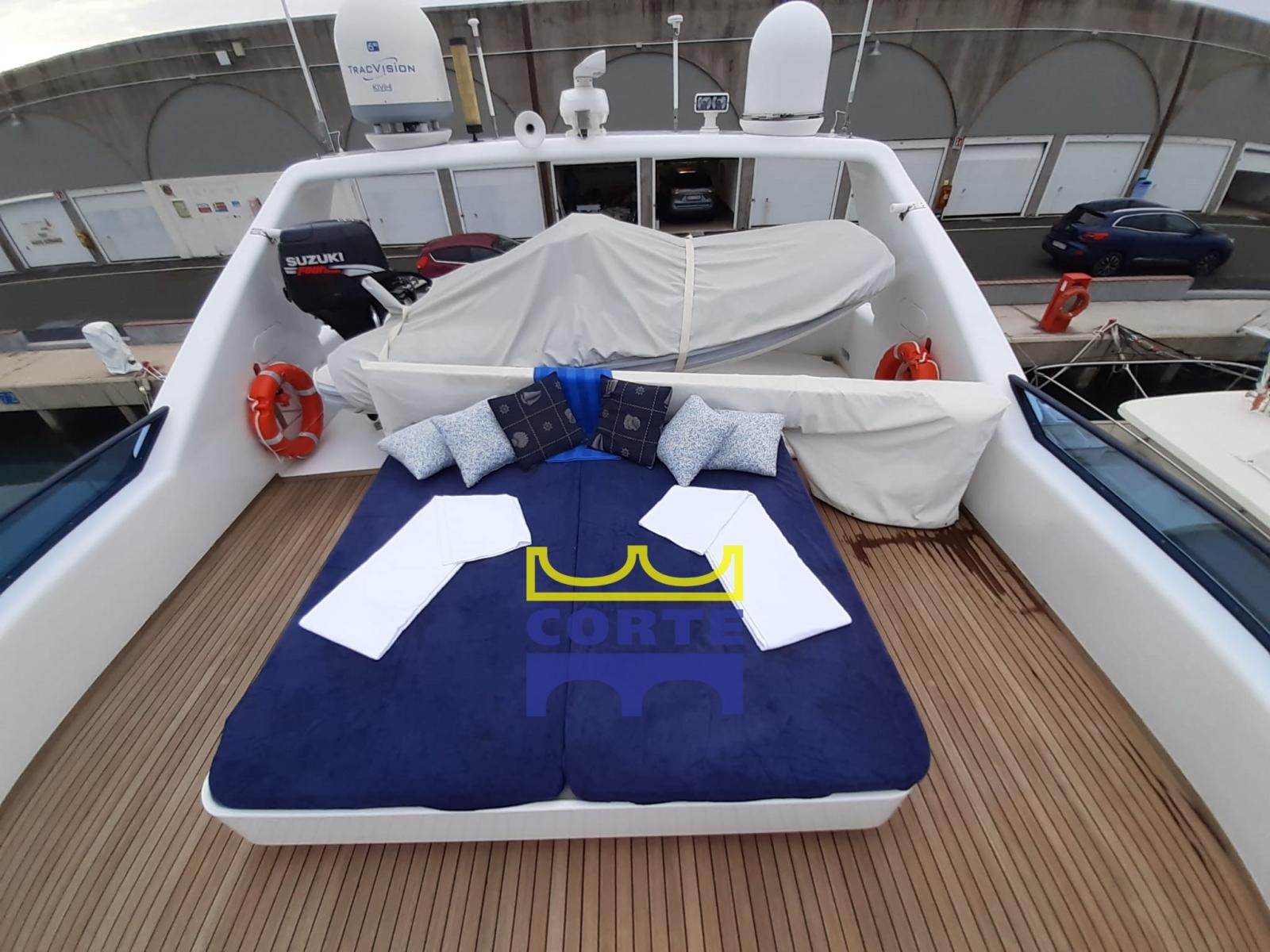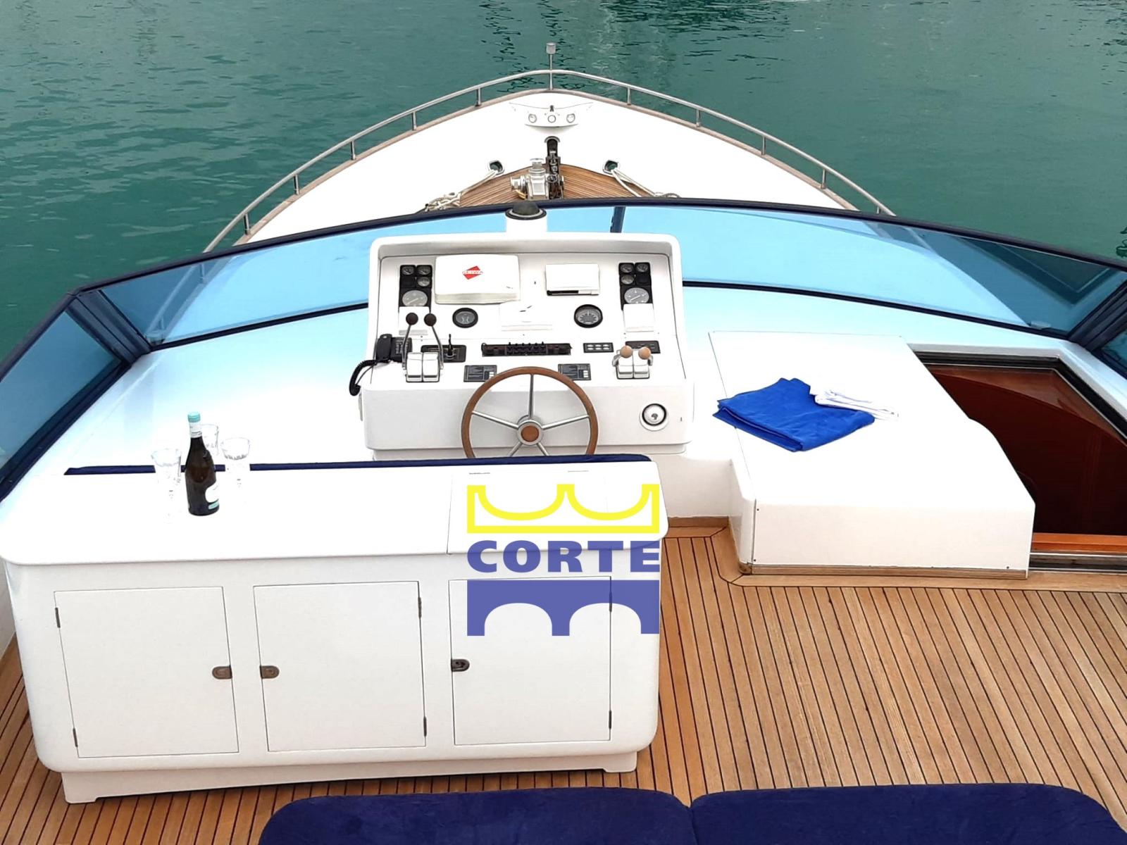 Alarme moteur, Alarme de pompe de cale, Eau sous pression (doppia), Batteries (motori 2021), Passavant en teck, Douche de cockpit, Double barre à roue, Flaps hydrauliques, Grue de flybridge, Extincteur(s) fixe(s), Éclairage de courtoisie, Passerelle (idraulica), Plateforme arrière (poppa a movimentazione up down), Pompe de cale automatique, Porte latérale, 2 Porte latérale, Cockpit en teck, Prise de quai, Connexion eau sous pression à quai, Répétiteur électronique, Rollbar, Guindeau électrique, Echelle de bain, table de cockpit, Corne, 2 Winch électrique arrière.