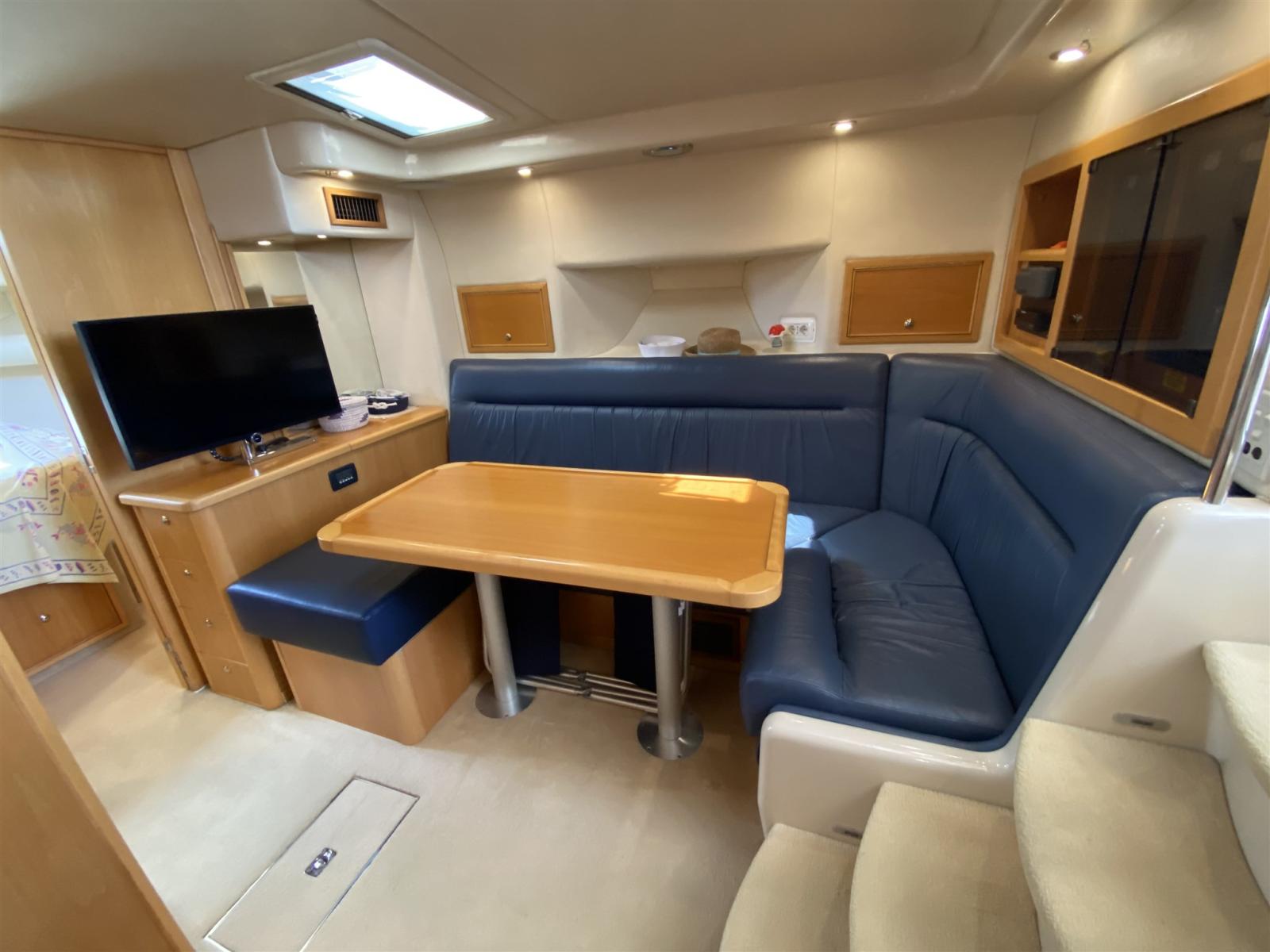 Alarme gaz, Alarme moteur, Alarme de pompe de cale, Ouverture du compartiment moteur électrique, Eau sous pression, Douche de cockpit, Phare de poursuite, Flaps électriques, Hard top, Extincteur(s) fixe(s), Éclairage de courtoisie, Passerelle, Plateforme arrière, Pompe de cale automatique, Pompe de cale manuelle, Porte latérale, Cockpit en teck, Prise de quai, Guindeau électrique, Echelle de bain, table de cockpit, Corne, Winch électrique arrière.