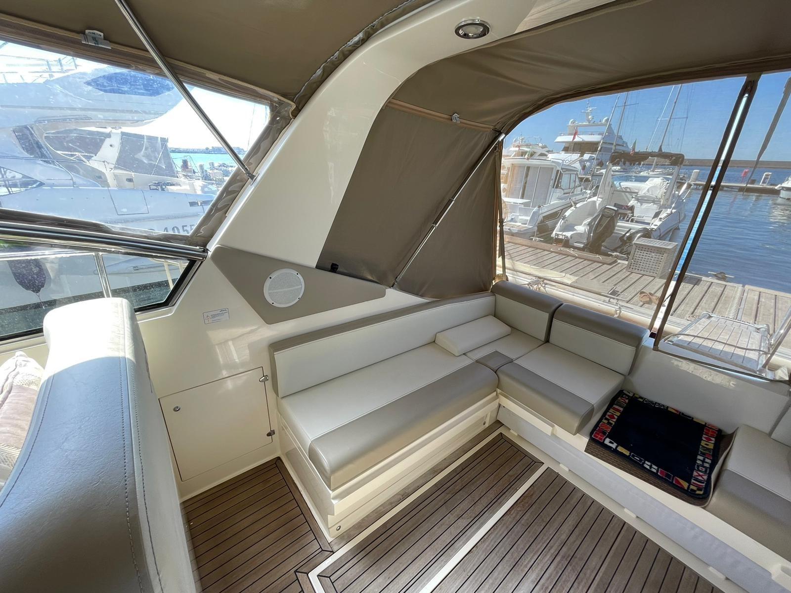 Alarme gaz, Alarme moteur, Alarme de pompe de cale, Ouverture du compartiment moteur électrique, Auto Dynamic Trim Interceptor, Eau sous pression, Douche de cockpit, Extincteur(s) fixe(s), Indicateurs de flaps, Lavabo dans le cockpit, Éclairage de courtoisie, Spots sous-marins, Passerelle, Pompe de cale automatique, Pompe de cale manuelle, Porte latérale, Cockpit en teck, Prise de quai, Connexion eau sous pression à quai, Guindeau électrique, Echelle de bain, table de cockpit, Table pliante de salon, Corne.