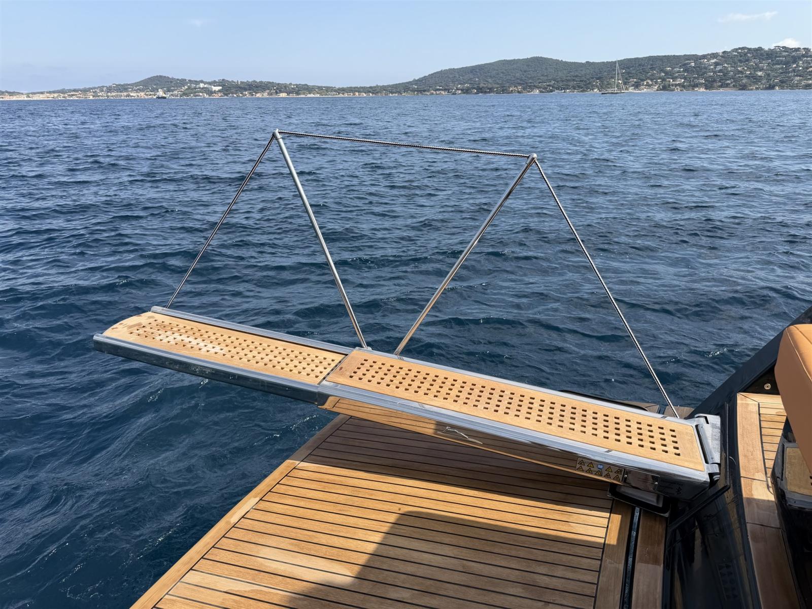 Pour encore plus de plaisir sur l’eau, le yacht est livré avec deux Seabobs dans une couleur personnalisée assortie à la coque, complétant parfaitement l’apparence exclusive du bateau. L’abordage et l’accès à la rive sont facilités grâce à la passerelle hydraulique, ajoutant à la fois confort et praticité au port
