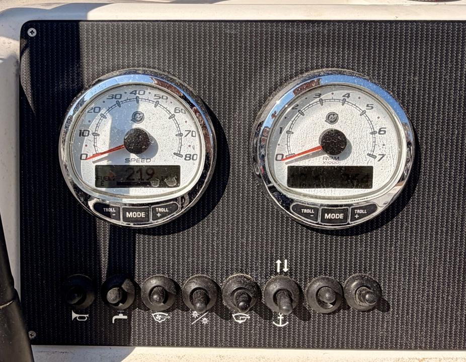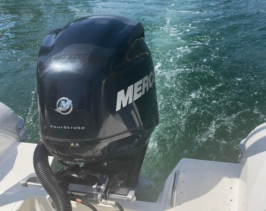 Motorisé avec un Mercury Verado 200, il offre une navigation dynamique avec une vitesse de pointe d’environ 40 nœuds, tout en restant confortable pour son gabarit.