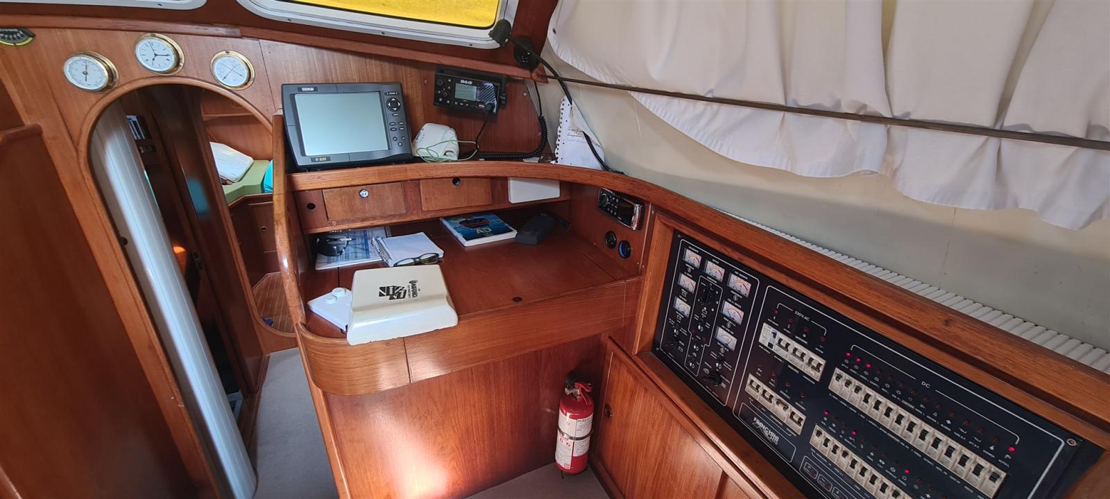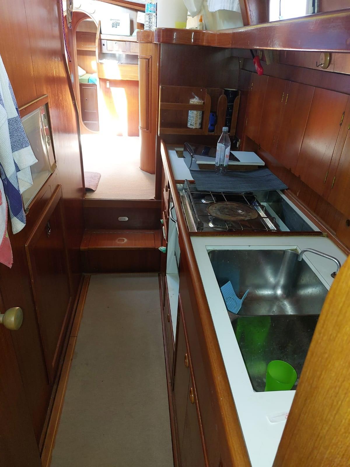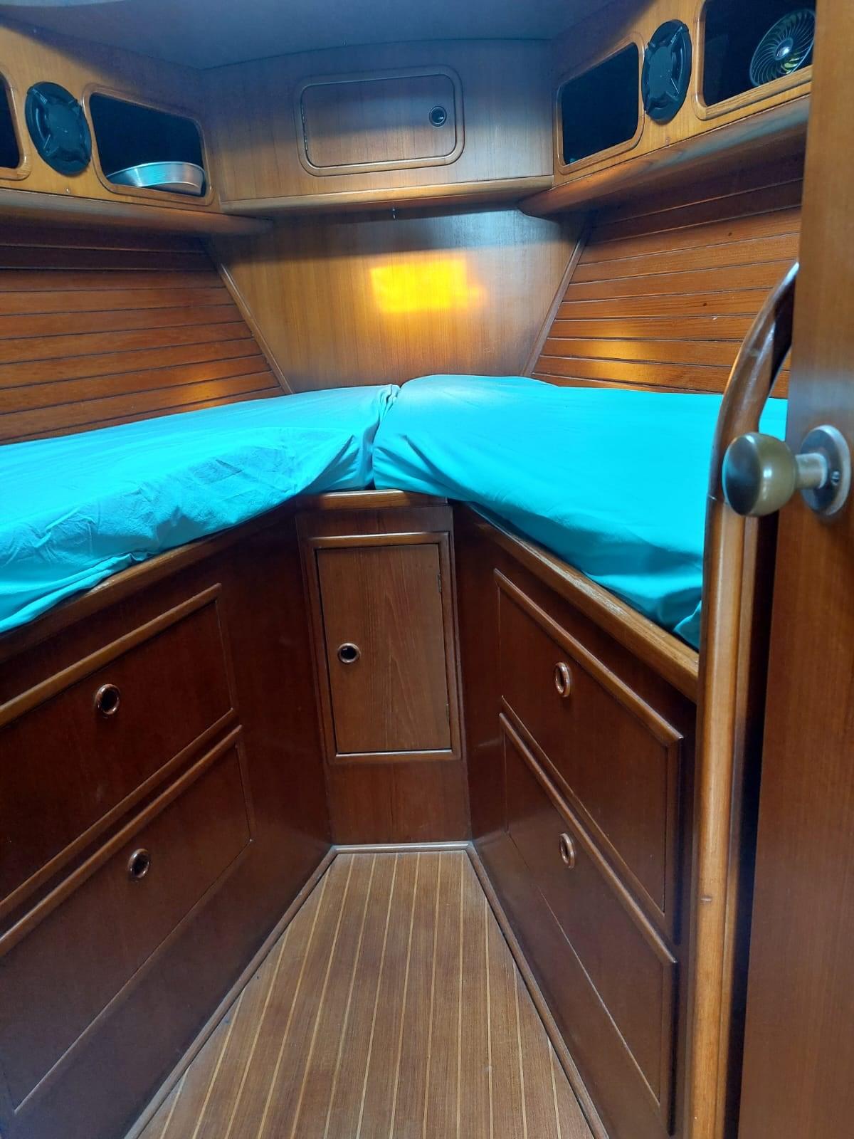 3 cabines avec deux salles de bain. une salle de bain avec une douche séparée. La cabine arrière est pleine poutre, la cabine avant est équipée d’une couchette double en V et la troisième cabine avec des lits superposés. Grande salle à manger. - Les chambres sont climatisées -
