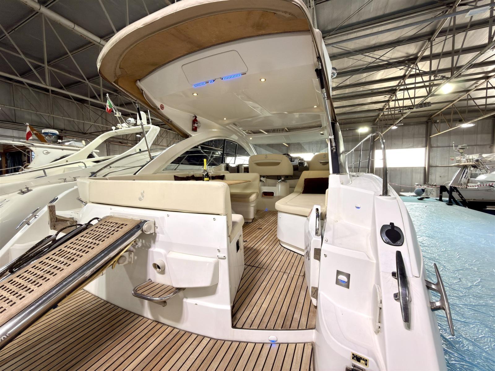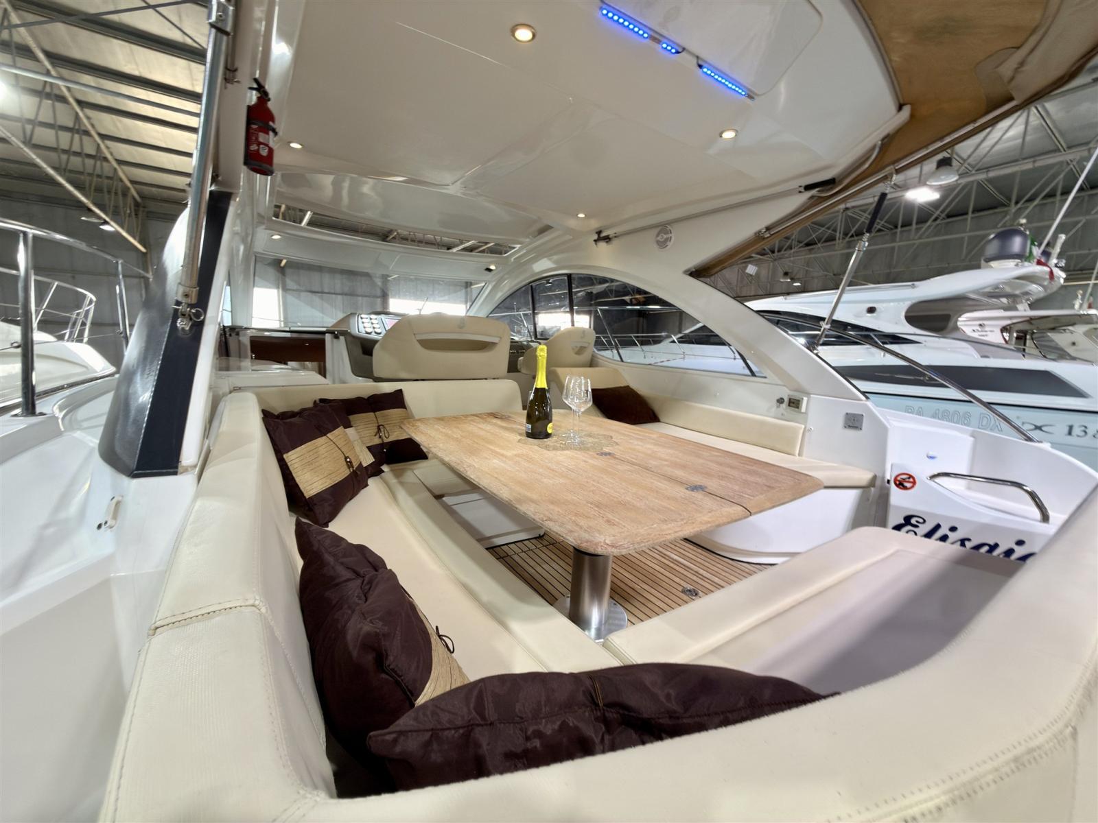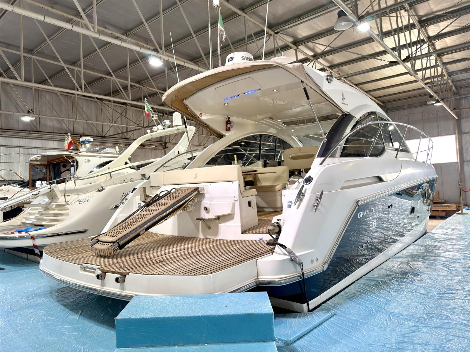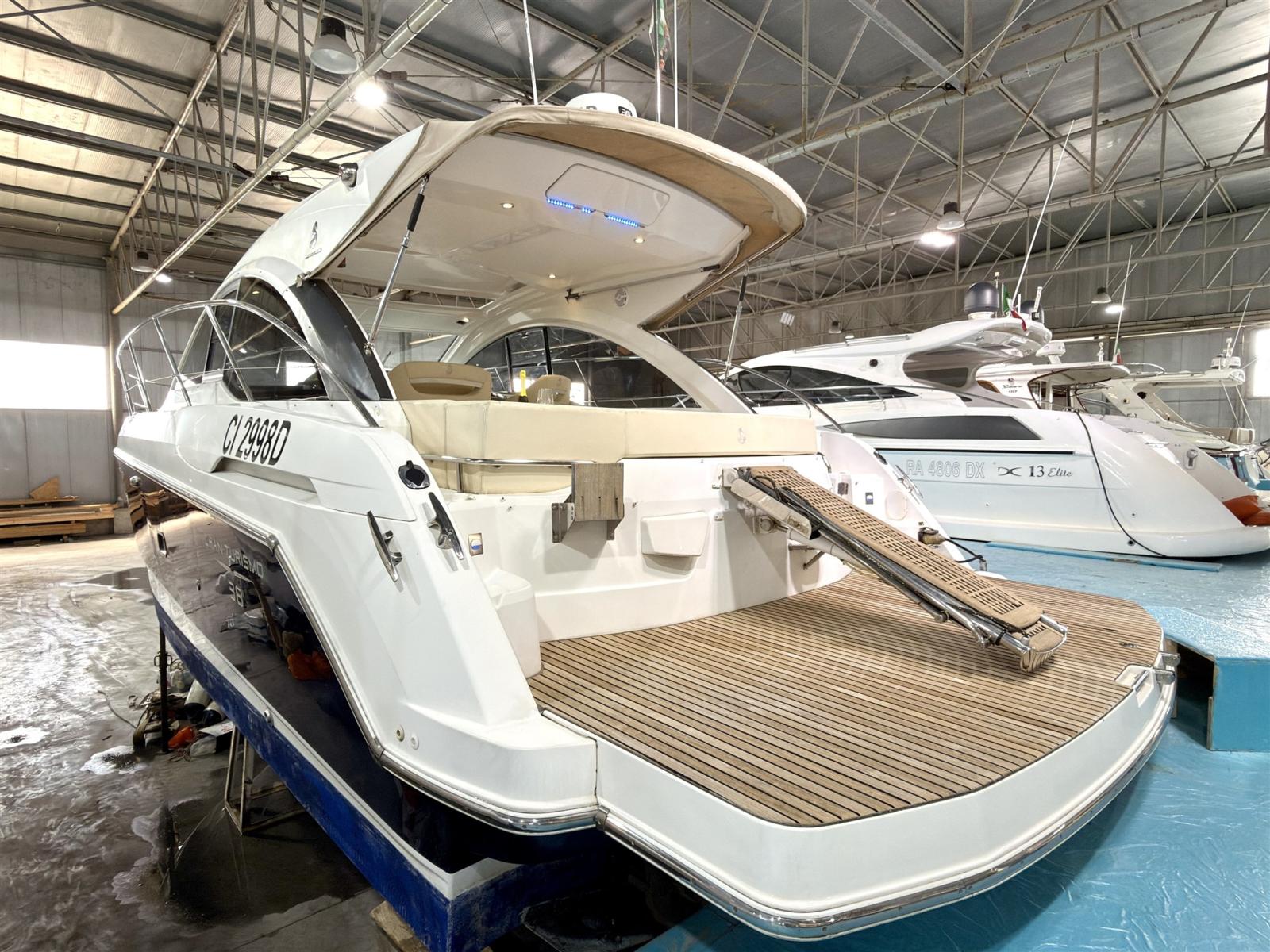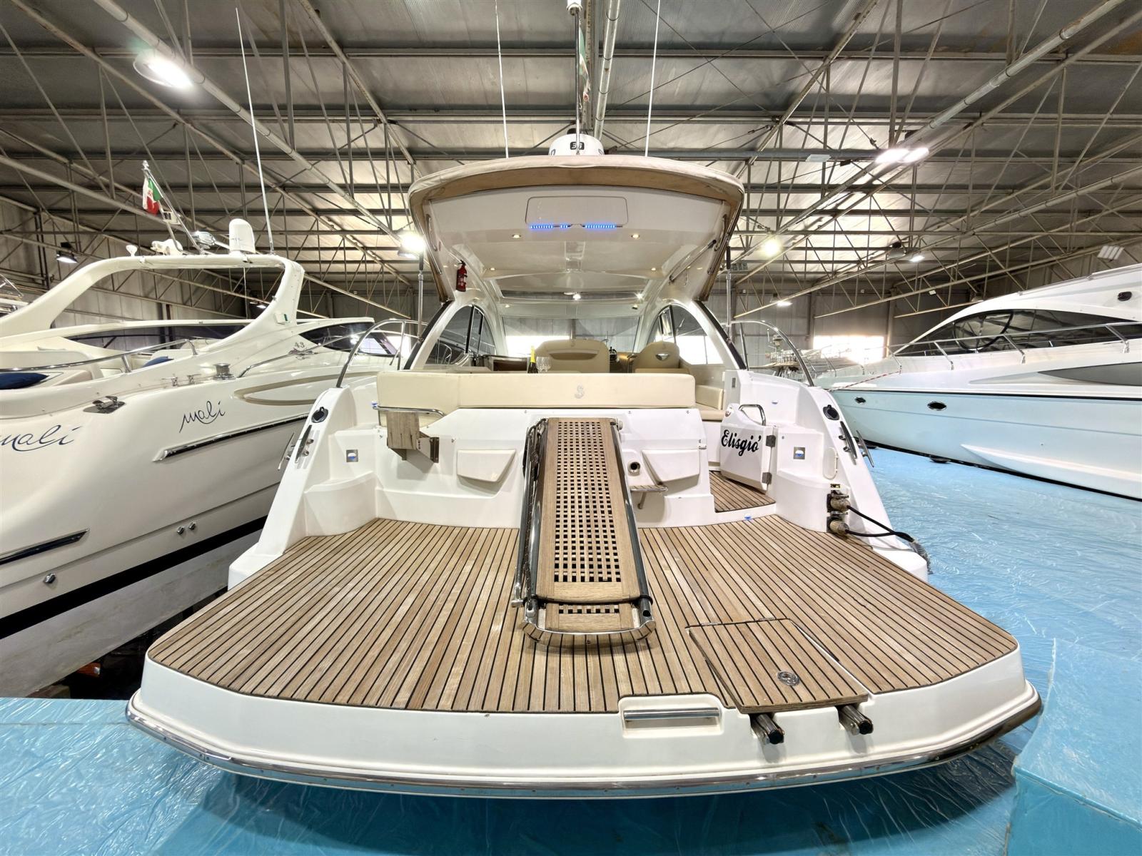 Couleur spéciale (Fiancate blu), Flaps électriques, Hard top (Apertura elettrica), Lavabo dans le cockpit, Spots sous-marins, Moniteur de batterie (e impianti), Passerelle (Idraulica), Plateforme arrière (Allungata con fondo in teak), Cockpit en teck, Guindeau électrique, Annexe (Honda non motore).