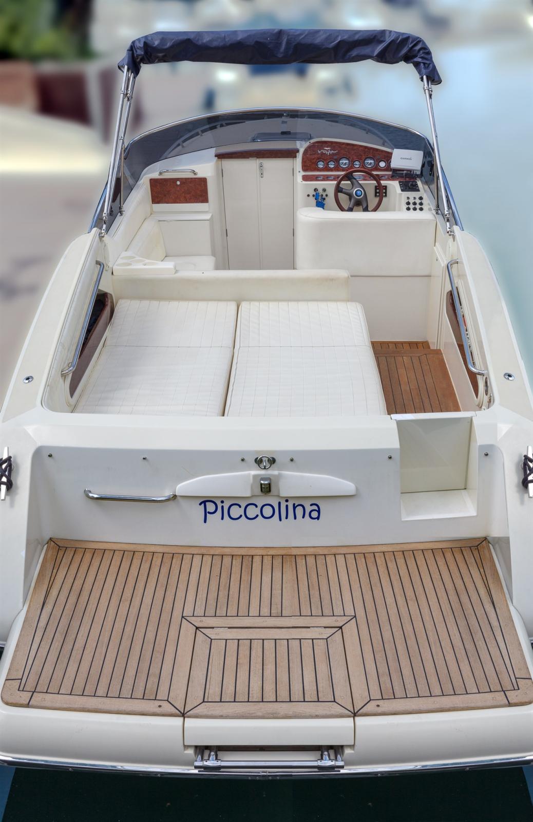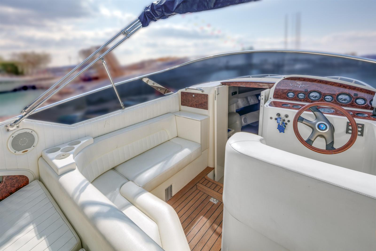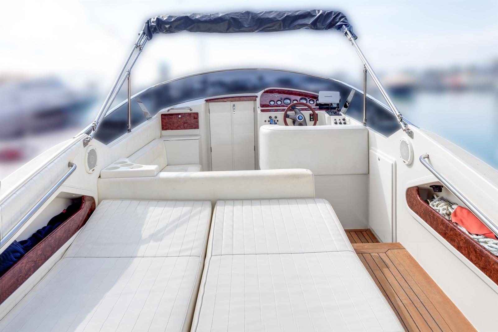 Le cockpit est équipé d’un poste de barre et d’un canapé d’angle, ainsi que de deux grands ponts solaires avec un tissu éponge bleu marine relatif qui reflète les couleurs du bateau.