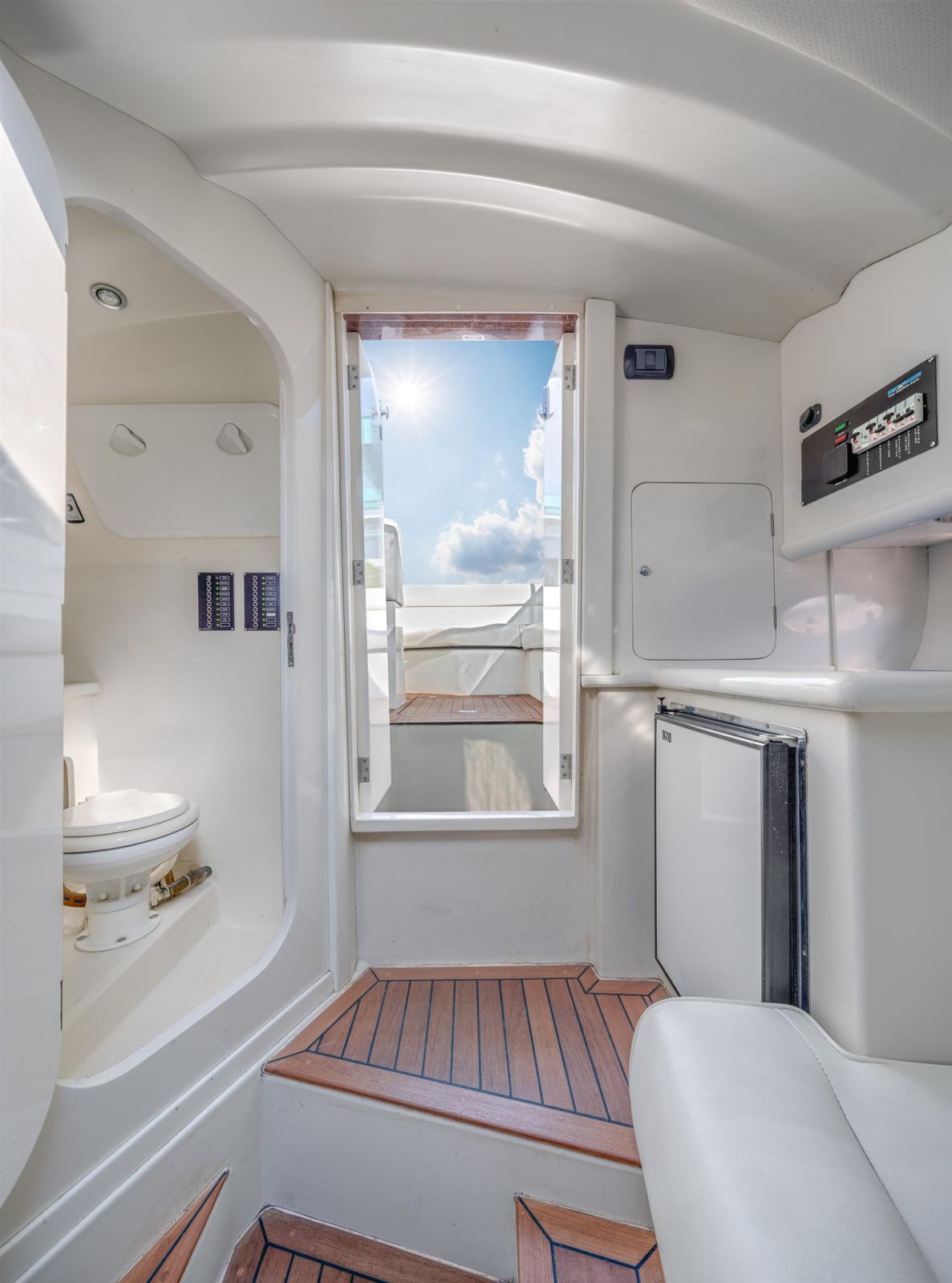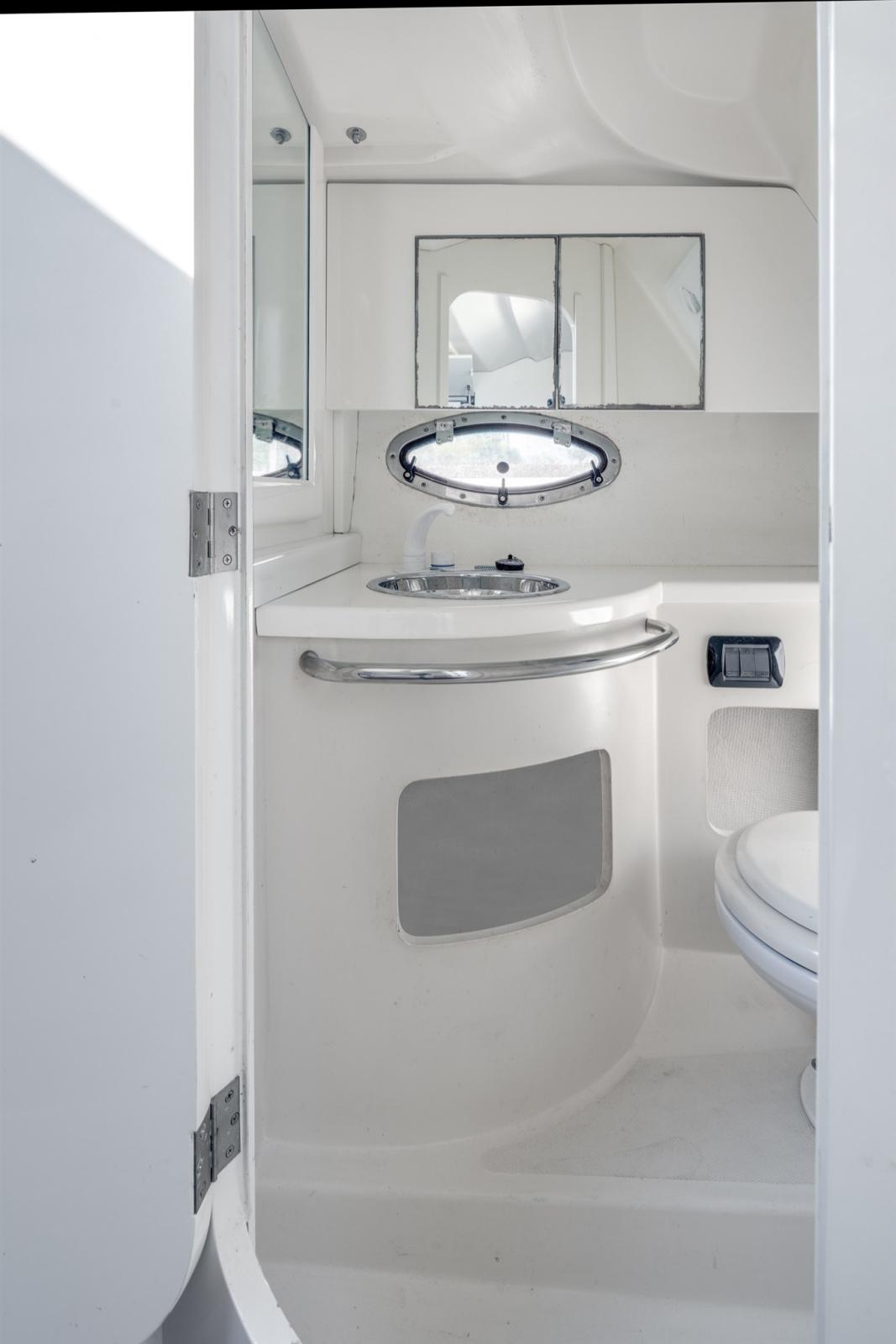 En dessous du pont, il y a une cabine spacieuse avec hauteur intérieure permettant de rester debout confortablement, un lit double, deux sièges latéraux (gauche et droite) et des toilettes séparées avec toilettes et lavabo.