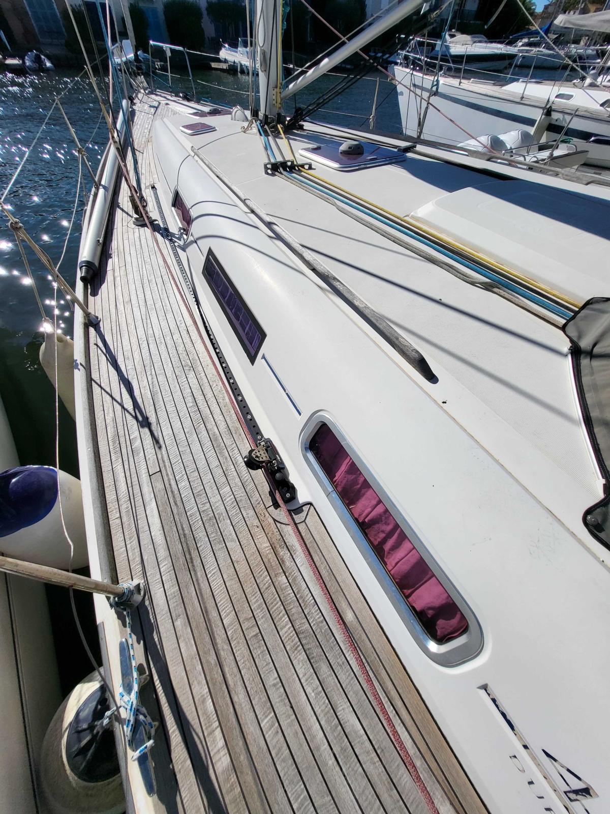 - Le génois n’est pas très vieux , remplacé il y a environ 4 ans , c’est un Génois de chez DELTA VOILES , la grand voile est une voile très solide à 2 Ris de chez ETTORE YACHTING , elle mériterait de passer à la machine , mais elle est en bon état et , très performante .