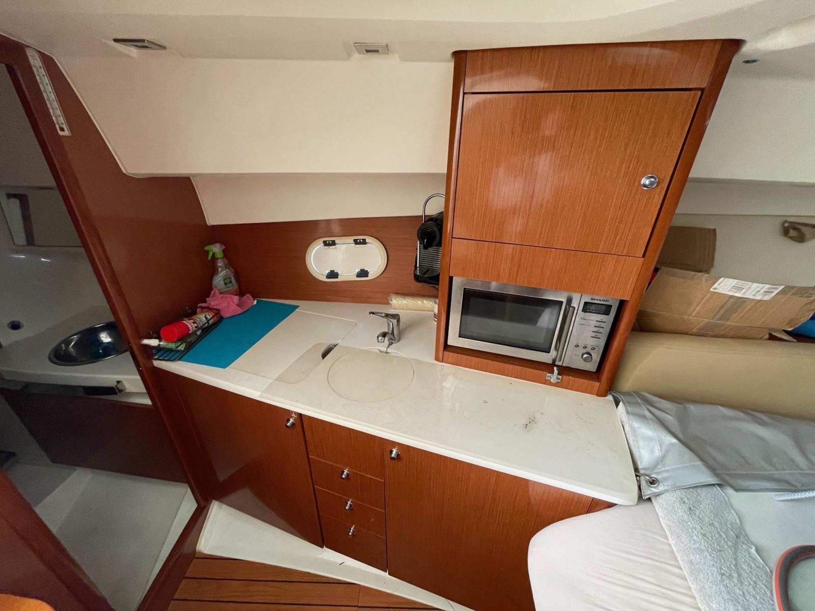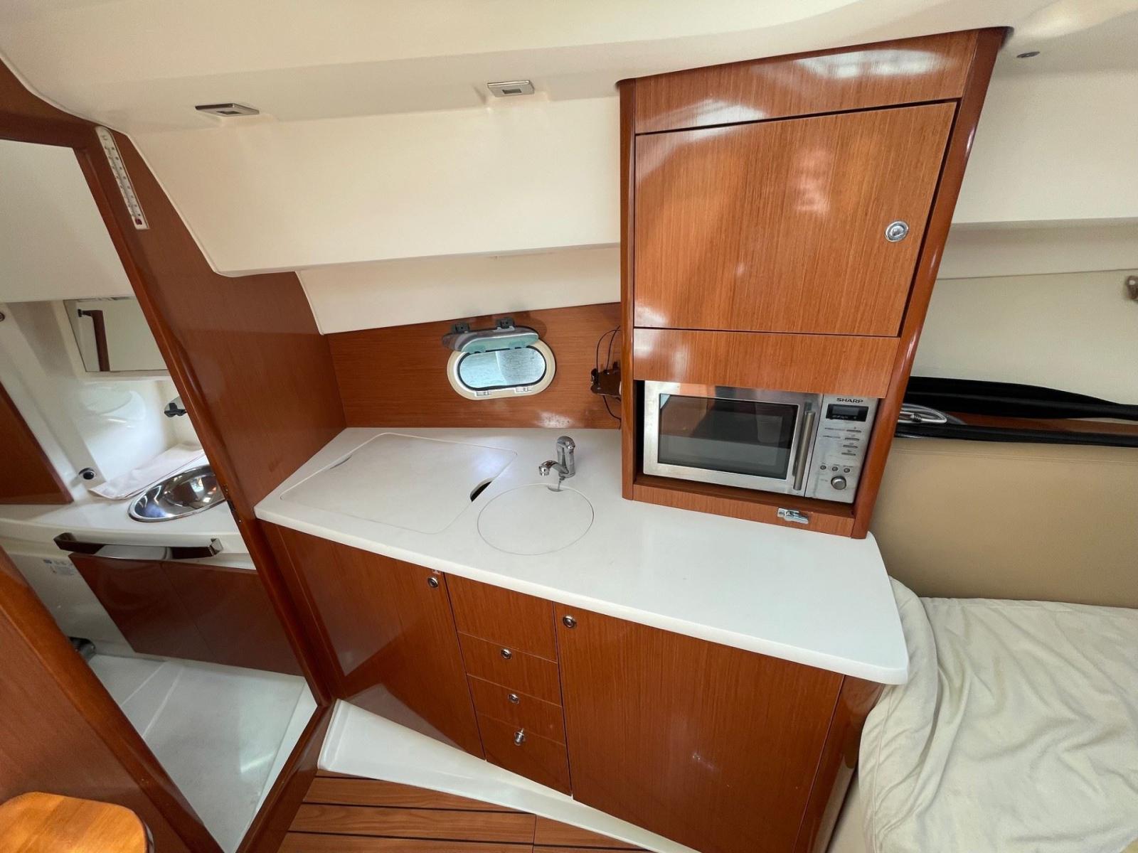 Aménagements : Malgré sa taille relativement petite, le Prestige 30 S offre des espaces de vie confortables pour des nuitées ou de courtes croisières. Nous accédons à bord par une plage de bain de belle superficie, pour passer tout de suite à un carré en U (sur tribord) et à une banquette (sur bâbord). A l’intérieur nous retrouverons une cabine bien aménagée, une cuisine, une salle de bain et un coin salon transformable en couchage.