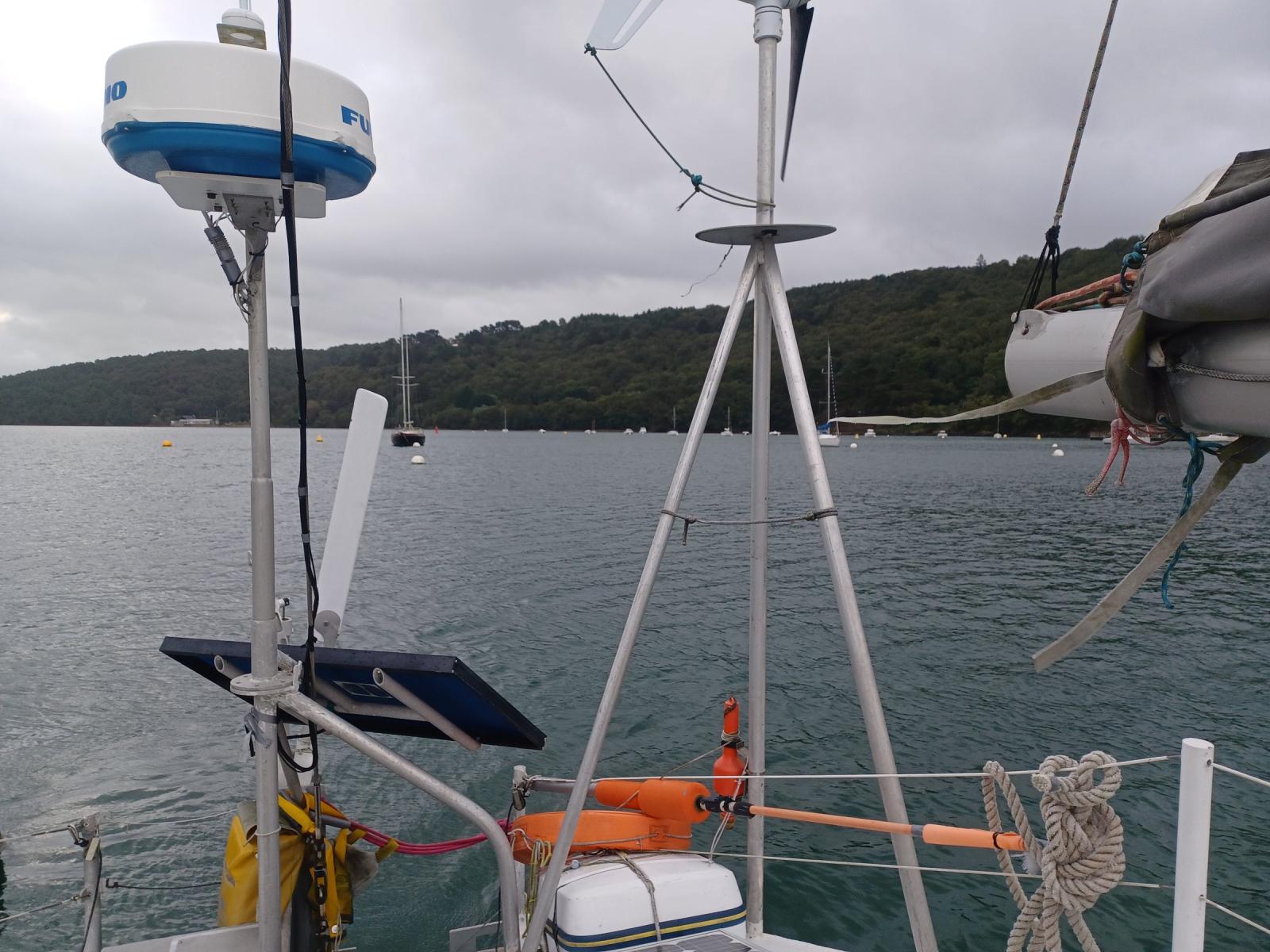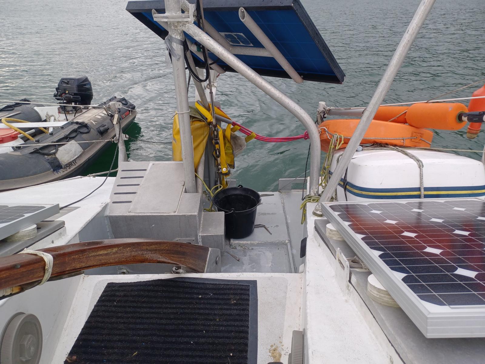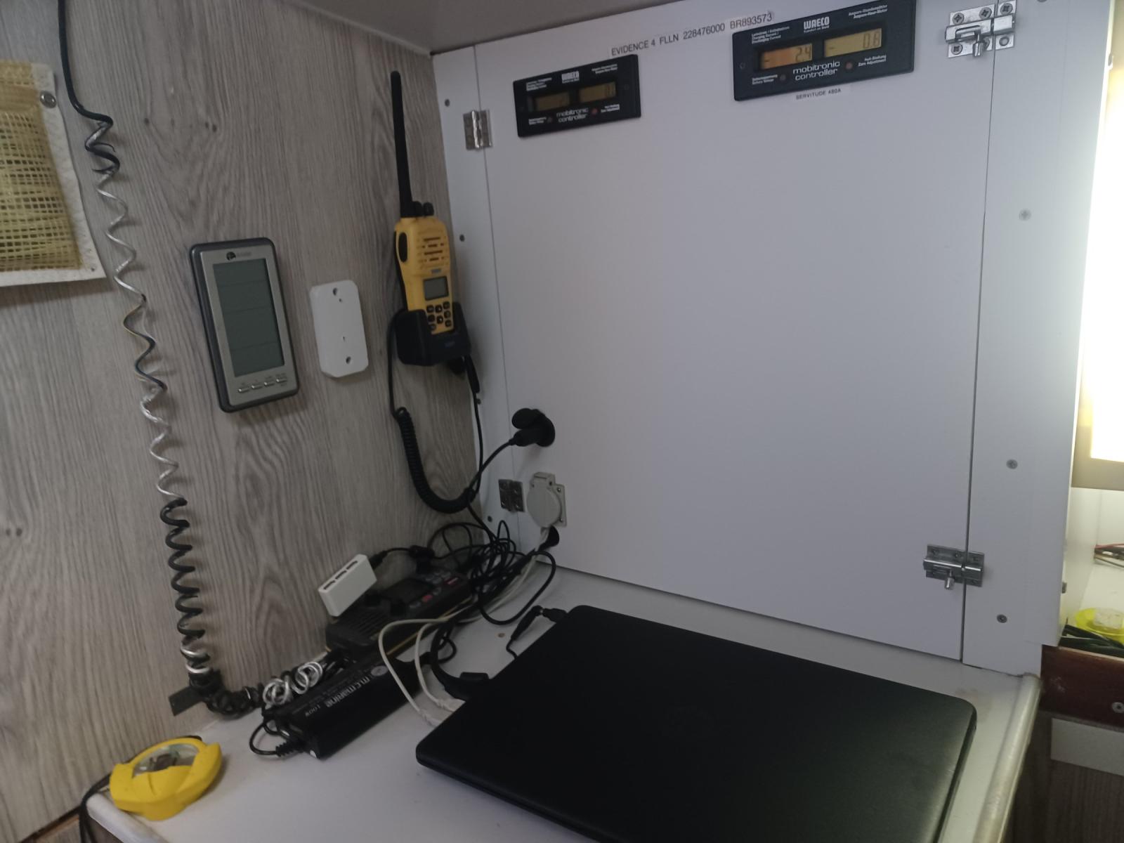 ÉNERGIE : 1 éolienne, 4 panneaux solaires (2 X 50W + 1 X 100W + 1 X 130W), régulateur de charge MPPT, chargeur de quai Dolphin 40A, convertisseur 12V/500W, 2 gestionnaires de batteries.