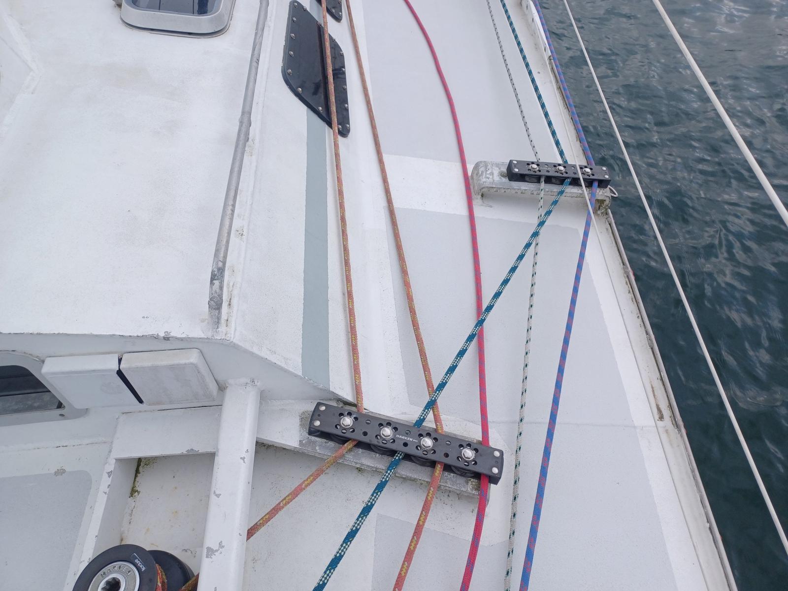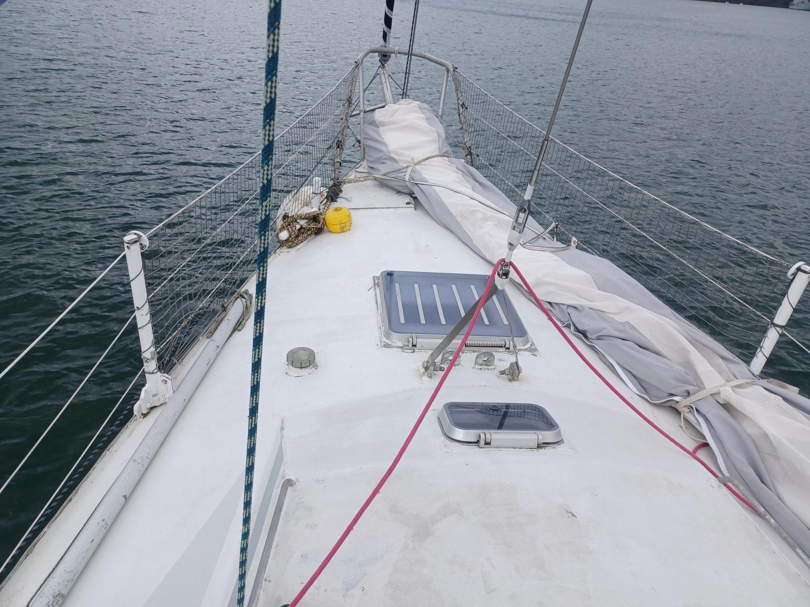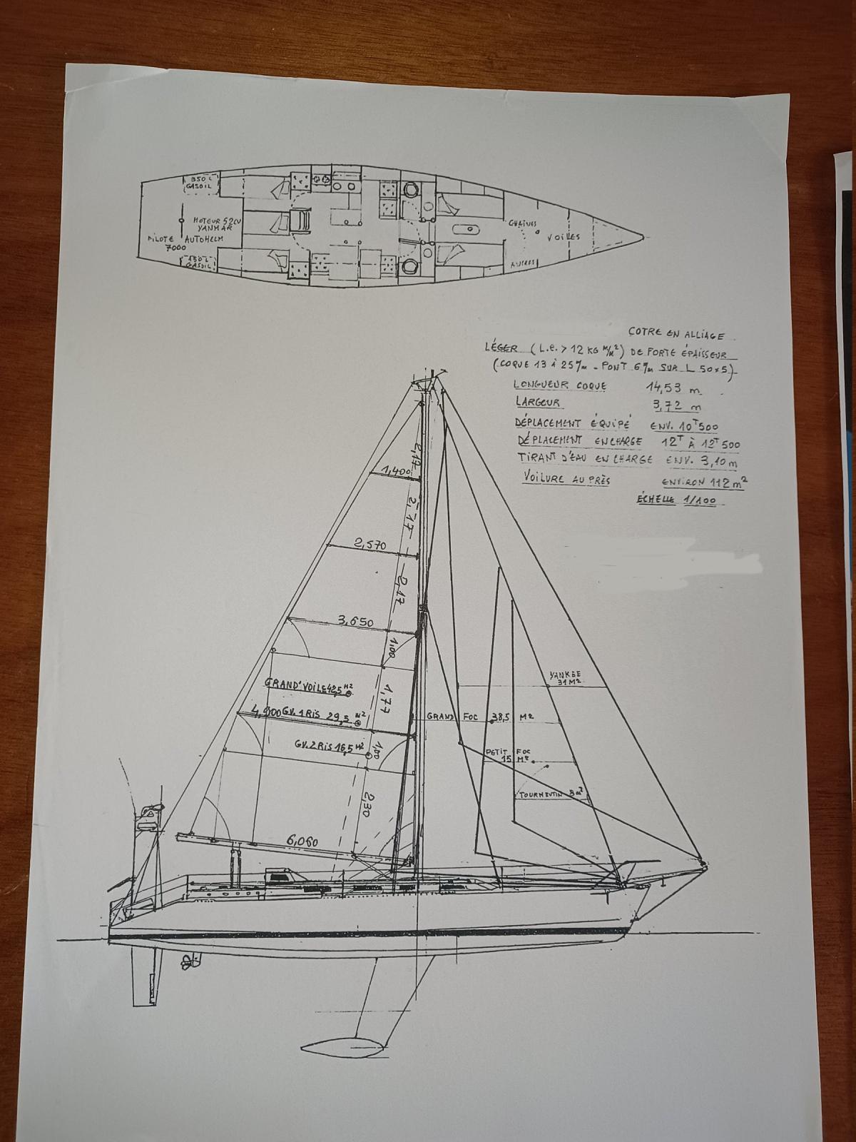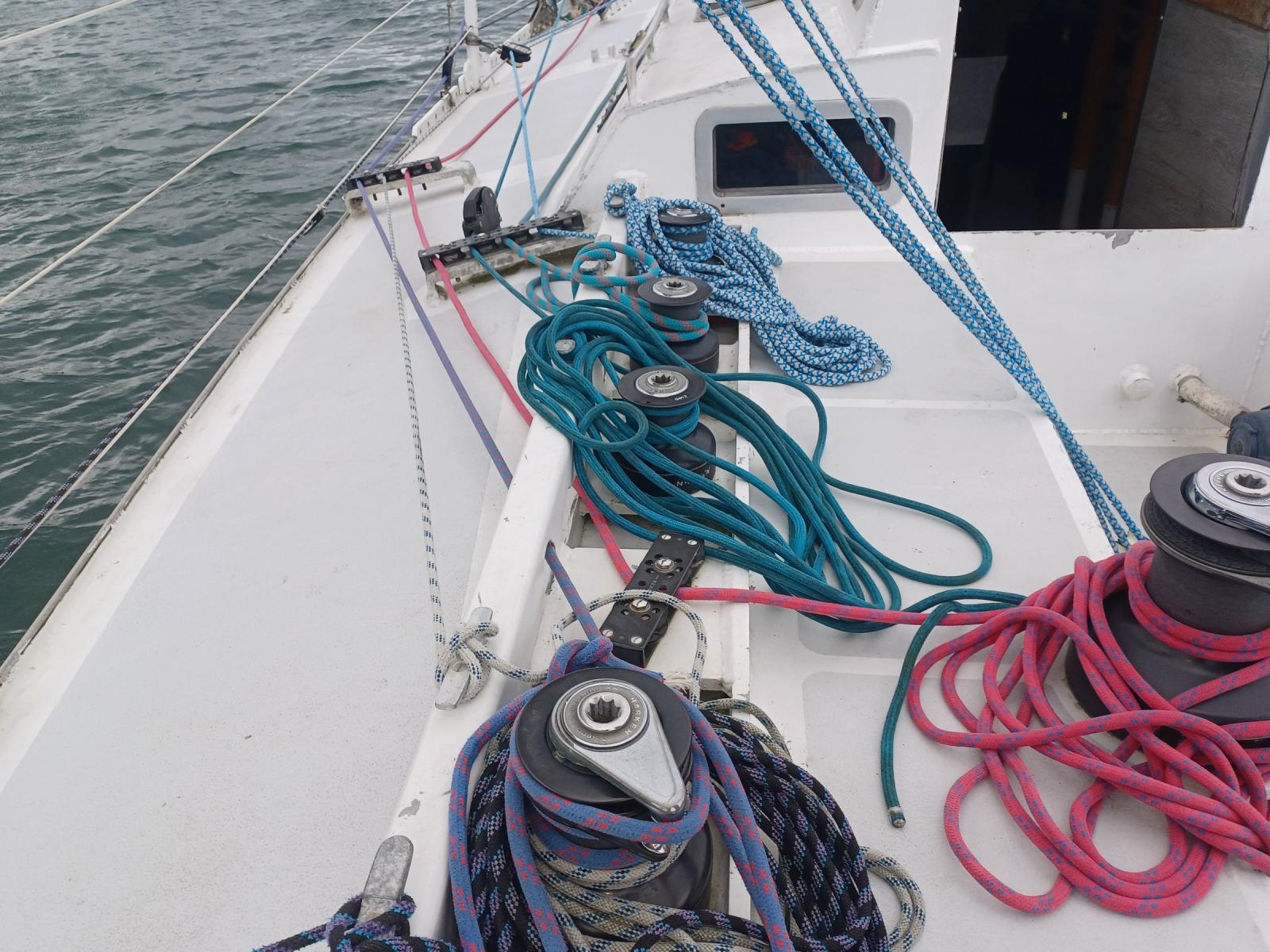 VOILES : 1 GV neuve (2024) 2 ris sur chariots, yankee (2023) sur enrouleur, solent 1 ris avec sac banane, inter, tourmentin.