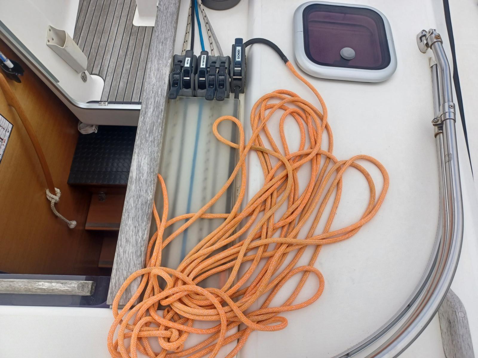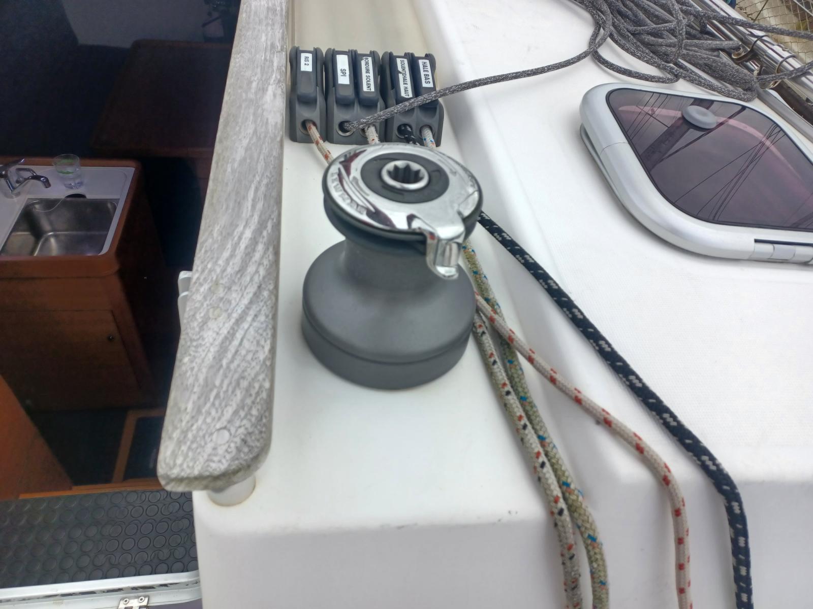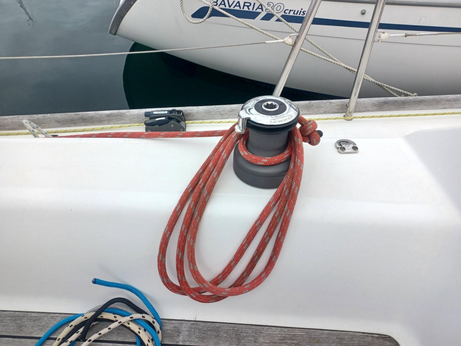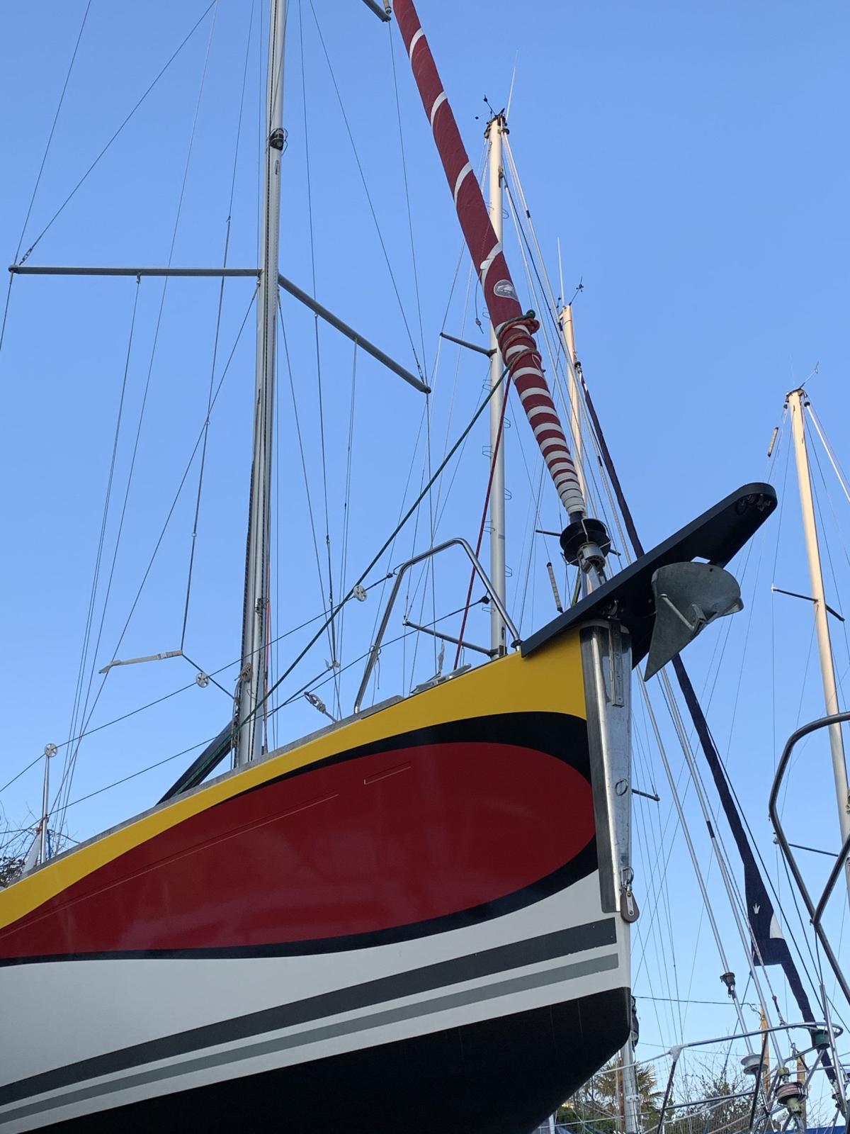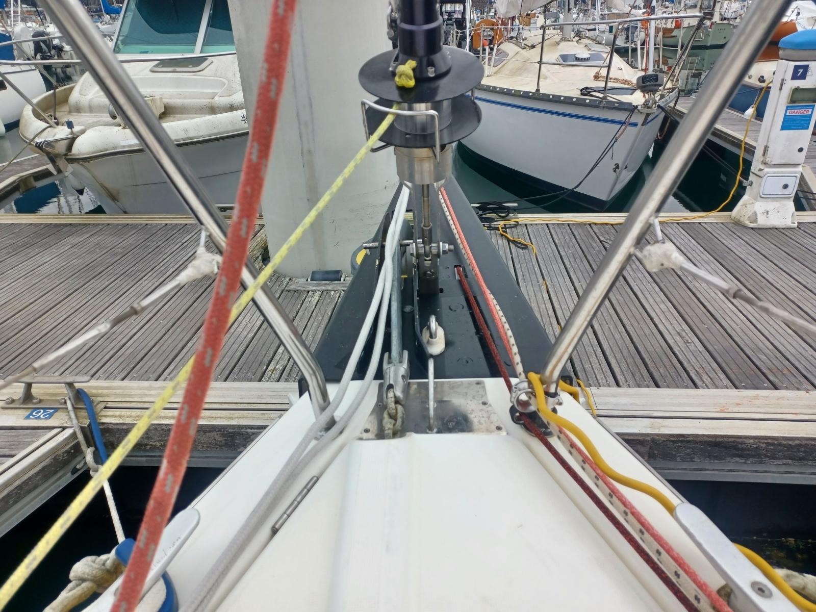 VOILES : 1 GV à corne 3 ris DCX, 1 génois, 1 solent à ris avec sac banane, gennaker sur spi asy avec chaussette, emmagasineur spi symétrique avec chaussette.