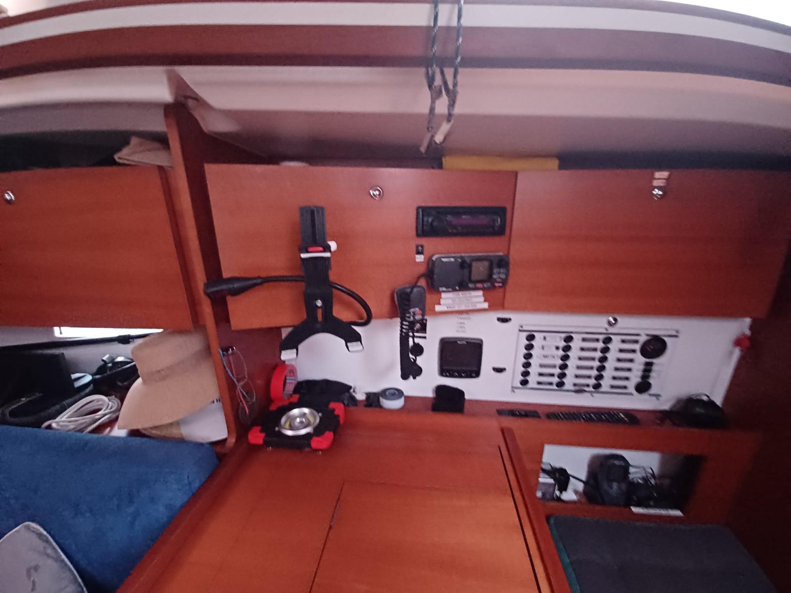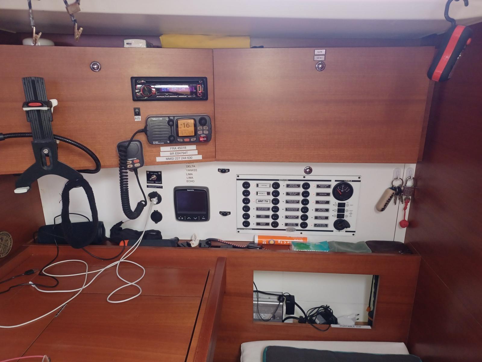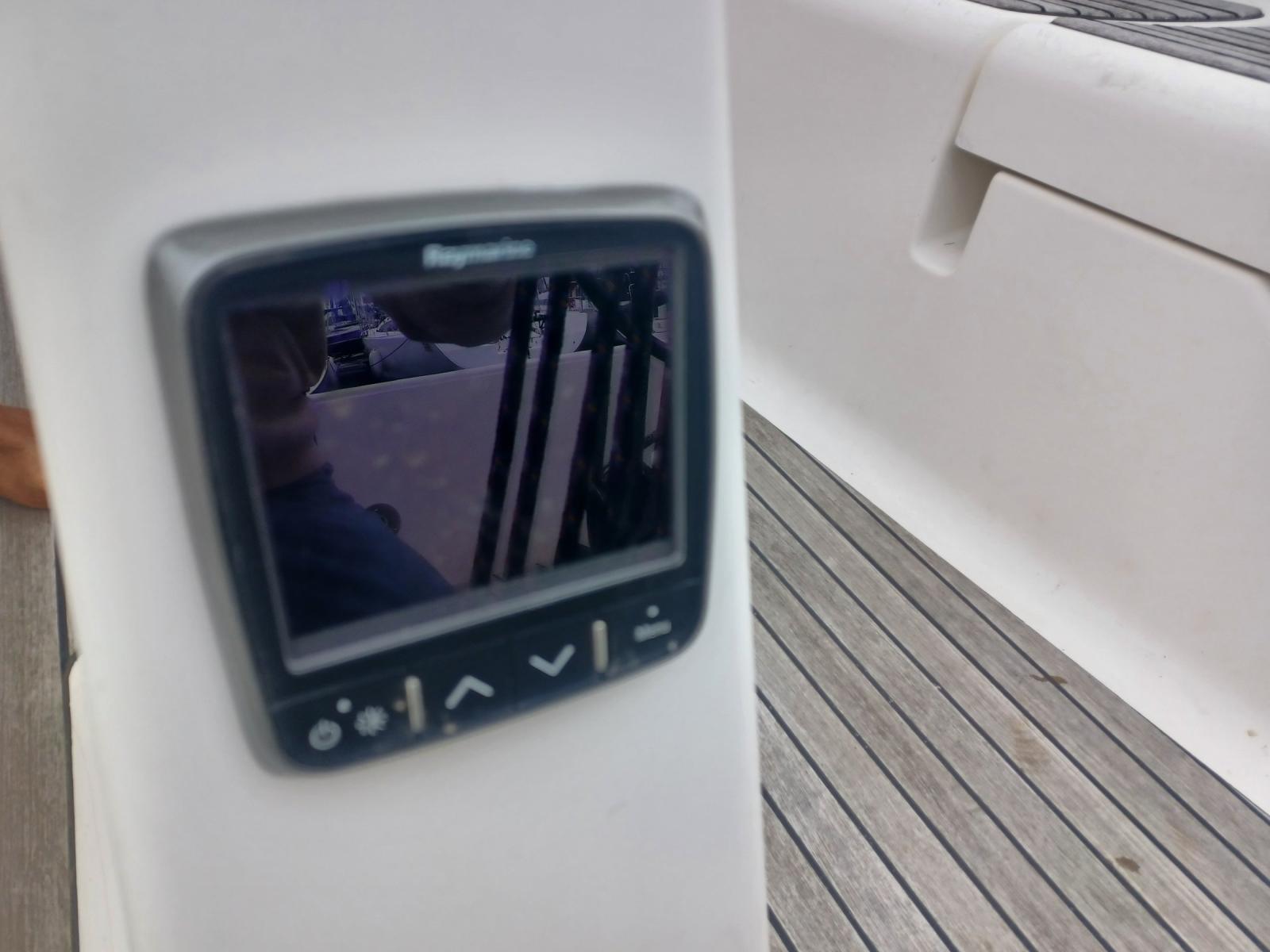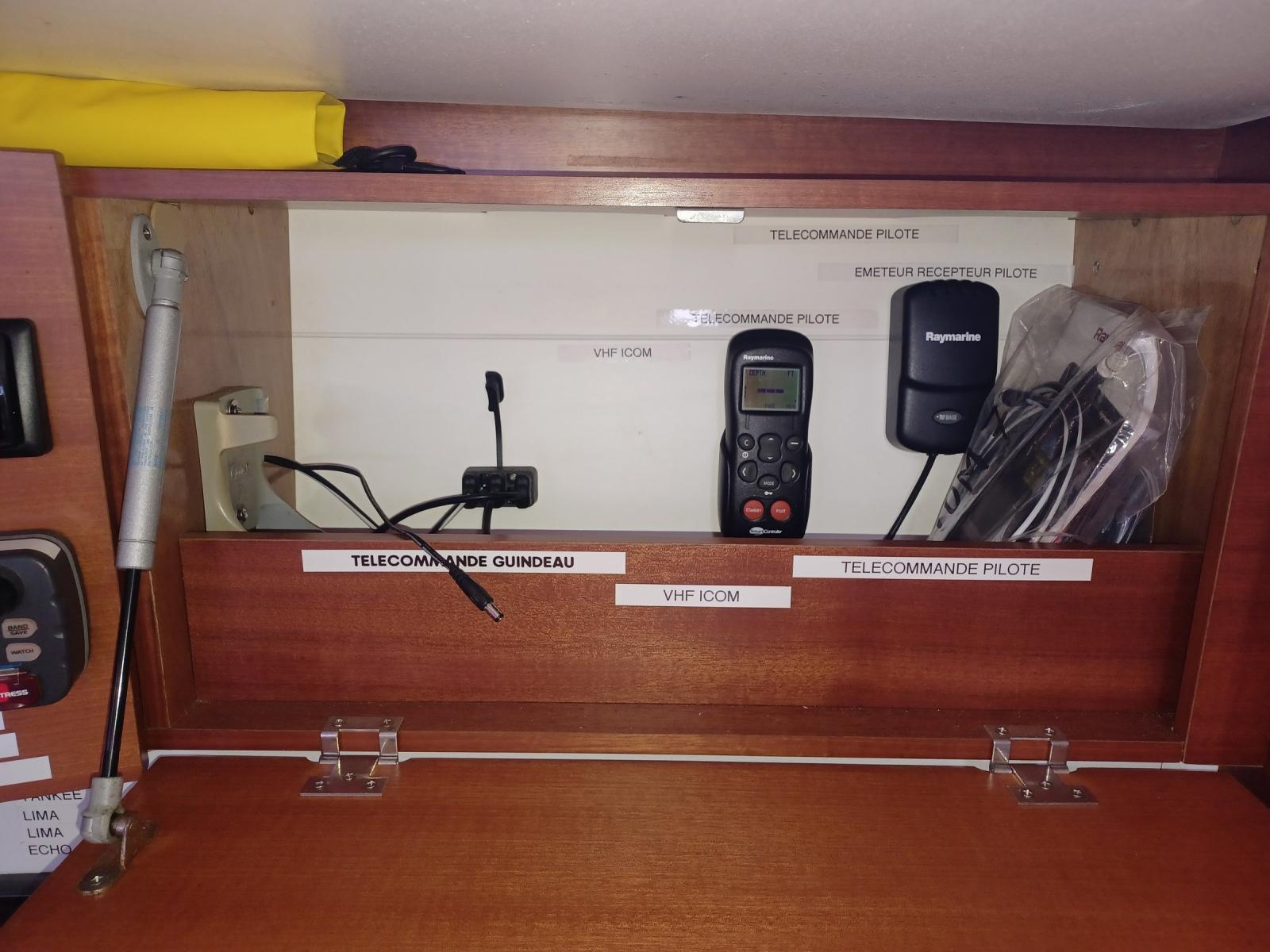 ÉLECTRONIQUE : Pilote auto Raymarine X30 Smart Pilot avec vérin électrique et télécommande, loch/sondeur/girouette/anémo Raymarine, répétiteur table à cartes Raymarine I70, AIS Class B Raymarine, Traceur Raymarine AXIOM, VHF Navicom RT650, lecteur CD Kenwood.