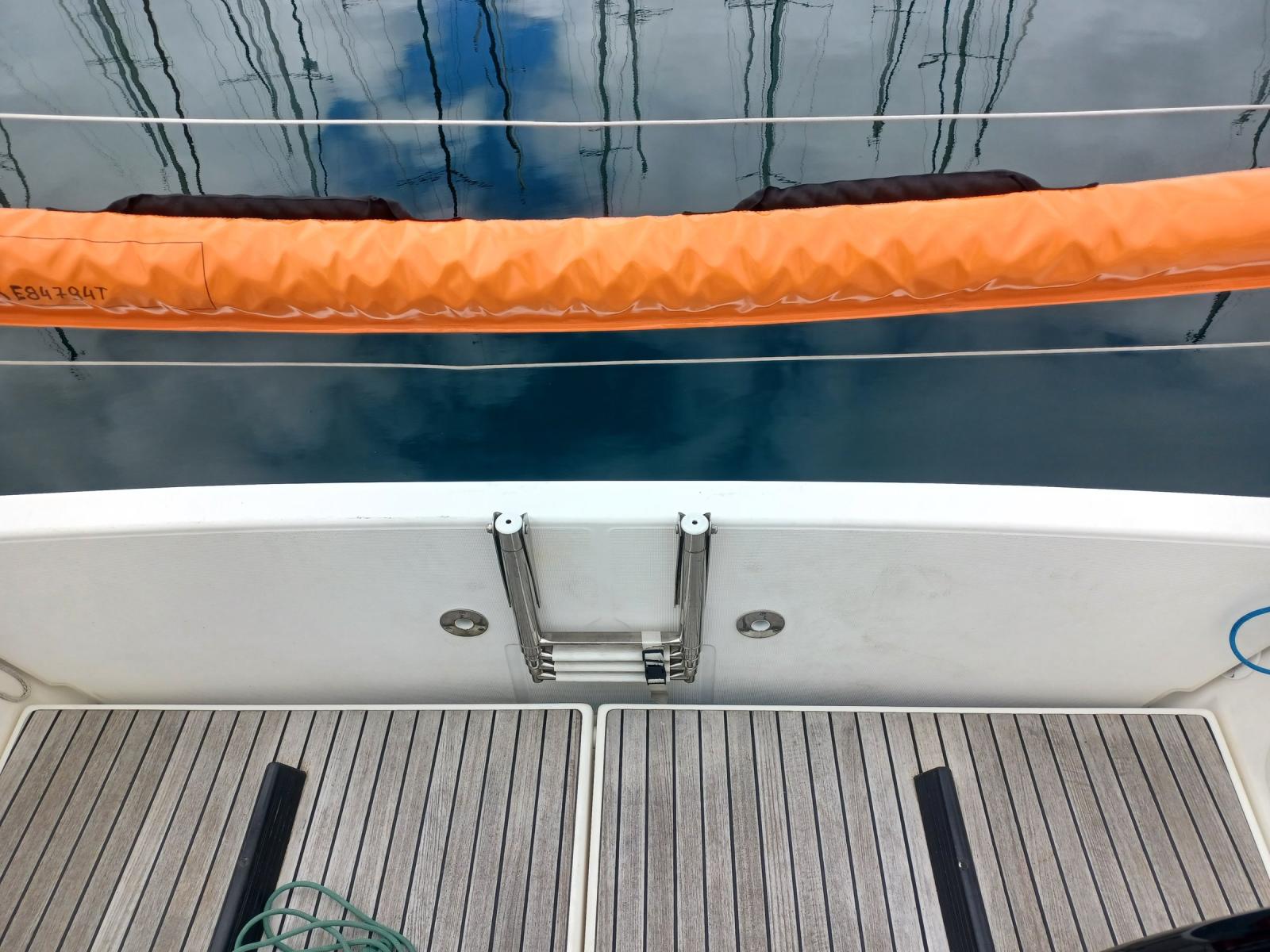 Annexe Bombard, hors-bord, bossoirs inox, capote de roof, double poste de barre, jupe amovible, échelle de bain.