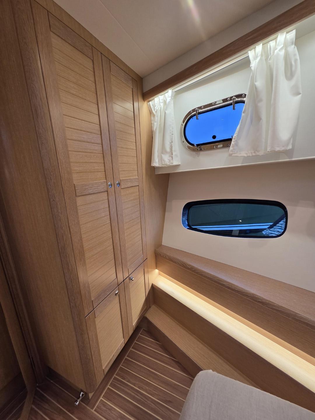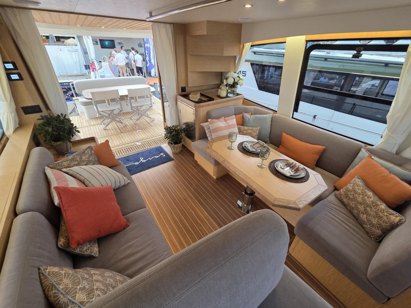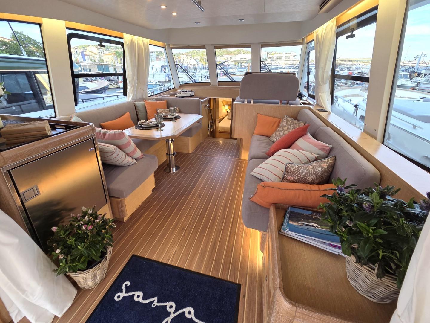 À l’intérieur, l’ambiance reflète le savoir-faire et l’esprit méditerranéen du chantier Sasga Yachts. Les finitions raffinées, les boiseries claires et la luminosité naturelle créent une atmosphère chaleureuse.