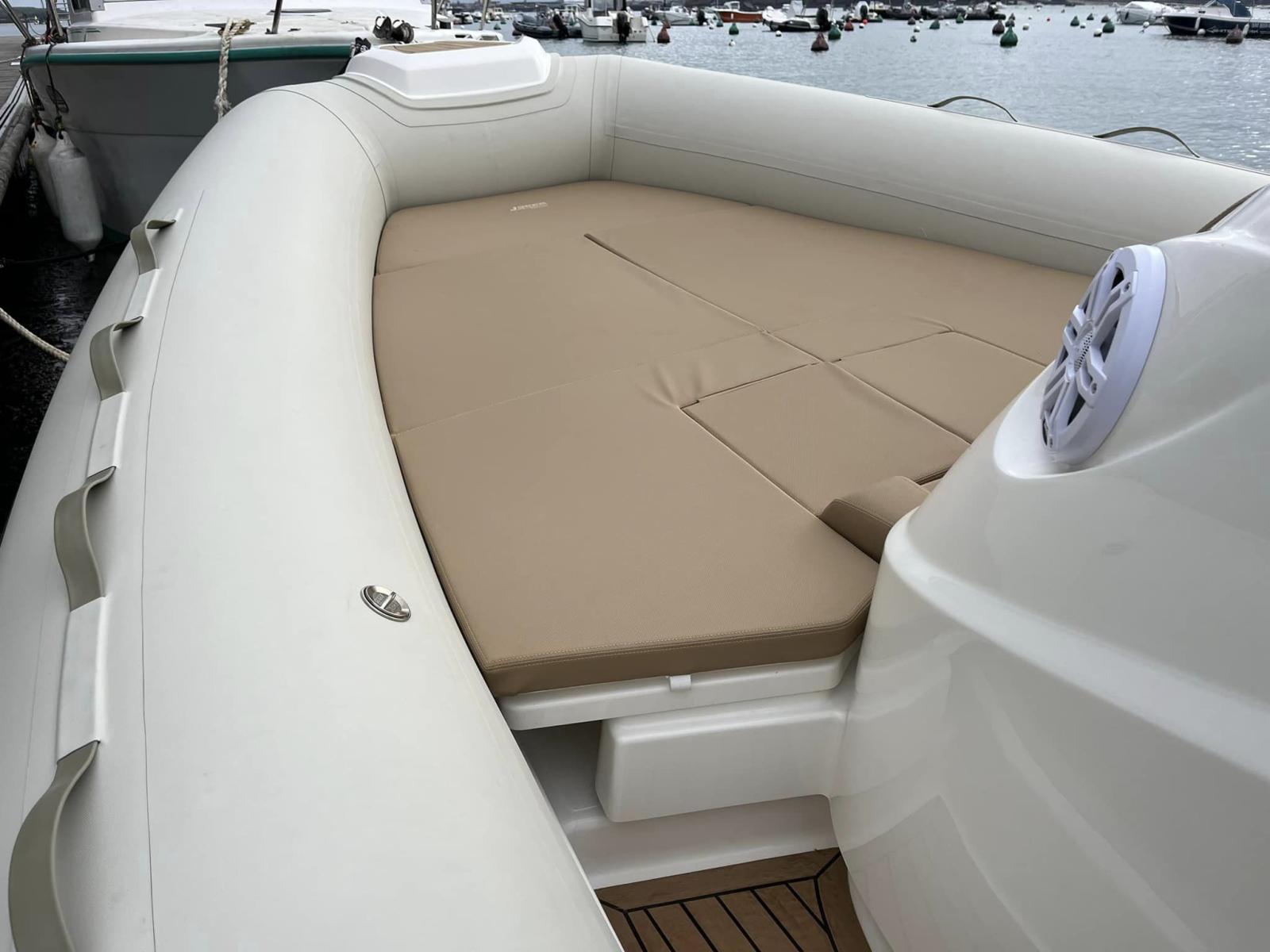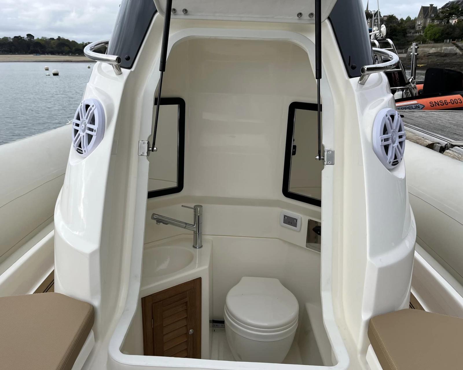 Cockpit en flexiteek, rollbar en fibre de verre + taud de soleil, guindeau électrique, GPSMAP 1223xsv, VHF Garmin 215i, système de douche et WC électrique dans console, housse de console et siège pilote, bain de soleil avant/arrière, système audio Fusion, équipement de sécurité côtier 6 personnes, kit mouillage complet.