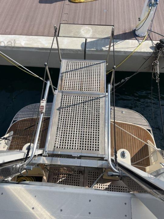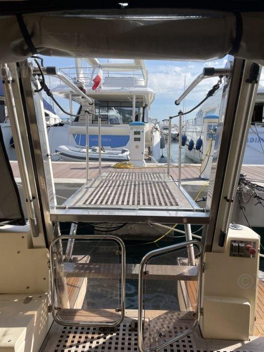 XBOAT ref :51.Je vends ma vedette sealord 446, modèle UNIQUE sur le marché. Specialement équipé dès l origine par le chantier d un système élévateur et telescopique pour un accès sécurisé et aisé au cockpit d’une personne à mobilité réduite depuis n’importe quelle hauteur de quai et/ou au flybridge. Ce système est aussi prévu pour être immergé pour la baignade. Une plate forme est également opérationnelle à l’intérieur pour l’accès à la cabine avant depuis le carré. Réservoirs eaux noires et eaux grises présents à bord mais non raccordés.