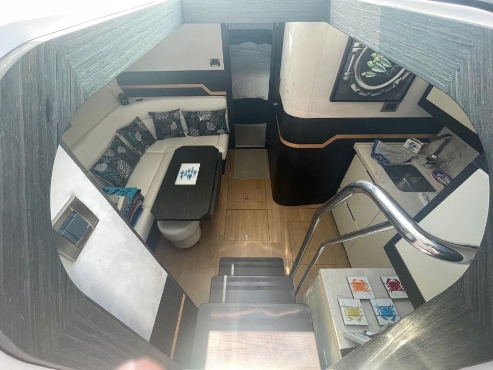 À l'intérieur, le Galeon 405 HTL propose un espace de vie spacieux et lumineux, grâce à de grandes fenêtres panoramiques qui permettent une vue imprenable sur la mer et laissent entrer une abondance de lumière naturelle. Le salon principal est aménagé avec des matériaux de haute qualité et des finitions luxueuses, créant une atmosphère chaleureuse et accueillante. Le cockpit ouvert se prolonge harmonieusement vers la mer, offrant un espace idéal pour se détendre et profiter du soleil, tandis que le toit ouvrant électrique permet de créer une connexion fluide entre l'intérieur et l'extérieur.