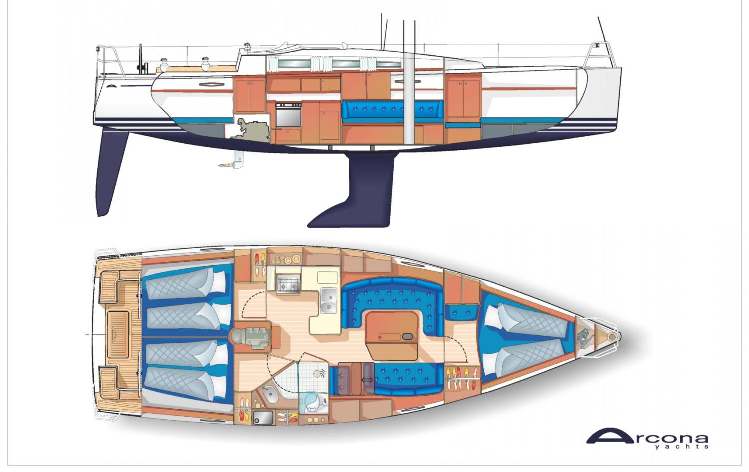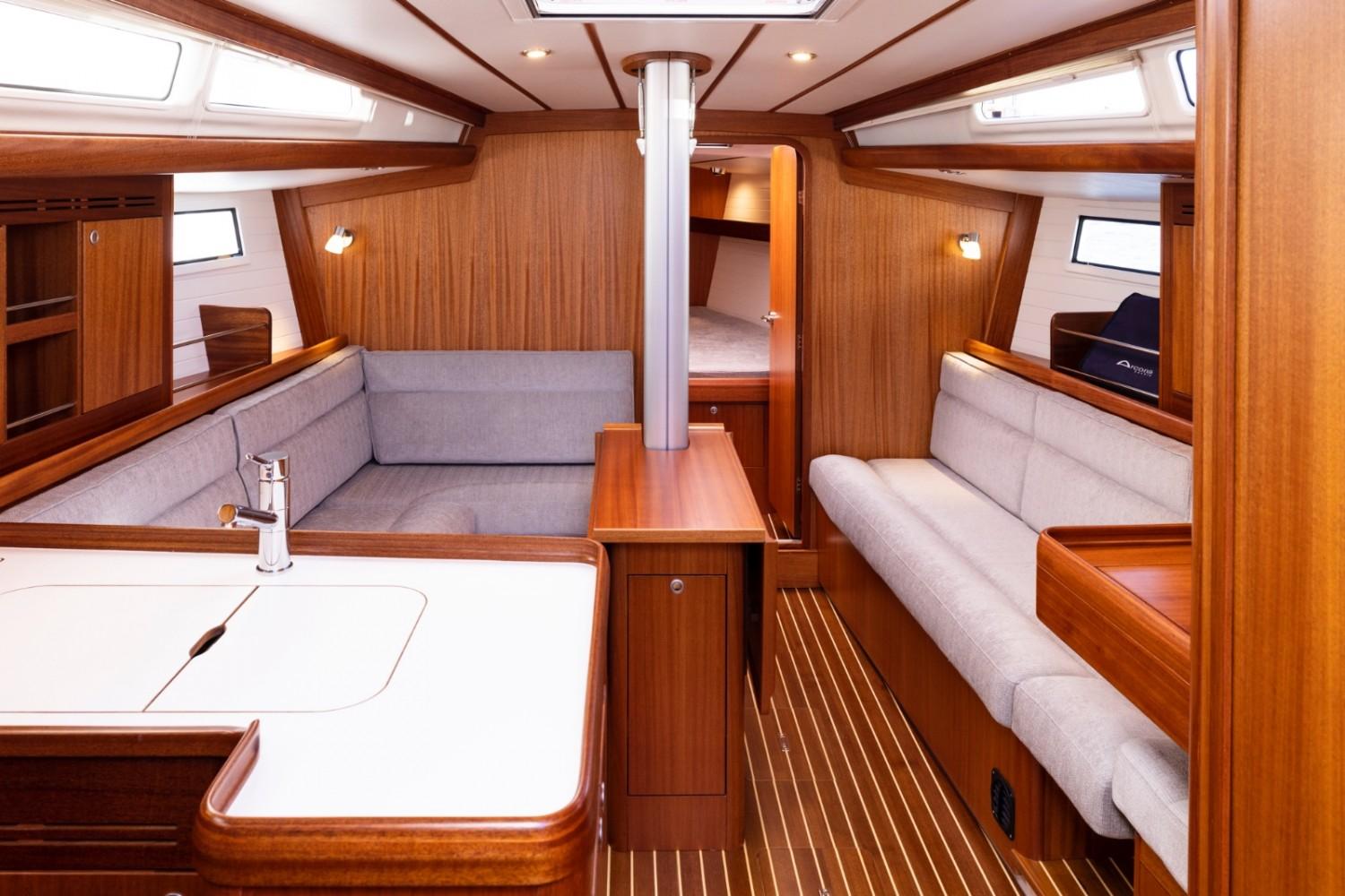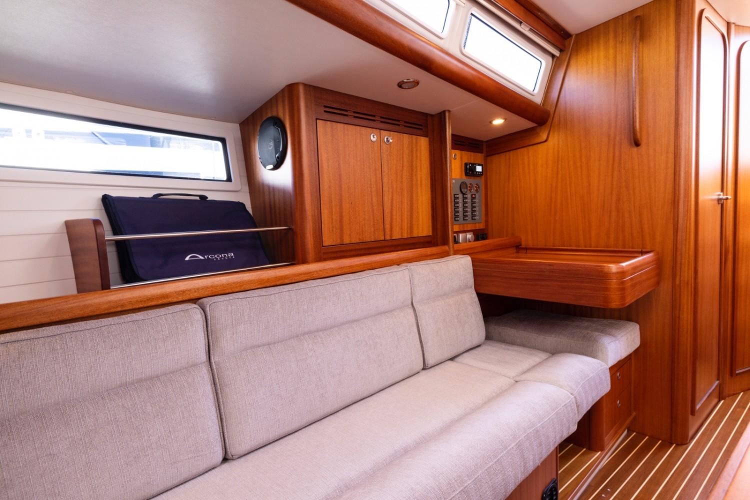 Les intérieurs des yachts Arcona présentent des boiseries de haute qualité et des conceptions de stockage pratiques dans des endroits intelligents. Le salon généreux a été soigneusement pensé pour des fins de divertissement optimales. Prenant la totalité du faisceau de 3,8 m du yacht, il y a beaucoup d'espace autour de la table du salon et elle dispose d'une cuisine spacieuse. L'Arcona 385 dispose de trois cabines en standard, mais l'option de deux cabines avec douche séparée est également disponible.