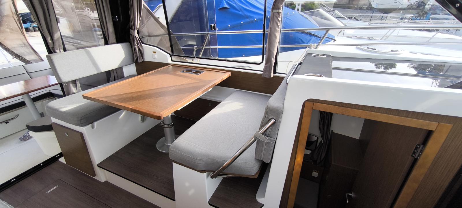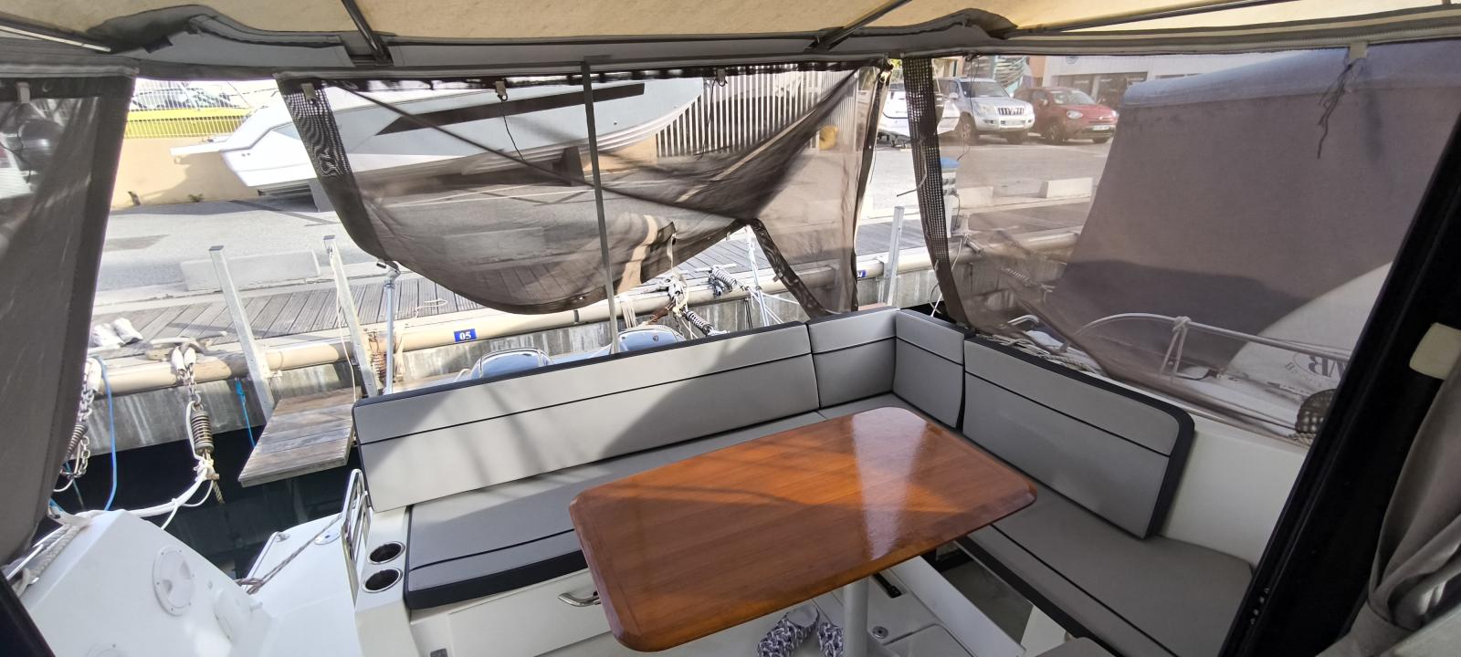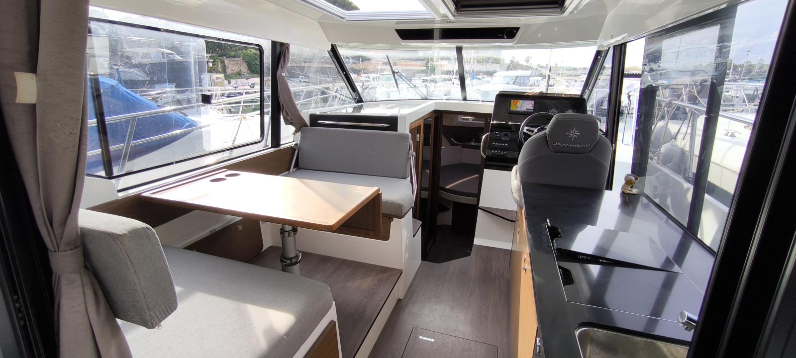 Cuisine entièrement équipée, salon convertible, espace de vie extérieur avec un grand cockpit.